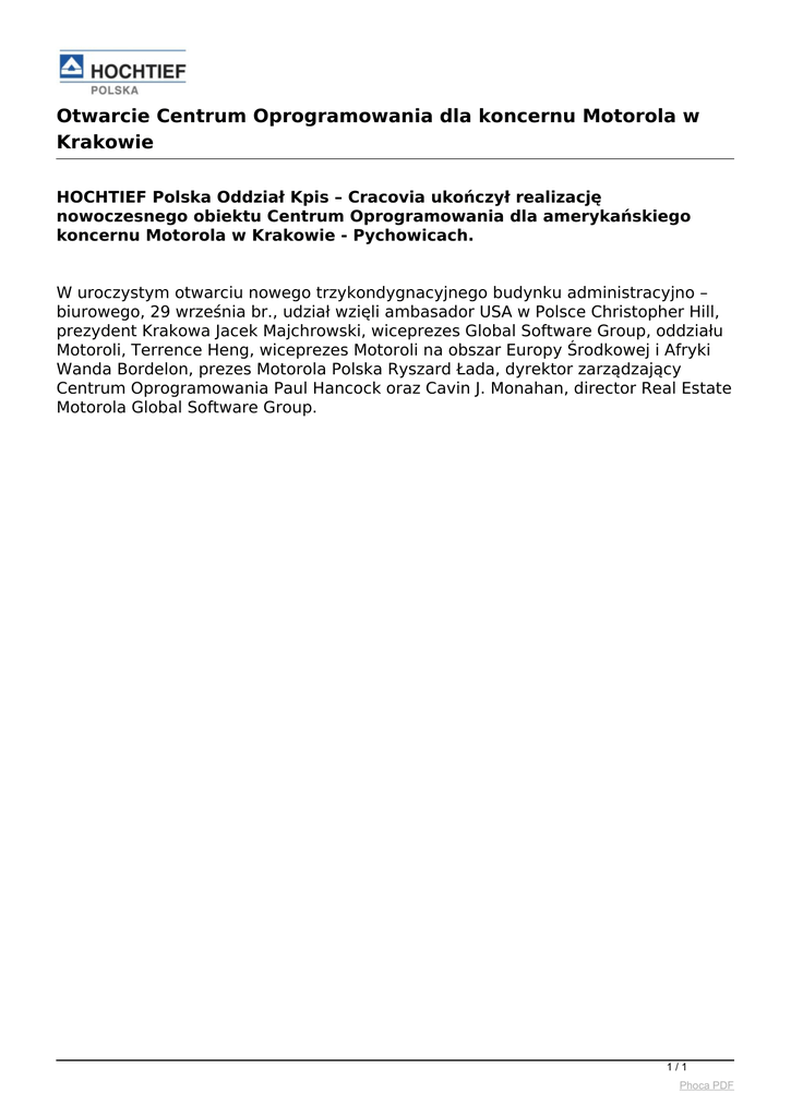 Otwarcie Centrum Oprogramowania dla koncernu Motorola w Krakowie HOCHTIEF Polska Oddział Kpis – Cracovia ukończył realizację nowoczesnego obiektu Centrum Oprogramowania dla amerykańskiego koncernu Motorola w Krakowie - Pychowicach. W uroczystym otwarciu nowego trzykondygnacyjnego budynku administracyjno – biurowego, 29 września br., udział wzięli ambasador USA w Polsce Christopher Hill, prezydent Krakowa Jacek Majchrowski, wiceprezes Global Software Group, oddziału Motoroli, Terrence Heng, wiceprezes Motoroli na obszar Europy Środkowej i Afryki Wanda Bordelon, prezes Motorola Polska Ryszard Łada, dyrektor zarządzający Centrum Oprogramowania Paul Hancock oraz Cavin J. Monahan, director Real Estate Motorola Global Software Group. 1/1 Phoca PDF Powered by TCPDF (www.tcpdf.org)