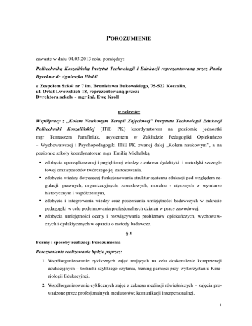 POROZUMIENIE zawarte w dniu 04.03.2013 roku pomiędzy: Politechniką Koszalińską Instytut Technologii i Edukacji reprezentowaną przez Panią Dyrektor dr Agnieszka Hłobił a Zespołem Szkół nr 7 im. Bronisława Bukowskiego, 75-522 Koszalin, ul. Orląt Lwowskich 18, reprezentowaną przez: Dyrektora szkoły - mgr inż. Ewę Kroll w zakresie: Współpracy z „Kołem Naukowym Terapii Zajęciowej” Instytutu Technologii Edukacji Politechniki mgr Koszalińskiej Tomaszem (ITiE Parafiniuk, PK) koordynatorem asystentem w Zakładzie na poziomie Pedagogiki jednostki Opiekuńczo – Wychowawczej i Psychopedagogiki ITiE PK zwanej dalej „Kołem naukowym”, a na poziomie szkoły koordynatorem mgr Emilią Michalską zdobycia uporządkowanej i pogłębionej wiedzy z zakresu dydaktyki i metodyki szczegółowej oraz sposobów twórczego jej zastosowania. zdobycia wiedzy dotyczącej funkcjonowania struktur systemu edukacji pod względem regulacji: prawnych, organizacyjnych, zawodowych, moralno - etycznych w wymiarze historycznym i współczesnym, zdobycia i integrowania wiedzy oraz poszerzania umiejętności badawczych w zakresie pedagogiki w celu podejmowania profesjonalnych działań w pracy zawodowej, zdobycia umiejętności oceny i rozwiązywania problemów opiekuńczych, wychowawczych i dydaktycznych w oparciu o metody badawcze. §1 Formy i sposoby realizacji Porozumienia Porozumienie realizowanie będzie poprzez: 1. Współorganizowanie cyklicznych zajęć mających na celu doskonalenie kompetencji edukacyjnych – techniki szybkiego czytania, trening pamięci przy wykorzystaniu Kinezjologii Edukacyjnej. 2. Współorganizowanie cyklicznych zajęć z zakresu mediacji rówieśniczych – zajęcia prowadzone przez profesjonalnych mediatorów; komunikacji interpersonalnej. 1 3. Organizację i realizację praktyk dla tych studentów kierunków pedagogika którzy swym zaangażowaniem i zainteresowaniem edukacją wyróżniają się w sposób szczególny (do 5 praktyk w roku, przy współpracy z kołem naukowym Terapia Zajęciowa i kierownikiem praktyk ITiE PK). 4. Program, zasady organizacji praktyk studenckich realizowane będzie na podstawie osobnych umów, porozumień zawieranych dla każdej praktyki indywidualnie. 2