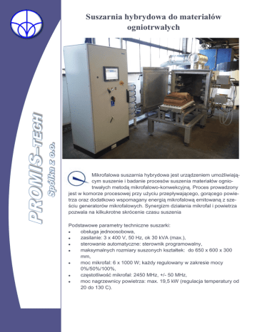 Suszarnia hybrydowa do materiałów ogniotrwałych Mikrofalowa suszarnia hybrydowa jest urządzeniem umożliwiającym suszenie i badanie procesów suszenia materiałów ogniotrwałych metodą mikrofalowo-konwekcyjną. Proces prowadzony jest w komorze procesowej przy użyciu przepływającego, gorącego powietrza oraz dodatkowo wspomagany energią mikrofalową emitowaną z sześciu generatorów mikrofalowych. Synergizm działania mikrofal i powietrza pozwala na kilkukrotne skrócenie czasu suszenia Podstawowe parametry techniczne suszarki: obsługa jednoosobowa, zasilanie: 3 x 400 V, 50 Hz, ok 30 kVA (max.), sterowanie automatyczne: sterownik programowalny, maksymalnych rozmiary suszonych kształtek: do 650 x 600 x 300 mm, moc mikrofal: 6 x 1000 W; każdy regulowany w zakresie mocy 0%/50%/100%, częstotliwość mikrofal: 2450 MHz, +/- 50 MHz, moc nagrzewnicy powietrza: max. 19,5 kW (regulacja temperatury od 20 do 130 C).