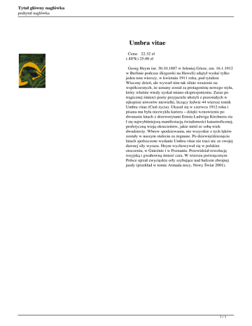 Tytuł główny nagłówka podtytuł nagłówka Umbra vitae Cena: 22.32 zł (-11%) 25.00 zł Georg Heym (ur. 30.10.1887 w Jeleniej Górze, zm. 16.1.1912 w Berlinie podczas ślizgawki na Haweli) zdążył wydać tylko jeden tom wierszy, w kwietniu 1911 roku, pod tytułem Wieczny dzień, ale wywarł nim tak silnie wrażenie na współczesnych, że uznany został za protagonistę nowego stylu, który właśnie wtedy zyskał miano ekspresjonizmu. Zaraz po tragicznej śmierci poety przyjaciele ułożyli z pozostałych w rękopisie utworów niewielki, liczący ledwie 44 wiersze tomik Umbra vitae (Cień życia). Ukazał się w czerwcu 1912 roku i pisana mu była niezwykła kariera – dzięki wznowieniu po dwunastu latach z drzeworytami Ernsta Ludwiga Kirchnera sta ł się najwybitniejszą manifestacją świadomości katastroficznej, profetyczną wizją okrucieństw, jakie niósł ze sobą wiek dwudziesty. Wbrew spodziewaniu, nie wszystkie z tych lęków zostały w naszym stuleciu za żegnane. Po dziewięćdziesięciu latach spolszczone wydanie Umbra vitae nie traci nic ze swojej dawnej siły wyrazu. Heym wychowywał się w polskim otoczeniu, w Gnieźnie i w Poznaniu. Przewidział rewolucję rosyjską i gwałtowną śmierć cara. W wierszu poświęconym Polsce ujrzał zwycięskie orły szybujące nad hufcem zbrojnej jazdy (przekład w tomie Armada nocy, Nowy Świat 2001). 1/1 Powered by TCPDF (www.tcpdf.org)