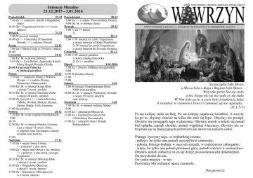Intencje Mszalne 21.12.2015 - 3.01.2016 Poniedziałek 21.12 7.00 Za ++ rodziców Adolfa i Magdalenę Jojko 18.00 Za + Eugeniusza Oczko w 1 roczn. śmierci Wtorek 22.12 7.00 W pewnej intencji 18.00 Za ++ Franciszkę i Franciszka Nowak, ++ z rodziny Nowak Środa 23.12 7.00 Za + Marię Czaja w 24 roczn. śmierci 18.00 Czwartek 24.12 7.00 Dz. bł. w pewnej intencji 8.30 Za ++ Ewę Stebel, Agnieszkę Krzyk, Marię Rygiel, Rozalię Glinka 24.00 Uroczysta Pasterka w intencji parafian Piątek 25.12 7.30 Za ++ rodziców Marię i Wiktora Wrona ++ z rodzin Wrona, Pietraszko, Matuszyński 9.00 Dz. bł. w intencji Kingi Blok z okazji 7 roczn. urodzin 10.30 Dz. bł. w intencji Damiana Zuber z okazji 20 roczn. urodzin 12.00 Za żywych i ++ z rodzin Kwaśny Cebula, Wróbel, Blokisz, Resner, Steuer, Hajda, Loth, Gromala 17.00 Za parafian Sobota 26.12 7.30 Dz. bł. w int. rodziny Seredyńskich 9.00 10.30 12.00 Dz. bł. w intencji Renaty i Ernesta Lata z okazji 55 roczn. ślubu, w intencji syna Szczepana z okazji urodzin oraz rodziny 17.00 Niedziela 27.12 7.30 Za + męża Gintra Lubinę, ++ rodziców z obu stron 9.00 Za + męża Jana Orwat z ok. urodzin, ++ z pokrew. z obu stron, szwagra Zygmunta 10.30 Dz. bł. w intencji Mikołaja Blok z okazji 1 roczn. urodzin 12.00 Za + Bogusławę Okarmus z okazji 1 roczn. śmierci 17.00 Za + Stanisława Mikołajczyka w 3 roczn. śmierci Poniedziałek 28.12 7.00 Za ++ z rodzin Piotrowskich, Doniec 9.00 Dz. bł. w intencji dzieci Wtorek 29.12 7.00 1) Za ++ dzieci 2) Środa 30.12 7.00 1) W intencji ks. prob. Eugeniusza z okazji imienin od Rady Parafialnej 2) W intencji ks. prob. Eugeniusza z okazji imienin od Żywego Rózańca Czwartek 31.12 17.00 1) W intencji parafian z okazji zakończenia roku 2) Za ++ parafian Piątek 1.01.2016 7.30 Za + Józefa i Elżbietę Seredyńskich 9.00 10.30 W pewnej intencji 12.00 17.00 Sobota 2.01 7.00 W intencji Niepokalanego Serca NMP oraz parafian 18.00 Dz. bł. w intencji Walentyny Oswald z okazji 85 roczn. urodzin oraz rodziny Niedziela 3.01 7.30 Dz. bł. w intencji rodziny Mazur 9.00 10.30 Za + Antoniego Błaszczyk 12.00 Za + Kazimierza Gruszczak i Stanisławę Kaczmarską 17.00 Za + rodziców Jana i Wandę Pałaszyńskich WAWRZYN www.wawrzyniec-chorzow.katowice.opoka.org.pl DWUTYGODNIK PARAFII p.w. ŚWIĘTEGO WAWRZYŃCA W CHORZOWIE 362/2015 Na początku było Słowo, a Słowo było u Boga i Bogiem było Słowo... Wszystko przez Nie się stało, a bez Niego nic się nie stało co się stało. W Nim było życie, a życie było światłością ludzi. A światłość w ciemności świeci i ciemność jej nie ogarnęła... (J1,1.3-5) Po raz kolejny rodzi się Bóg. Po raz kolejny zapala się światłość. A wszystko po to, abyśmy chociaż na kilka dni stali się lepsi. Obyśmy nie posnęli. Obyśmy nie przegapili tego wydarzenia. Obyśmy umieli wznieść się ponad biel opłatka, zapach choinki, nastrój wigilijnej wieczerzy. Obyśmy nie zatrzymali się na tradycyjnych potrawach ani nawet na samych siebie. Dlatego życzymy tego, co najbardziej istotne: - miłości, bo tylko ona potrafi uszczęśliwić człowieka; - pokoju, którego brakuje w naszych sercach, w codziennym zabieganiu; - wiary, bo tylko ona potrafi przenosić góry, potrafi wierzyć w niemożliwe. Obyśmy umieli zobaczyć to co się dzieje poza kolorowymi dekoracjami. On przychodzi do nas. On szuka miejsca - w nas. Pozwólmy Mu rozjaśnić naszą ciemność. Duszpasterze Papieskie intencje Apostolstwa Modlitwy na miesiąc grudzień: Intencja ogólna: Abyśmy wszyscy mogli doświadczyć miłosierdzia Boga, który wciąż niestrudzenie nam przebacza. Intencja misyjna: Aby rodziny, zwłaszcza te, które cierpią, odnalazły w narodzinach Jezusa znak nadziei. OGŁOSZENIA DUSZPASTERSKIE W niedzielę o godz. 10.10 Koronka do Miłosierdzia Bożego prowadzona przez Dzieci Maryi, o godz. 16.30 nabożeństwo popołudniowe. Codziennie przed poranną Mszą św. jest odmawiany różaniec św. w intencjach Kościoła We wtorek o godz. 17.40 nabożeństwo do Matki Boskiej Nieustającej Pomocy. W czwartek o godz. o godz. 17.30 wystawienie najświętszego sakramentu zakończone Koronką do Miłosierdzia Bożego. W sobotę o godz. 17.30 różaniec św. oraz okazja do spowiedzi św. W adwencie zapraszamy dzieci, młodzież i dorosłych na Msze św. roratnie. Roraty będą codziennie od poniedziałku do środy. Małe dzieci zapraszamy lampionami. Również o godz. 7.00 będą Msze św. roratnie dla dorosłych, prosimy na tę Msze św. przynieść świece z okapnikami. W niedzielę (20.12) obchodzimy IV Niedzielę Adwentu. Kolekta w tym dniu będzie przeznaczona na potrzeby naszej parafii. W czwartek (24.12) przypada wigilia Bożego Narodzenia. Msze św. będą odprawione o godz. 7.00, 8.30 – dla uczestników rorat i godz. 24.00 – uroczysta Msza św. pasterska w intencji parafian. Kolekta z Pasterki będzie przeznaczona na Fundusz Ochrony Życia. O godz. 23.30 zapraszamy na czuwanie modlitewne. W Piątek (25.12) przypada uroczystość Bożego Narodzenia, Msze św. będą odprawione tak jak w każdą niedzielę: 7.30; 9.00; 10.30; 12.00 i 17.00, o godz. 16.30 zapraszamy na nieszpory świąteczne przy naszej stajence. Kolekta jest kolektą parafialną. W sobotę (26.12) obchodzimy święto św. Szczepana. Msze św. będą odprawione tak jak w każdą niedzielę, o godz. 16.30 nabożeństwo kolędowe przy stajence. Kolekta w tym dniu będzie przeznaczona na Wydział Teologiczny Uniwersytetu Śląskiego. W niedzielę (27.12) przypada święto Świętej Rodziny Jezusa, Maryi i Józefa. Kolekta będzie przeznaczona jest na potrzeby naszej parafii. W okresie kolędowym (do 15 stycznia) od poniedziałku do piątku z powodu kolędy nie będzie Mszy św. wieczornych o godz. 18.00 oraz Mszy św. szkolnej, nie będzie także wieczornych nabożeństw. Również kancelaria parafialna w godzinach popołudniowych będzie nieczynna. W poniedziałek (28.12) przypada święto Św. Młodzianków, o godz. 9.0