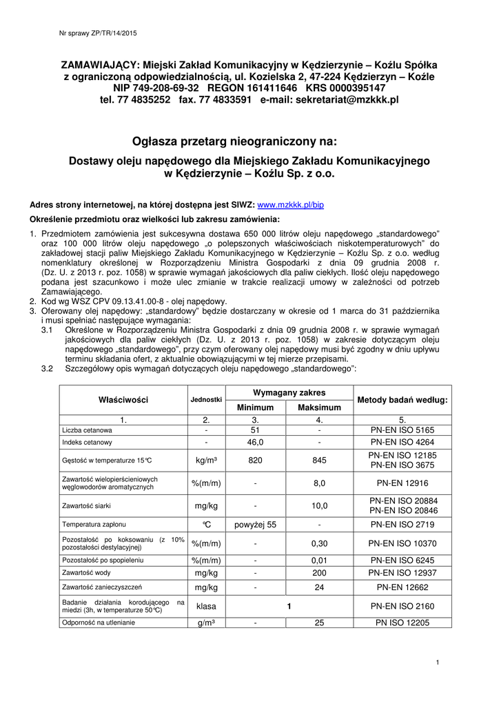 Nr sprawy ZP/TR/14/2015 ZAMAWIAJĄCY: Miejski Zakład Komunikacyjny w Kędzierzynie – Koźlu Spółka z ograniczoną odpowiedzialnością, ul. Kozielska 2, 47-224 Kędzierzyn – Koźle NIP 749-208-69-32 REGON 161411646 KRS 0000395147 tel. 77 4835252 fax. 77 4833591 e-mail: [email protected] Ogłasza przetarg nieograniczony na: Dostawy oleju napędowego dla Miejskiego Zakładu Komunikacyjnego w Kędzierzynie – Koźlu Sp. z o.o. Adres strony internetowej, na której dostępna jest SIWZ: www.mzkkk.pl/bip Określenie przedmiotu oraz wielkości lub zakresu zamówienia: 1. Przedmiotem zamówienia jest sukcesywna dostawa 650 000 litrów oleju napędowego „standardowego” oraz 100 000 litrów oleju napędowego „o polepszonych właściwościach niskotemperaturowych” do zakładowej stacji paliw Miejskiego Zakładu Komunikacyjnego w Kędzierzynie – Koźlu Sp. z o.o. według nomenklatury określonej w Rozporządzeniu Ministra Gospodarki z dnia 09 grudnia 2008 r. (Dz. U. z 2013 r. poz. 1058) w sprawie wymagań jakościowych dla paliw ciekłych. Ilość oleju napędowego podana jest szacunkowo i może ulec zmianie w trakcie realizacji umowy w zależności od potrzeb Zamawiającego. 2. Kod wg WSZ CPV 09.13.41.00-8 - olej napędowy. 3. Oferowany olej napędowy: „standardowy” będzie dostarczany w okresie od 1 marca do 31 października i musi spełniać następujące wymagania: 3.1 Określone w Rozporządzeniu Ministra Gospodarki z dnia 09 grudnia 2008 r. w sprawie wymagań jakościowych dla paliw ciekłych (Dz. U. z 2013 r. poz. 1058) w zakresie dotyczącym oleju napędowego „standardowego”, przy czym oferowany olej napędowy musi być zgodny w dniu upływu terminu składania ofert, z aktualnie obowiązującymi w tej mierze przepisami. 3.2 Szczegółowy opis wymagań dotyczących oleju napędowego „standardowego”: Właściwości Jednostki 1. Wymagany zakres Metody badań według: Minimum Maksimum 2. - 3. 51 46,0 4. - 5. PN-EN ISO 5165 PN-EN ISO 4264 kg/m³ 820 845 PN-EN ISO 12185 PN-EN ISO 3675 %(m/m) - 8,0 PN-EN 12916 mg/kg - 10,0 PN-EN ISO 20884 PN-EN ISO 20846 °C powyżej 55 - PN-EN ISO 2719 Pozostałość po koksowaniu (z 10% pozostałości destylacyjnej) %(m/m) - 0,30 PN-EN ISO 10370 Pozostałość po spopieleniu %(m/m) mg/kg - 0,01 200 PN-EN ISO 6245 PN-EN ISO 12937 mg/kg - 24 PN-EN 12662 Liczba cetanowa Indeks cetanowy Gęstość w temperaturze 15°C Zawartość wielopierścieniowych węglowodorów aromatycznych Zawartość siarki Temperatura zapłonu Zawartość wody Zawartość zanieczyszczeń Badanie działania korodującego miedzi (3h, w temperaturze 50°C) Odporność na utlenianie na 1 klasa g/m³ - PN-EN ISO 2160 25 PN ISO 12205 1 Nr sprawy ZP/TR/14/2015 Smarność, skorygowana średnica śladu zużycia (WS 1,4) w temp. 60°C µm - 460 PN ISO 12156-1 Lepkość w temperaturze 40°C Skład frakcyjny: do 250°C destyluje do 350°C destyluje 95% (V/V) destyluje do temp. Estry metylowe kwasów tłuszczowych (FAME) Temperatura zablokowania zimnego filtru (CFPP) mm²/s 2,00 4,50 PN-EN ISO 3104 %(V/V) %(V/V) <65 360 PN-EN ISO 3405 °C 85 - %(V/V) - 1) 2) °C PN-EN 14078 7,0 1) - 2) 0 -10 PN-EN 116 dla okresu letniego trwającego od dnia 16 kwietnia do dnia 30 września dla okresu przejściowego trwającego od dnia 1 marca do dnia 15 kwietnia oraz od dnia 1 października do dnia 31 października 3.3 Olej napędowy „standardowy” musi być czysty mikrobiologicznie i musi być odporny przez cały rok na ewentualne skażenia mikrobiologiczne w zbiornikach i instalacjach stacji paliw oraz w autobusach. 3.4 Wszystkie składniki oferowanego i dostarczanego oleju napędowego muszą być kompatybilne w paliwie finalnym. 3.5 Oferowany i dostarczany olej napędowy nie może zawierać etanoli i/lub metanolu. 4. Oferowany olej napędowy: „o polepszonych właściwościach niskotemperaturowych” będzie dostarczany w okresie od 1 listopada do 28 lutego i musi spełniać następujące wymagania: 4.1 Określone w Rozporządzeniu Ministra Gospodarki z dnia 09 grudnia 2008 r. w sprawie wymagań jakościowych dla paliw ciekłych (Dz. U. z 2013 r. poz. 1058) w zakresie dotyczącym oleju napędowego „o polepszonych właściwościach niskotemperaturowych”, przy czym oferowany olej napędowy musi być zgodny w dniu upływu terminu składania ofert, z aktualnie obowiązującymi w tej mierze przepisami. 4.2 Szczegółowy opis wymagań dotyczących oleju napędowego „o polepszonych właściwościach niskotemperaturowych”: Właściwości Jednostki 1. Wymagany zakres Metody badań według: Minimum Maksimum 2. - 3. 51 46,0 4. - 5. PN-EN ISO 5165 PN-EN ISO 4264 kg/m³ 800 840 PN-EN ISO 12185 PN-EN ISO 3675 %(m/m) - 8,0 PN-EN 12916 mg/kg - 10,0 PN-EN ISO 20884 PN-EN ISO 20846 °C powyżej 55 - PN-EN ISO 2719 Pozostałość po koksowaniu (z 10% pozostałości destylacyjnej) %(m/m) - 0,30 PN-EN ISO 10370 Pozostałość po spopieleniu %(m/m) mg/kg - 0,01 200 PN-EN ISO 6245 PN-EN ISO 12937 mg/kg - 24 PN-EN 12662 Liczba cetanowa Indeks cetanowy Gęstość w temperaturze 15°C Zawartość wielopierścieniowych węglowodorów aromatycznych Zawartość siarki Temperatura zapłonu Zawartość wody Zawartość zanieczyszczeń Badanie działania korodującego miedzi (3h, w temperaturze 50°C) na Odporność na utlenianie Smarność, skorygowana średnica śladu zużycia (WS 1,4) w temp. 60°C Lepkość w temperaturze 40°C Skład frakcyjny: do 250°C destyluje do 350°C destyluje 1 klasa PN-EN ISO 2160 g/m³ - 25 PN ISO 12205 µm - 460 PN ISO 12156-1 mm²/s 1,5 4,00 PN-EN ISO 3104 %(V/V) %(V/V) - - PN-EN ISO 3405 2 Nr sprawy ZP/TR/14/2015 95% (V/V) destyluje do temp. do 180°C destyluje do 340°C destyluje °C %(V/V) %(V/V) 95 10 - Temperatura mętnienia Temperatura zablokowania zimnego filtru (CFPP) Estry metylowe kwasów tłuszczowych (FAME) °C - -22 PN-ISO 3015 °C - -32 PN-EN 116 %(V/V) - 7,0 PN-EN 14078 4.3 Olej napędowy „o polepszonych właściwościach niskotemperaturowych” musi być cz