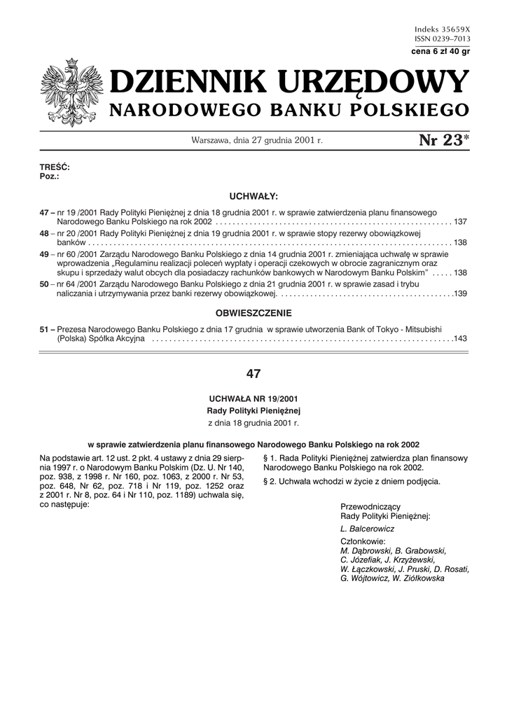 Indeks 35659X ISSN 0239–7013 cena 6 zł 40 gr DZIENNIK URZĘDOWY NARODOWEGO BANKU POLSKIEGO Nr 23* Warszawa, dnia 27 grudnia 2001 r. TREŚĆ: Poz.: UCHWAŁY: 47 – nr 19 /2001 Rady Polityki Pieniężnej z dnia 18 grudnia 2001 r. w sprawie zatwierdzenia planu finansowego Narodowego Banku Polskiego na rok 2002 . . . . . . . . . . . . . . . . . . . . . . . . . . . . . . . . . . . . . . . . . . . . . . . . . . . . . . . . 137 48 – nr 20 /2001 Rady Polityki Pieniężnej z dnia 19 grudnia 2001 r. w sprawie stopy rezerwy obowiązkowej banków . . . . . . . . . . . . . . . . . . . . . . . . . . . . . . . . . . . . . . . . . . . . . . . . . . . . . . . . . . . . . . . . . . . . . . . . . . . . . . . . . . . . . . 138 49 – nr 60 /2001 Zarządu Narodowego Banku Polskiego z dnia 14 grudnia 2001 r. zmieniająca uchwałę w sprawie wprowadzenia „Regulaminu realizacji poleceń wypłaty i operacji czekowych w obrocie zagranicznym oraz skupu i sprzedaży walut obcych dla posiadaczy rachunków bankowych w Narodowym Banku Polskim” . . . . . 138 50 – nr 64 /2001 Zarządu Narodowego Banku Polskiego z dnia 21 grudnia 2001 r. w sprawie zasad i trybu naliczania i utrzymywania przez banki rezerwy obowiązkowej. . . . . . . . . . . . . . . . . . . . . . . . . . . . . . . . . . . . . . . . . . .139 OBWIESZCZENIE 51 – Prezesa Narodowego Banku Polskiego z dnia 17 grudnia w sprawie utworzenia Bank of Tokyo - Mitsubishi (Polska) Spółka Akcyjna . . . . . . . . . . . . . . . . . . . . . . . . . . . . . . . . . . . . . . . . . . . . . . . . . . . . . . . . . . . . . . . . . . . . . .143 47 UCHWAŁA NR 19/2001 Rady Polityki Pieniężnej z dnia 18 grudnia 2001 r. w sprawie zatwierdzenia planu finansowego Narodowego Banku Polskiego na rok 2002 Na podstawie art. 12 ust. 2 pkt. 4 ustawy z dnia 29 sierpnia 1997 r. o Narodowym Banku Polskim (Dz. U. Nr 140, poz. 938, z 1998 r. Nr 160, poz. 1063, z 2000 r. Nr 53, poz. 648, Nr 62, poz. 718 i Nr 119, poz. 1252 oraz z 2001 r. Nr 8, poz. 64 i Nr 110, poz. 1189) uchwala się, co następuje: § 1. Rada Polityki Pieniężnej zatwierdza plan finansowy Narodowego Banku Polskiego na rok 2002. § 2. Uchwała wchodzi w życie z dniem podjęcia. Przewodniczący Rady Polityki Pieniężnej: L. Balcerowicz Członkowie: M. Dąbrowski, B. Grabowski, C. Józefiak, J. Krzyżewski, W. Łączkowski, J. Pruski, D. Rosati, G. Wójtowicz, W. Ziółkowska poz. 48, 49 - 138 - DZIENNIK URZĘDOWY NBP NR 23 48 UCHWAŁA NR 20/2001 Rady Polityki Pieniężnej z dnia 19 grudnia 2001 r. w sprawie stopy rezerwy obowiązkowej banków nej z dnia 21 lipca 1999 r. w sprawie stopy rezerwy obowiązkowej banków (Dz. Urz. NBP Nr 15, poz. 24). 2. Przepisy uchwały, o której mowa w ust. 1, stosuje się do rezerwy obowiązkowej podlegającej odprowadzeniu przed dniem 28 lutego 2002 r. Na podstawie art. 12 ust. 2 pkt 2 ustawy z dnia 29 sierpnia 1997 r. o Narodowym Banku Polskim ( Dz. U. Nr 140, poz. 938, z 1998 r. Nr 160, poz. 1063 oraz z 2000 r. Nr 53, poz. 648, Nr 62, poz. 718 i Nr 119, poz. 1252 oraz z 2001 Nr 8, poz. 64 i Nr 110, poz. 1189) uchwala się, co następuje: § 3. Uchwała wchodzi w życie z dniem 1 stycznia 2002 r. i ma zastosowanie począwszy od rezerwy obowiązkowej podlegającej odprowadzeniu – zgodnie z odrębnymi przepisami – w dniu 28 lutego 2002 r. § 1. Stopa rezerwy obowiązkowej banków od środków pieniężnych, o których mowa w art. 38 ust. 2 ustawy o Narodowym Banku Polskim, wynosi 4,5 %. § 2.1. Traci moc uchwała nr 12/99 Rady Polityki Pienięż- Przewodniczący Rady Polityki Pieniężnej: L. Balcerowicz Członkowie: M. Dąbrowski, B. Grabowski, C. Józefiak, J. Krzyżewski, W. Łączkowski, J. Pruski, D. Rosati, G. Wójtowicz, W. Ziółkowska 49 UCHWAŁA NR 60/2001 Zarządu Narodowego Banku Polskiego z dnia 14 grudnia 2001 r. zmieniająca uchwałę w sprawie wprowadzenia „Regulaminu realizacji poleceń wypłaty i operacji czekowych w obrocie zagranicznym oraz skupu i sprzedaży walut obcych dla posiadaczy rachunków bankowych w Narodowym Banku Polskim” Na podstawie art.109 ust.2 pkt 4 ustawy z dnia 29 sierpnia 1997 r. – Prawo bankowe (Dz. U. Nr 140, poz. 939, z 1998 r. Nr 160, poz. 1063 i Nr 162, poz.1118, z 1999 r. Nr 11, poz.95 i Nr 40, poz.399, z 2000 r. Nr 93, poz.1027, Nr 94, poz.1037, Nr 114, poz.1191, Nr 116, poz.1216, Nr 119, poz.1252 i Nr 122, poz.1316 oraz z 2001 r. Nr 8, poz.64, Nr 100, poz. 1084 i Nr 111, poz.1195) uchwala się, co następuje: § 1. W załączniku do uchwały nr 35/1999 Zarządu Narodowego Banku Polskiego z dnia 29 października 1999 r. w sprawie wprowadzenia „Regulaminu realizacji poleceń wypłaty i operacji czekowych w obrocie zagranicznym oraz skupu i sprzedaży walut obcych dla posiadaczy rachunków bankowych w Narodowym Banku Polskim” (Dz. Urz. NBP Nr 20 poz.34 i z 2001 r. Nr 1 poz.1) wprowadza się następujące zmiany: 1) w § 2 a) skreśla się pkt 9, b) pkt 11 otrzymuje brzmienie: „11) waluta dyspozycji – waluta wskazana przez zleceniodawcę w dyspozycji w celu wypłacenia beneficjentowi.”; 2) w § 16 ust. 2 otrzymuje brzmienie: „2. Czeki, o których mowa w § 13 pkt 1,2 i 5 nie spełniające warunków skupu, o których mowa w ust.1. oraz czeki podróżnicze i czeki z wystawienia niebankowego przyjmowane są w GOWD wyłącznie do inkasa.”; 3) dodaje się § 35 w brzmieniu: „§ 35.1. Do dnia 31 grudnia 2002 r. banknoty i monety, które straciły status prawnego środka płatniczego w państwach członkowskich Unii Europejskiej należących do Unii Gospodarczej i Walutowej, mogą być przedmiotem skupu z tytułu rozliczenia kosztów podróży służbowej z uwzględnieniem przepisów dewizowych oraz z zachowaniem postanowień § 30 pkt 2 i 3. 2. Kupno walut narodowych, o których mowa w ust.1, dokonywane jest z zastosowaniem kursów, o których mowa w art.5 ust.1 ustawy z dnia 25 maja 2001 r. o skutkach wprowadzenia w niektórych państwach członkowskich Unii Europejskiej wspólnej waluty euro. (Dz. U. Nr 63, poz