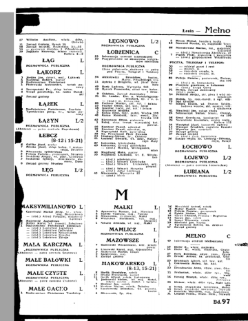 Łasin 27 Wilhelm Anallese, wlaśc. dóbr, Osówko 31 28 14 39 Zarząd Gminny, Rynek 38 Zarząd miejski, Radzyńska 34—88 — gazownia miejska, J. Piłsudskiego Zająkata Ksawery, mistrz rzeżnicki, Hallera 8—9 ŁĄG L ŁĘGNOWO ŁOBŻENICA 53 53 ROZMÓWNICA PUBLICZNA ŁĄKORZ 9 6 9 1 4 2 ŁĄŻEK Nadleśnictwo Państwowe, Szartata Tyszkiewicz Jerzy, nr., tartak pa rowy ŁĄŹYN L/2 ROZMÓWNICA PUBLICZNA (Abonenci — patrz centrala Rzęczkowo) ŁEBCZ (8-12 i 15-21) 1 i 6 7 9 5 4 3 8 Oaffke Józef, szofer Miszke Józef, sklep kolon. I restau racja, Strzelno Mleczarnia spółdzielcza Policja Państw., posterunek, Strzelno Szukalskl Alojzy, w l . dóbr, Łyśnlewo Szukalskl Ignacy, dzierżawca do meny. Dana Zarząd gminny Strzelno ŁĘG L/2 ROZMOWNICA PUBLICZNA 54 11 49 12 9 51 80 25 18 3 5 48 62 1 20 22 8 38 23 21 87 65 40 50 45 2 10 88 C Informacja centrali telefonicznej Przyjmowanie od abonentów telegra* mów telefonem ROZMÓWNICA PUBLICZNA (Inne połączenia służbowe — patrz pod Poczta, Telegraf I Telefon) L Jordan Jan, dzierż, maj., Łąkorek Kuzimskl Robert, kupiec Nadleśnictwo Państwowe Piotrowski Aleksander, tartak pa rowy Szczepański Pr., sklep kolon. Urząd parafialny, ks. radca Dunajski Zarząd gminny L/2 ROZMÓWNICA PUBLICZNA Aleksiewicz Bronisław, kupiec, Marsz. Piłsudskiego 173 Apteka 1 Droglera, w l . Józef Reinholz Bank Ludowy, Wyrzyska 246 Byczek Franciszka, skład tow. kolon. I żelaz. Chlebno, Zarząd dominialny Dt. Landw. Eln. u. Verkaufsgenossenchaft, Sp. z o. o. — (dod.) m. kierownika Fechner Walter, skł. kol. 1 żelaza Fischer Otton, skł. kol., hotel Oaedtke Lucie, skl. kol. 1 żelaza Oazownia miejska Karasi Emil, labr. mebli, Wodna 189 Kara u Reinhold, fabr. mebli, Zło towska 118 Kletzmann Otton, piekarnia Kolej, eksp. towar, wyrzyskiej kol. powiat. Konitzer Paweł, adwokat Konitzer Paweł, adwokat, m. Kopczyński Kurt, auto-taksa Ks. Prowincjał Piotr Zawada Limburg-StJrum, hr., Chlebno Loehrke Edward, w l . dóbr, Koście rzyn Mały Łobzonka, leśniczówka Łobzonka, Zarząd dominialny — (dod.) Radtke, Witrogoszcz, młyn Magdlung Maks, pastor Majętność Liszkowo, wł. E. Witzleben — (dod.) administrator — (dod.) folwark Llszkówko — (dod.J folwark Llszkówko, urz. gospod. — (dod.) folwark Marynka — (dod.) pałac Liszkowo Mleczarnia, Wyrzyska 22 — (dod.) biuro 7 Mełno Moses Michał, handlarz bydła Naworol Roman, dr, majętność Trzeboń Nowakowski Marian, inż., majętność Szczerbin — (dod.) Nowakowska Zdzisława, dr Piątek Piotr, drukarnia I księgarnia — (dod.) gospodarstwo Wlktorówko POCZTA, TELEORAF I TELEFON: 53 — oddział gazet i rent 52 — monter, m. 59 — naczelnik urzędu, b. 58 — naczelnik urzędu, m. 82 99 31 14 35 79 47 41 24 28 26 34 13 17 33 37 56 Policja Państw., posterunek. Złotow ska 120 — (dod.) m. komendanta Przejście graniczne w Łobzonce — (dod.) Urząd Celny Rataje, Zarząd dominialny (dod.) pałac Reilińskl Alojzy, skl. piwa I wód mi neralnych Rolnik, Sp. roln.-handl. z ogr. odp. Sąd Orodzki Schütz Bracia, wł. Brunon Sctiiltz, budowa wozów, skł. maszyn roln. i siodlarnia Sławiński Jan zakup zboża Sobieszczyk Śtelan, lekarz, Chmiel na 190 Straż Graniczna, komisariat Szczeciński Kazimierz, mistrz rzeźn., Hallera 173 Westphal Józef, komornik sądowy Wrenger Friedrich, cegielnia Kruszki Wyrwlcz Jan, notariusz Zarząd gminny Zarząd miejski — (dod.) gazb. burmistrza Zarząd młyna hr. Llmburg - Stlruma, młyn, Rataje ŁOCHOWO L ROZMÓWNICA PUBLICZNA ŁOJEWO L/2 ROZMÓWNICA PUBLICZNA (Abonenci — patrz centrala Inowrocław) LUBIANA L/2 ROZMÓWNICA PUBLICZNA M AKSYMILIANOWO 2 1 L Czarniecki Michał Jerzy, hr., wlaśc, maj. Borzenkowo . — (dod.) Alfred Palędzki, majętność I Łącznica Majętność Augustowo MÖller Karol, wł. ziemski, żołędowo Nadieśnlctwo Państwowe żołędowo — (dod ) Leśnictwo Jagodowo — (dod) Leśnictwo jastrzębie — (dod.) Leśnictwo Nowymostek — (dod.) Leśnictwo Strzelce — (dod.) Leśnictwo Zdroje MAŁA KARCZMA L 1 MAMLICZ MAZOWSZE 7 L MAŁE CZYSTE L MAŁE GACKO 1 L Nadleśnictwo Państwowe Trzebclny L L Gumowski Włodzimierz, kler. szkoły powsz. Lissowskl Karol, maj. KIjaszkowo Sadkowski Michał, ksiądz śwlętosław, maj. Zarząd gminny MĄKOWARSKO L (8-13,15-21) ROZMÓWNICA PUBLICZNA ROZMÓWNICA PUBLICZNA Abonenci — patrz centrala Chełmno) L Apanowłcz Roman, inż., Niewierz Dębski Tadeusz, maj., Pasieki Mleczarnia, Grabowski, Małki Witzleben Hart mann, von, maj., Słoszewy Schultz Amanda, wł. maj., Małki 16 5 15 6 18 14 9 10 3 17 Mroziriski Antoni, rolnik Muller Rudolf, rolnik Policja Państw., posterunek Rybka Stefan, rolnik Szews Edmund, Pruszcz - Baglenica Szews Jan, rolnik Szmyt Wincenty, rolnik Śliwiński Jan, kupiec Tyrakowski Antoni, ks. dziekan Zarząd gminny 49 Informacja centrali telefonicznej 15 14 Bleler E., wlaśc. majoratu Bleler E., wlaśc. majoratu, Grutafolw. Bork Bolesław, obyw. ziem., Gruta Brockl Antoni, ks. proboszcz, Oko- ROZMÓWNICA PUBLICZNA 6 3 5 2 .ROZMÓWNICA PUBLICZNA (Abonenci — patrz centrala Smętowo) MAŁE BAŁÓWKI MAŁKI 3 2 6 6 8 12 11 1 7 13 2 4 BarUk Bronisław, rolnik Bryckl Franciszek, kupiec Gerth Alfred, rolnik, Lakomowo Jankowski Stefan, wl. maj. Motyl, młyna wodno - motor. I tartaku Kentzer Jan, rolnik Kentzer Stefan, rolnik, Dzledno Łuczkowski Bolesław, wł. ziemski, Luciin Mleczarnia, Sp. Akc. MEŁNO 27 24 25 1 7 23 11 16 30 6 18 9 31 ntn Brombach Albert, skl. tow. kol. Cukrownia Melno, Sp. Akc. — Drozdowska Anna, obyw. ziem. Okonin Frobenlus, wlaśc. dóbr r y c , Nicwałd Hennlg Henryk, wlaśc. dóbr r y c , " Zakrzewo Kletner, właśc dóbr r y c , Małe Lniska Kolej, ekspedycja towarowa, Mętno Kolej, espedycja towarowa, Nlcwałd Kulwlckl Hieronim, maj. Szumiłowo Lledtke Franc, wlaśc ziem., Nicwałd Bd.97