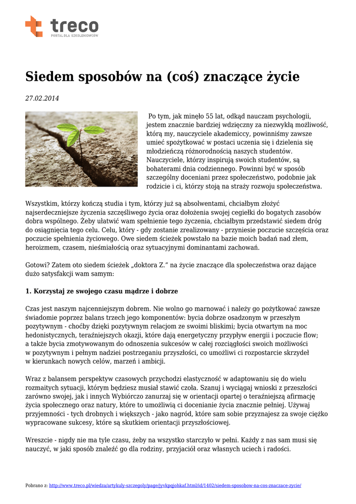 Siedem sposobów na (coś) znaczące życie 27.02.2014 Po tym, jak minęło 55 lat, odkąd nauczam psychologii, jestem znacznie bardziej wdzięczny za niezwykłą możliwość, którą my, nauczyciele akademiccy, powinniśmy zawsze umieć spożytkować w postaci uczenia się i dzielenia się młodzieńczą różnorodnością naszych studentów. Nauczyciele, którzy inspirują swoich studentów, są bohaterami dnia codziennego. Powinni być w sposób szczególny doceniani przez społeczeństwo, podobnie jak rodzicie i ci, którzy stoją na straży rozwoju społeczeństwa. Wszystkim, którzy kończą studia i tym, którzy już są absolwentami, chciałbym złożyć najserdeczniejsze życzenia szczęśliwego życia oraz dołożenia swojej cegiełki do bogatych zasobów dobra wspólnego. Żeby ułatwić wam spełnienie tego życzenia, chciałbym przedstawić siedem dróg do osiągnięcia tego celu. Celu, który - gdy zostanie zrealizowany - przyniesie poczucie szczęścia oraz poczucie spełnienia życiowego. Owe siedem ścieżek powstało na bazie moich badań nad złem, heroizmem, czasem, nieśmiałością oraz sytuacyjnymi dominantami zachowań. Gotowi? Zatem oto siedem ścieżek „doktora Z.” na życie znaczące dla społeczeństwa oraz dające dużo satysfakcji wam samym: 1. Korzystaj ze swojego czasu mądrze i dobrze Czas jest naszym najcenniejszym dobrem. Nie wolno go marnować i należy go pożytkować zawsze świadomie poprzez balans trzech jego komponentów: bycia dobrze osadzonym w przeszłym pozytywnym - choćby dzięki pozytywnym relacjom ze swoimi bliskimi; bycia otwartym na moc hedonistycznych, teraźniejszych okazji, które dają energetyczny przypływ energii i poczucie flow; a także bycia zmotywowanym do odnoszenia sukcesów w całej rozciągłości swoich możliwości w pozytywnym i pełnym nadziei postrzeganiu przyszłości, co umożliwi ci rozpostarcie skrzydeł w kierunkach nowych celów, marzeń i ambicji. Wraz z balansem perspektyw czasowych przychodzi elastyczność w adaptowaniu się do wielu rozmaitych sytuacji, którym będziesz musiał stawić czoła. Szanuj i wyciągaj wnioski z przeszłości zarówno swojej, jak i innych Wybiórczo zanurzaj się w orientacji opartej o teraźniejszą afirmację życia społecznego oraz natury, które to umożliwią ci docenianie życia znacznie pełniej. Używaj przyjemności - tych drobnych i większych - jako nagród, które sam sobie przyznajesz za swoje ciężko wypracowane sukcesy, które są skutkiem orientacji przyszłościowej. Wreszcie - nigdy nie ma tyle czasu, żeby na wszystko starczyło w pełni. Każdy z nas sam musi się nauczyć, w jaki sposób znaleźć go dla rodziny, przyjaciół oraz własnych uciech i radości. Pobrano z: http://www.treco.pl/wiedza/artykuly-szczegoly/page/jyvkpqjohkaf.html/id/1402/siedem-sposobow-na-cos-znaczace-zycie/ 2. Pokochaj rozwój i uczyń go częścią całego życia Znaczącą część życia spędziliście w pozycji wysoce uprzywilejowanej. Zwolnieni od licznych społecznych obowiązków w imię skupienia się na myśleniu, nauce, kwestionowaniu rzeczywistości oraz tworzeniu. Nadszedł czas, żeby bardziej refleksyjnie docenić ten prezent. Najlepiej zrobicie to, będąc studentami własnego życia do ostatniego tchnienia. Jeśli tak będziecie postępować, to w „życiu 2.0” nadacie sens swojej wspólnocie, społeczeństwu, państwu - znacznie bardziej i w najlepszy możliwy sposób, w jaki będziecie potrafili. Dla mnie trwająca radość z bycia kimś w rodzaju podstarzałego studenta oznacza, iż zawsze jestem pełen ciekawości, refleksji, chęci do zadawania pytania „dlaczego”, odkrywania „jak”, stawiania czoła ignorancji, żądania dowodów od wszystkich, którzy są prawdziwymi „wyznawcami” rozmaitych idei. 3. Pielęgnuj swoje pasje Oprócz listy zadań, które musisz wykonać każdego dnia, spróbuj stworzyć kolejną listę, która zawierać będzie jedynie te rzeczy, które naprawdę chcesz robić każdego dnia. Odkryj, co cię pasjonuje tak naprawdę. I nadaj temu priorytet energetyczny oraz poświęć swój czas i uwagę. Gdy to uczynisz, przekonasz się, że obiekty twojej pasji staną się źródłem własnej dumy, szczęścia i zagwarantują, że twoje życie już nigdy nie będzie bezwartościowe. 4. Przekształć nieśmiałość na zaangażowanie Próbuj za każdym razem stawać się gospodarzem własnego życia poprzez zaangażowanie w wybrane relacje społeczne, zamiast stawać się jedynie jego gościem. Tak samo jak wszyscy mamy wybór tego, czy zostać liderem, czy też podążać za innymi, tak podejmujemy decyzje dotyczące tego, czy przyjąć osobę nieśmiałą do swojej grupy, czy raczej bardziej angażującą się w relację. Nieśmiałość to nałożona samemu przez siebie restrykcja, która ogranicza innym dostęp do twojej wewnętrznej siły, pomysłów czy wartości, ponieważ stworzyłeś tę barierę. Często używam takiej oto metafory, że nieśmiałość jest dobrowolnie na siebie nałożonym psychologicznym więzieniem, w którym nie obowiązuje prawo zrzeszania się z innymi ani prawo do zabierania głosu - dwa najbardziej cenione prawa demokracji. Ale to wyłącznie nasze własne myślenie i uczucia powodują ten stan. Nie zaś żadne naturalne prawo natury. Nieoczekiwaną radością z zakończenia studiów jest to, że nikt was jeszcze nie zna. Nikt nie wie, że jesteście nieśmiali, więc macie możliwość ukształtowania wszystkiego od nowa. Czerpcie radość, tańczcie na prywatkach, zadawajcie pytania i dużo się uśmiechajcie. Wasze życie stanie się snem, w który tak ciężko wam jeszcze dzisiaj uwierzyć. Nikt w was nie uwierzy za was. 5. Zmień swój wizerunek Czas zmienić swoje standardowe, wygodne nawyki na wyzwania wobec osobowości, ciekawych przygód, które wyzwolą twoje życie z przewidywalności i rutyny. Od czasu do czasu rozważ naruszenie oczekiwań, które inni formułują wobec ciebie albo