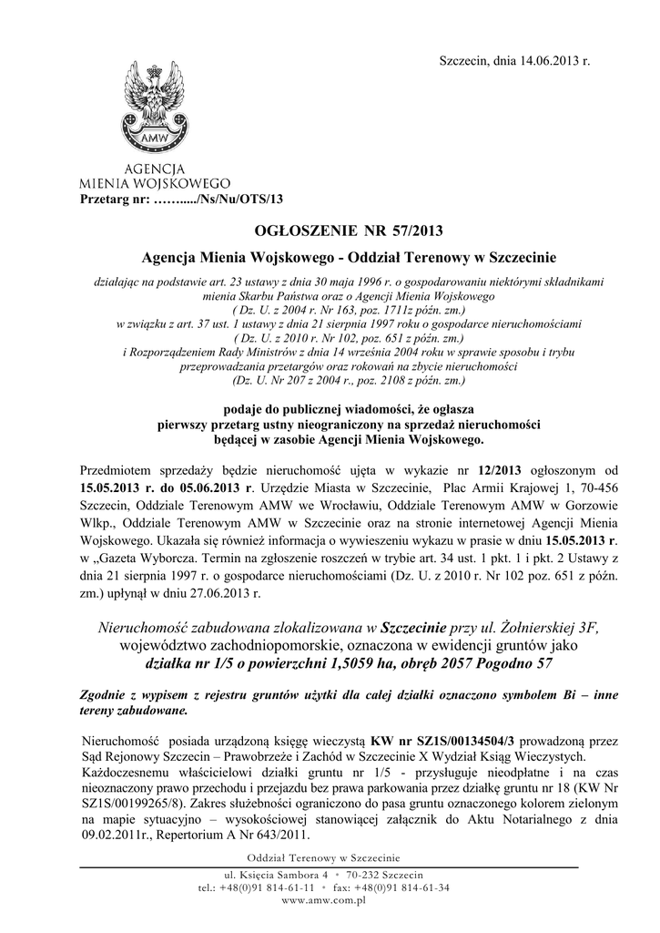 OGŁOSZENIE NR 57/2013 Agencja Mienia Wojskowego