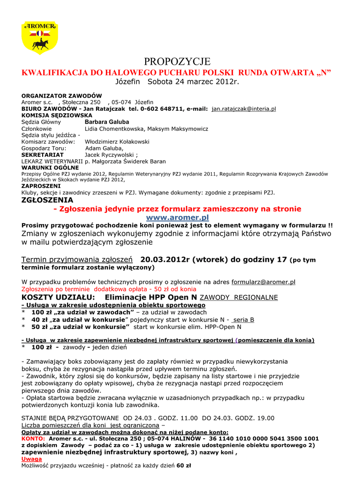 PROPOZYCJE KWALIFIKACJA DO HALOWEGO PUCHARU POLSKI RUNDA OTWARTA „N” Józefin Sobota 24 marzec 2012r. ORGANIZATOR ZAWODÓW Aromer s.c. , Stołeczna 250 , 05-074 Józefin BIURO ZAWODÓW - Jan Ratajczak tel. 0-602 648711, e-mail: [email protected] KOMISJA SĘDZIOWSKA Sędzia Główny Barbara Galuba Członkowie Lidia Chomentkowska, Maksym Maksymowicz Sędzia stylu jeźdźca Komisarz zawodów: Włodzimierz Kołakowski Gospodarz Toru: Adam Galuba, SEKRETARIAT Jacek Ryczywolski ; LEKARZ WETERYNARII p. Małgorzata Świderek Baran WARUNKI OGÓLNE Przepisy Ogólne PZJ wydanie 2012, Regulamin Weterynaryjny PZJ wydanie 2011, Regulamin Rozgrywania Krajowych Zawodów Jeździeckich w Skokach wydanie PZJ 2012, ZAPROSZENI Kluby, sekcje i zawodnicy zrzeszeni w PZJ. Wymagane dokumenty: zgodnie z przepisami PZJ. ZGŁOSZENIA - Zgłoszenia jedynie przez formularz zamieszczony na stronie www.aromer.pl Prosimy przygotować pochodzenie koni ponieważ jest to element wymagany w formularzu !! Zmiany w zgłoszeniach wykonujemy zgodnie z informacjami które otrzymają Państwo w mailu potwierdzającym zgłoszenie Termin przyjmowania zgłoszeń 20.03.2012r (wtorek) do godziny 17 (po tym terminie formularz zostanie wyłączony) W przypadku problemów technicznych prosimy o zgłoszenie na adres [email protected] Zgłoszenia po terminie dodatkowa opłata - 50 zł od konia KOSZTY UDZIAŁU: Eliminacje HPP Open N ZAWODY REGIONALNE - Usługa w zakresie udostępnienia obiektu sportowego * 100 zł „za udział w zawodach” – za udział w zawodach * 40 zł „za udział w konkursie” pojedynczy start w konkursie N - seria B * 50 zł „za udział w konkursie” start w konkursie elim. HPP-Open N - Usługa w zakresie zapewnienie niezbędnej infrastruktury sportowej (pomieszczenie dla konia) * 100 zł - zawody - jeden dzień - Zamawiający boks zobowiązany jest do zapłaty również w przypadku niewykorzystania boksu, chyba że rezygnacja nastąpiła przed upływem terminu zgłoszeń. - Zawodnik, który zgłosi się do konkursów, będzie zapisany na listy startowe i nie przyjedzie jest zobowiązany do opłaty wpisowej, chyba że rezygnacja nastąpi przed rozpoczęciem pierwszego dnia zawodów. - Opłata startowa będzie zwracana wyłącznie w uzasadnionych przypadkach np.: w przypadku potwierdzonych kontuzji konia lub zawodnika. STAJNIE BĘDĄ PRZYGOTOWANE OD 24.03 . GODZ. 11.00 DO 24.03. GODZ. 19.00 Liczba pomieszczeń dla koni jest ograniczona – Opłaty za udział w zawodach można dokonać na niżej podane konto: KONTO: Aromer s.c. - ul. Stołeczna 250 ; 05-074 HALINÓW - 36 1140 1010 0000 5041 3500 1001 z dopiskiem Zawody – podać za co - 1) usługa w zakresie udostępnienie obiektu sportowego 2) zapewnienie niezbędnej infrastruktury sportowej, 3) nazwy koni , Uwaga Możliwość przyjazdu wcześniej - płatność za każdy dzień 60 zł SPRAWY WETERYNARYJNE Lekarz weterynarii Małgorzata Świderek Baran tel. 0-604 557202. Konie muszą posiadać aktualne badania i szczepienia zgodnie z przepisami weterynaryjnymi, bez w/w dokumentów konie nie będą wpuszczone na teren zawodów. Przegląd weterynaryjny na życzenie lekarza wet. przed stajnią WARUNKI TECHNICZNE Place konkursowe – podłoże piach i trociny 30 x 90 m Rozprężalnia – podłoże piaszczyste 26 x 40 m Sprawdzanie dokumentacji i opłaty za udział w biurze zawodów godzinę przed konkursami zawodów. OFEROWANE ŚWIADCZENIA Noclegi prosimy rezerwować we własnym zakresie. Hotele: 1. 2. 3. 4. 5. 6. Villa Park Wesoła **** - ul. 1 Praskiego Pułku 89 ;Wesoła; 22-773 61 30 (6km) Bella Vista *** - ul. Trakt Brzeski , Stara Miłosna ; 22 783 30 51 (4km) Gościniec ** - ul. Stara Miłosna ; 22 773 20 98 (4km) Relaks *** - Wola Ducka ; 22 789 99 30 (12 km) Hotel Amigo ** - Sulejówek , ul Trakt Brzeski 100 ; 22-783 15 36 (2km) Pokoje Gościnne Nina * - Trakt Brzeski 83b ; 22-773 39 80 PROGRAM ZAWODÓW (godziny rozpoczęcia konkursów, w zależności od ilości zgłoszeń) Sobota – 24.03.2012- HPWiM (starty w ramach HZR- seria A przed danym konkursem) Konkurs nr 23 seria B, klasy N , zwykły wys. 120 cm (art. 238.2.1) rozegrany w ramach HZO-B DiM Konkurs nr 24, klasy N, zwykły z rozgrywką , wys. 120 cm (art. 238.2.2) konkurs kwalifikacyjny do HPP runda otwarta N Informacje o orientacyjnych godzinach rozpoczęcia konkursów na stronach www.aromer.pl oraz www.swiatkoni.pl: i innych portalach Konkursy sobotnie: piątek od godz. 19.00 Zawody rozgrywane zgodnie z wyżej wymienionym Regulaminem WMZJ w skokach przez przeszkody oraz przepisami PZJ. Obowiązuje dokumentacja wg regulaminów i przepisów PZJ. - Zmiany na listach startowych możliwe są nie później niż 30 minut przed rozpoczęciem danego konkursu. Po tym terminie obowiązuje opłata manipulacyjna w wysokości min. 20 PLN za każdą zmianę. NAGRODY - Flots dla 25 % uczestników , Puchary dla pierwszej trójki Łączna pula nagród: cała kwota uzyskana ze startowego rozdzielona dla 25 % INFORMACJE RÓŻNE Na terenie zawodów będą obecni: lekarz, lekarz weterynarii Organizator nie ponosi żadnej odpowiedzialności w razie wypadków i zachorowań zawodników, luzaków i koni jak również w przypadku kradzieży, zniszczeń, pożarów i innych zdarzeń losowych. Każda zmiana w stosunku do zgłoszeń ostatecznych oraz na listach startowych będzie możliwa jedynie za zgodą Sędziego Głównego w zależności od możliwości organizacyjnych. Organizator zastrzega sobie prawo zmian w propozycjach. KODEKS POSTĘPOWANIA Z KONIEM Polski Związek Jeździecki oczekuje od wszystkich osób zaangażowanych w sport jeździecki respektowania wydanego przez PZJ Kodeksu Postępowania z Końmi, jak również przestrzegania zasady, że dobro koni jest najważniejsze. Dobro koni musi być zawsze uwzględniane we współzawodnictwie sportowym oraz nie może być podporządkowane celom komercyjnym. Na każdym etapie przygotowań i treningu konia do zawodów jego dobro musi być stawiane na pierwszym miejscu.