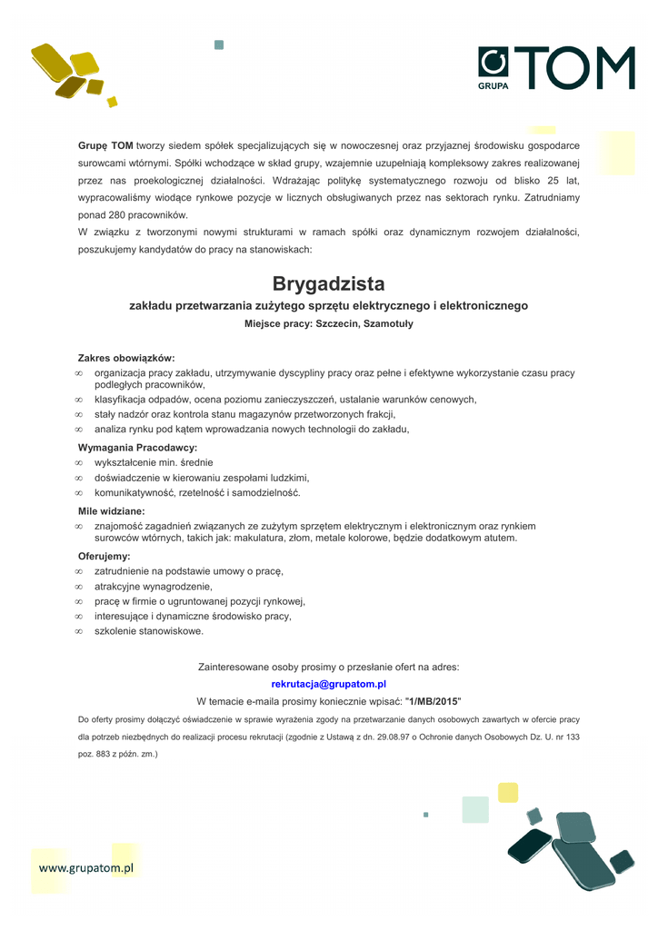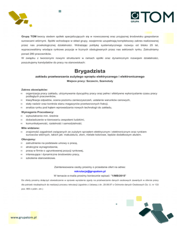 Grupę TOM tworzy siedem spółek specjalizujących się w nowoczesnej oraz przyjaznej środowisku gospodarce surowcami wtórnymi. Spółki wchodzące w skład grupy, wzajemnie uzupełniają kompleksowy zakres realizowanej przez nas proekologicznej działalności. Wdrażając politykę systematycznego rozwoju od blisko 25 lat, wypracowaliśmy wiodące rynkowe pozycje w licznych obsługiwanych przez nas sektorach rynku. Zatrudniamy ponad 280 pracowników. W związku z tworzonymi nowymi strukturami w ramach spółki oraz dynamicznym rozwojem działalności, poszukujemy kandydatów do pracy na stanowiskach: Brygadzista zakładu przetwarzania zużytego sprzętu elektrycznego i elektronicznego Miejsce pracy: Szczecin, Szamotuły Zakres obowiązków: • organizacja pracy zakładu, utrzymywanie dyscypliny pracy oraz pełne i efektywne wykorzystanie czasu pracy podległych pracowników, • • • klasyfikacja odpadów, ocena poziomu zanieczyszczeń, ustalanie warunków cenowych, stały nadzór oraz kontrola stanu magazynów przetworzonych frakcji, analiza rynku pod kątem wprowadzania nowych technologii do zakładu, Wymagania Pracodawcy: • • • wykształcenie min. średnie doświadczenie w kierowaniu zespołami ludzkimi, komunikatywność, rzetelność i samodzielność. Mile widziane: • znajomość zagadnień związanych ze zużytym sprzętem elektrycznym i elektronicznym oraz rynkiem surowców wtórnych, takich jak: makulatura, złom, metale kolorowe, będzie dodatkowym atutem. Oferujemy: • • • • • zatrudnienie na podstawie umowy o pracę, atrakcyjne wynagrodzenie, pracę w firmie o ugruntowanej pozycji rynkowej, interesujące i dynamiczne środowisko pracy, szkolenie stanowiskowe. Zainteresowane osoby prosimy o przesłanie ofert na adres: [email protected] W temacie e-maila prosimy koniecznie wpisać: "1/MB/2015" Do oferty prosimy dołączyć oświadczenie w sprawie wyrażenia zgody na przetwarzanie danych osobowych zawartych w ofercie pracy dla potrzeb niezbędnych do realizacji procesu rekrutacji (zgodnie z Ustawą z dn. 29.08.97 o Ochronie danych Osobowych Dz. U. nr 133 poz. 883 z późn. zm.)