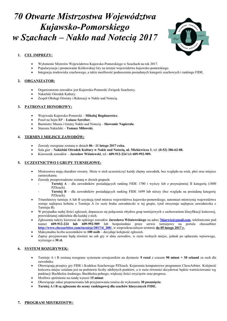 70 Otwarte Mistrzostwa Województwa Kujawsko-Pomorskiego w Szachach – Nakło nad Notecią 2017 1. CEL IMPREZY: 2. ORGANIZATOR: 3. Mistrzostwa mają charakter otwarty. Może w nich uczestniczyć każdy chętny zawodnik, bez względu na wiek, płeć oraz miejsce zamieszkania. Zawody przeprowadzone zostaną w dwóch grupach: Turniej A – dla zawodników posiadających ranking FIDE 1700 i wyższy lub z przynajmniej II kategorią (1800 PZSzach). Turniej B – dla zawodników posiadających ranking FIDE 1699 lub niższy (bez względu na posiadaną kategorię PZSzach). Triumfatorzy turnieju A lub B uzyskują tytuł mistrza województwa kujawsko-pomorskiego, natomiast mistrzynią województwa zostaje najlepsza kobieta z Turnieju A (w razie braku zawodniczki w tej grupie, tytuł otrzymuje najlepsza zawodniczka z Turnieju B). W przypadku małej ilości zgłoszeń, dopuszcza się połączenie obydwu grup turniejowych z zachowaniem klasyfikacji końcowej, przewidzianej oddzielnie dla każdej z nich. Zgłoszenia należy kierować do sędziego zawodów Jarosława Wiśniewskiego na adres [email protected], telefonicznie pod numer 609-912-224 lub 609-992-909 lub bezpośrednio przez serwis turniejowy na portalu chessarbiter http://www.chessarbiter.com/turnieje/2017/ti_208/, w nieprzekraczalnym terminie do 05 lutego 2017 r. Maksymalna liczba uczestników to 100 osób – decyduje kolejność zgłoszeń. Zapisy przyjmowane będą również na sali gry w dniu zawodów, w razie wolnych miejsc, jednak po opłaceniu wpisowego, wyższego o 30 zł. SYSTEM ROZGRYWEK: 7. Zawody rozegrane zostaną w dniach 06 - 11 lutego 2017 roku. Sala gier – Nakielski Ośrodek Kultury w Nakle nad Notecią, ul. Mickiewicza 3, tel. (0-52) 386-62-08. Kierownik zawodów – Jarosław Wiśniewski, tel.: 609-912-224 lub 609-992-909. UCZESTNICTWO I GRUPY TURNIEJOWE: 6. Wojewoda Kujawsko-Pomorski – Mikołaj Bogdanowicz. Poseł na Sejm RP – Łukasz Szreiber. Burmistrz Miasta i Gminy Nakło nad Notecią – Sławomir Napierała. Starosta Nakielski – Tomasz Miłowski. TERMIN I MIEJSCE ZAWODÓW: 5. Organizatorem zawodów jest Kujawsko-Pomorski Związek Szachowy. Nakielski Ośrodek Kultury. Zespół Obsługi Oświaty i Rekreacji w Nakle nad Notecią. PATRONAT HONOROWY: 4. Wyłonienie Mistrzów Województwa Kujawsko-Pomorskiego w Szachach na rok 2017. Popularyzacja i promowanie Królewskiej Gry na terenie województwa kujawsko-pomorskiego. Integracja środowiska szachowego, a także możliwość podnoszenia posiadanych kategorii szachowych i rankingu FIDE. Turnieje A i B zostaną rozegrane systemem szwajcarskim na dystansie 9 rund z czasem 90 minut + 30 sekund za ruch dla zawodnika. Obowiązują przepisy gry FIDE i Kodeksu Szachowego PZSzach. Kojarzenia komputerowe programem ChessArbiter. Kolejność końcowa miejsc ustalana jest na podstawie liczby zdobytych punktów, a w razie równości decydować będzie wartościowanie wg punktacji Buchholza średniego, Buchholza pełnego, większej ilości zwycięstw oraz progresu. Możliwe spóźnienie na rundę wynosi 15 minut. Obowiązuje zakaz proponowania lub przyjmowania remisu do wykonania 30 posunięcia. Turniej A i B są zgłoszone do oceny rankingowej dla szachów klasycznych FIDE. PROGRAM MISTRZOSTW: 06 luty 2017 r. (poniedziałek) 07 luty 2017 r. (wtorek) 08 luty 2017 r. (środa) 09 luty 2017 r. (czwartek) 10 luty 2017 r. (piątek) 11 luty 2017 r. (sobota) - 1300 ÷ 1430 - 1500 ÷ 1515 - 1515 - 1000 ÷ 1400 - 1400 ÷ 1500 - 1500 - 1000 ÷ 1400 - 1400 ÷ 1500 - 1500 - 1000 ÷ 1400 - 1700 ÷ 1930 - 1000 ÷ 1400 - 1400 ÷ 1500 - 1500 - 0900 ÷ 1300 - 1330 ÷ 1400 - 1415 8. – weryfikacja listy startowej – odprawa techniczna. – otwarcie mistrzostw z udziałem zaproszonych gości – runda I. – runda II. – przerwa obiadowa. – runda III. – runda IV. – przerwa obiadowa. – runda V. – runda VI. – IX rundowy Turniej Szachów Błyskawicznych z tempem 3+2. – runda VII. – przerwa obiadowa. – runda VIII. – runda IX. – podsumowanie mistrzostw, wręczenie pucharów, dyplomów i nagród. – Zakończenie mistrzostw. ZASADY FINANSOWANIA: 9. Zawodnicy zobowiązani są do wpłacenia wpisowego (uwzględniającego opłatę rankingową do FIDE) w wysokości: Turniej A: seniorzy – 100 zł, juniorzy – 90 zł. Turniej B: seniorzy – 90 zł, juniorzy – 80 zł. Wpisowe należy wpłacać przelewem na konto Kujawsko-Pomorskiego Związku Szachowego nr 95 9511 0000 2001 0004 3498 0001 wraz z podaniem imienia i nazwiska osoby, której wpłata dotyczy (w przypadku wpłat zbiorowych, imiona i nazwiska zawodników) do dnia 04.02.2017 r. W przypadkach braku możliwości dokonania płatności przelewem, kierownik zawodów przyjmował będzie wpłaty na sali gier (tylko zgłoszenie do mistrzostw w dniu zawodów obarczone będzie koniecznością wpłaty wpisowego o 30 zł wyższego). Koszty organizacyjne pokrywa Nakielski Ośrodek Kultury oraz Kujawsko-Pomorski Związek Szachowy. NAGRODY: Zawodnicy z miejsc I-III w turniejach A oraz B oraz mistrzyni województwa kujawsko-pomorskiego otrzymują puchary, dyplomy i nagrody finansowe w podanych poniżej wysokościach*: TURNIEJ A: I miejsce – 750 zł. II miejsce – 600 zł. III miejsce – 500 zł. IV miejsce – 400 zł. V miejsce – 300 zł. TURNIEJ B: I miejsce – 500 zł. II miejsce – 400 zł. III miejsce – 300 zł. IV miejsce – 250 zł V miejsce – 200 zł. *Podane powyżej sumy uwzględniają udział co najmniej 40 uczestników w każdej z grup. W przypadku niższej frekwencji, organizator zastrzega sobie możliwość obniżenia wysokości podanych powyżej nagród w stosunku procentowym do ostatecznej ilości zawodników, np. przy 30 uczestnikach, wysokość nagród spada o 25%. Ostateczna wysokość nagród finansowych zostanie podana przed rozpoczęciem 1 rundy. Pula nagród rzeczowych w zawodach wynosić będzie ok. 2.500,00 zł, a nagrody te będą wręczane co najmniej do 15 miejsca w każdym z turniejów lub za da