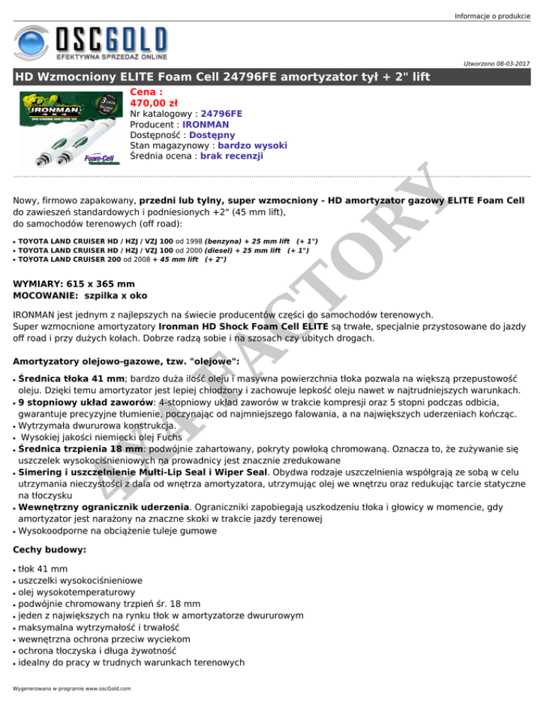 Informacje o produkcie Utworzono 08-03-2017 HD Wzmocniony ELITE Foam Cell 24796FE amortyzator tył + 2" lift Cena : 470,00 zł Y Nr katalogowy : 24796FE Producent : IRONMAN Dostępność : Dostępny Stan magazynowy : bardzo wysoki Średnia ocena : brak recenzji ● ● TOYOTA LAND CRUISER HD / HZJ / VZJ 100 od 1998 (benzyna) + 25 mm lift (+ 1") TOYOTA LAND CRUISER HD / HZJ / VZJ 100 od 2000 (diesel) + 25 mm lift (+ 1") TOYOTA LAND CRUISER 200 od 2008 + 45 mm lift (+ 2") TO ● R Nowy, firmowo zapakowany, przedni lub tylny, super wzmocniony - HD amortyzator gazowy ELITE Foam Cell do zawieszeń standardowych i podniesionych +2" (45 mm lift), do samochodów terenowych (off road): WYMIARY: 615 x 365 mm MOCOWANIE: szpilka x oko FA C IRONMAN jest jednym z najlepszych na świecie producentów części do samochodów terenowych. Super wzmocnione amortyzatory Ironman HD Shock Foam Cell ELITE są trwałe, specjalnie przystosowane do jazdy off road i przy dużych kołach. Dobrze radzą sobie i na szosach czy ubitych drogach. Amortyzatory olejowo-gazowe, tzw. "olejowe": ● ● ● ● ● ● 4 ● Średnica tłoka 41 mm; bardzo duża ilość oleju i masywna powierzchnia tłoka pozwala na większą przepustowość oleju. Dzięki temu amortyzator jest lepiej chłodzony i zachowuje lepkość oleju nawet w najtrudniejszych warunkach. 9 stopniowy układ zaworów: 4-stopniowy układ zaworów w trakcie kompresji oraz 5 stopni podczas odbicia, gwarantuje precyzyjne tłumienie, poczynając od najmniejszego falowania, a na największych uderzeniach kończąc. Wytrzymała dwururowa konstrukcja. Wysokiej jakości niemiecki olej Fuchs Średnica trzpienia 18 mm: podwójnie zahartowany, pokryty powłoką chromowaną. Oznacza to, że zużywanie się uszczelek wysokociśnieniowych na prowadnicy jest znacznie zredukowane Simering i uszczelnienie Multi-Lip Seal i Wiper Seal. Obydwa rodzaje uszczelnienia współgrają ze sobą w celu utrzymania nieczystości z dala od wnętrza amortyzatora, utrzymując olej we wnętrzu oraz redukując tarcie statyczne na tłoczysku Wewnętrzny ogranicznik uderzenia. Ograniczniki zapobiegają uszkodzeniu tłoka i głowicy w momencie, gdy amortyzator jest narażony na znaczne skoki w trakcie jazdy terenowej Wysokoodporne na obciążenie tuleje gumowe 4X ● Cechy budowy: ● ● ● ● ● ● ● ● ● tłok 41 mm uszczelki wysokociśnieniowe olej wysokotemperaturowy podwójnie chromowany trzpień śr. 18 mm jeden z największych na rynku tłok w amortyzatorze dwururowym maksymalna wytrzymałość i trwałość wewnętrzna ochrona przeciw wyciekom ochrona tłoczyska i długa żywotność idealny do pracy w trudnych warunkach terenowych Wygenerowano w programie www.oscGold.com 4X 4 FA C TO R Y GWARANCJA 3 LATA LUB 60.000 KM