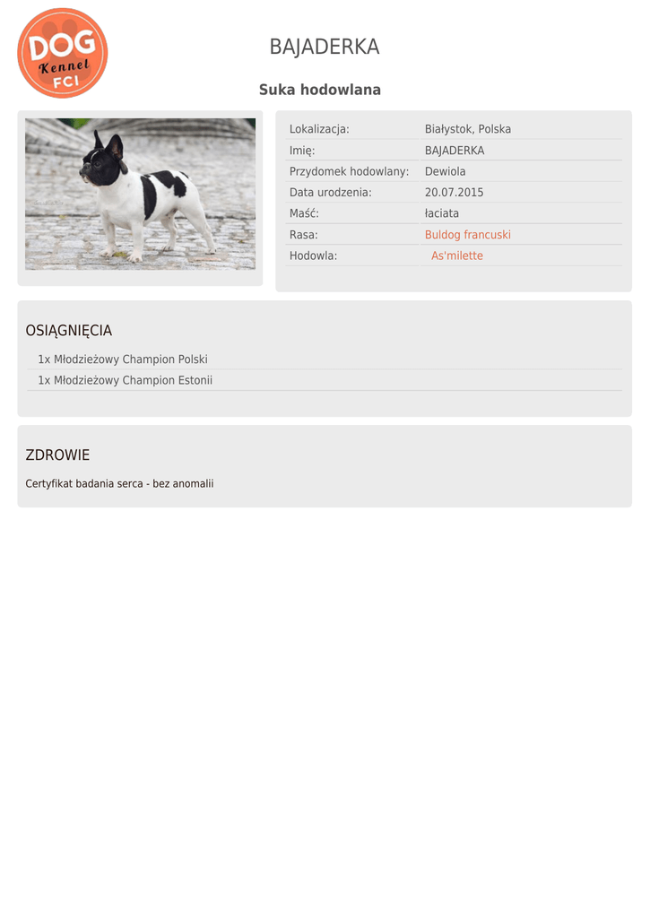 BAJADERKA Suka hodowlana Lokalizacja: Białystok, Polska Imię: BAJADERKA Przydomek hodowlany: Dewiola Data urodzenia: 20.07.2015 Maść: łaciata Rasa: Buldog francuski Hodowla: OSIĄGNIĘCIA 1x Młodzieżowy Champion Polski 1x Młodzieżowy Champion Estonii ZDROWIE Certyfikat badania serca - bez anomalii As'milette