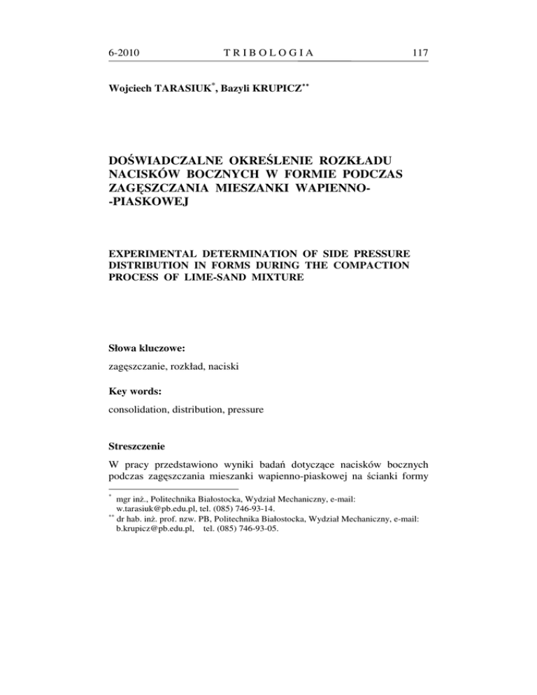 6-2010 TRIBOLOGIA 117 Wojciech TARASIUK*, Bazyli KRUPICZ∗∗ DOŚWIADCZALNE OKREŚLENIE ROZKŁADU NACISKÓW BOCZNYCH W FORMIE PODCZAS ZAGĘSZCZANIA MIESZANKI WAPIENNO-PIASKOWEJ EXPERIMENTAL DETERMINATION OF SIDE PRESSURE DISTRIBUTION IN FORMS DURING THE COMPACTION PROCESS OF LIME-SAND MIXTURE Słowa kluczowe: zagęszczanie, rozkład, naciski Key words: consolidation, distribution, pressure Streszczenie W pracy przedstawiono wyniki badań dotyczące nacisków bocznych podczas zagęszczania mieszanki wapienno-piaskowej na ścianki formy * mgr inż., Politechnika Białostocka, Wydział Mechaniczny, e-mail: [email protected], tel. (085) 746-93-14. ∗∗ dr hab. inż. prof. nzw. PB, Politechnika Białostocka, Wydział Mechaniczny, e-mail: [email protected], tel. (085) 746-93-05. 118 TRIBOLOGIA 6-2010 o przekroju kołowym. Do tego celu wykorzystano stanowisko wyposażone w czujniki tensometryczne na różnych wysokościach formy. Uzyskane wyniki badań pozwoliły na dobór modelu tarcia. WPROWADZENIE Podczas produkcji wyrobów silikatowych pojawia się wiele problemów eksploatacyjnych. Jednym z nich jest problem zużywania się opłytowania form służących do produkcji cegieł. Aby poznać problem, poddano badaniom opłytowanie form wycofane z eksploatacji. Z analizy uzyskanych danych wynika, że istnieją pewne charakterystyczne miejsca, szczególnie narażone na szybkie zużycie [L. 1]. Miejsca te znajdują się blisko górnego położenia tłoka prasy. Wskazuje to na nierównomierny rozkład nacisków bocznych na wysokości formy. Dowodem tego są wyniki badań nasiąkania i wytrzymałości na ściskanie, jakie zostały przeprowadzone na wytypowanej do tego celu cegle silikatowej 3NFD [L. 2]. Modele tarcia [L. 3] uwzględniające ośrodki sypkie pozwalają na obliczenie rozkładu nacisków bocznych występujących na wysokości płyt formy. Analizie poddano następujące modele rozpatrywane w pracach dotyczących analizy sił tarcia w procesie zagęszczania ośrodków sypkich [L. 3, 4, 5]: – model Coulomba (1) gdzie: pa – ciśnienie prasowania pod tłokiem (z = h), f – współczynnik tarcia między płytą formy i ośrodkiem zagęszczanym, ξc = – współczynnik proporcjonalności między siłą nacisku bocznego pr i ciśnieniem prasowania p(z), h – wysokość formy, D – średnica formy, – model Prandtla-Ziebela pr ( z ) = ξ pz ⋅ pa − gdzie: 4 ⋅ µ ⋅σ s ⋅ (h − z ) D (2) µ – współczynnik tarcia Ziebela, ξp-z – współczynnik proporcjonalności dla prawa Prandtla-Ziebela, σs – granica plastyczności materiału przy ściskaniu. 6-2010 TRIBOLOGIA 119 Schemat obliczeń przedstawiono na Rys. 1. Rys. 1. Schemat obliczeniowy: pa – ciśnienie prasowania (z = h), p(z) – ciśnienie na wysokości z, h – wysokość próbki po zagęszczeniu, D – średnica formy Fig. 1. Scheme calculation: pa – moulding pressure, p(z) – pressure-dependent height, h – concentrated lime-sand mixture height, D – diameter form BADANIA DOŚWIADCZALNE W celu weryfikacji modeli tarcia (1) i (2) zbadano rozkład nacisków bocznych pr(z) na ścianki formy. Badanie przeprowadzono na stanowisku przedstawionym na Rys. 2. Rys. 2. Schemat stanowiska do badań rozkładu nacisków bocznych: 1 – tuleja cylindryczna, 2 – tuleja oporowa, 3 – płyta podstawy, 4 – dno formy, 5 – śruba dociskowa, 6 – nakrętka ustalająca, 7 – mostki tensometryczne, 8 – tłok Fig. 1. Scheme stand of side pressure distribution in forms: 1 – cylindrical sleeve, 2 – retaining sleeve, 3 – base plate, 4 – bottom, 5 – binding screw, 6 – nut fixing, 7 – strain gauges, 8 – piston 120 TRIBOLOGIA 6-2010 Wysokość próbki po zagęszczeniu wynosiła 10 cm. Pomiaru nacisku bocznego dokonano na wysokości 3, 5, 7 i 9 cm. Na tych wysokościach umieszczono tłoczki (Rys. 2) z naklejonymi tensometrami elektrooporowymi. Kalibrację tłoczków przeprowadzono na maszynie wytrzymałościowej MTS 322. Do badań przygotowano mieszankę wapienno-piaskową o maksymalnej ziarnistości 1,02 mm. Zagęszczanie odbyło się z prędkością 0,5 kN/s do uzyskania maksymalnej siły 30 kN. Do odczytu wartości z mostków tensometrycznych użyto wzmacniacza i systemu Spider 8. Otrzymane parametry z maszyny wytrzymałościowej i systemu Spider zsynchronizowano i na ich podstawie wyliczono ciśnienia działające na ścianki formy. Na Rys. 3 przedstawiono przebieg ciśnienia panującego w tłoczkach w zależności od ciśnienia prasowania. Różnica wartości ciśnienia bocznego uzyskanego na tłoczku znajdującym się przy dnie i przy tłoku prasującym wynosiła około 80%. Największe ciśnienie panowało przy tłoku i systematycznie spadało wraz z wysokością formy. Rys. 3. Zależność nacisku na ścianki boczne od ciśnienia prasowania na następujących wysokościach: T1 – 3 cm, T2 – 5 cm, T3 – 7 cm, T4 – 9 cm Fig. 2. Dependence side pressure from moulding pressure on heights for: T1 – 3 cm, T2 – 5 cm, T3 – 7 cm, T4 – 9 cm Na Rys. 4 przedstawiono dane doświadczalne ciśnienia bocznego wraz z odchyleniem standardowym, uzyskane na różnych wysokościach formy. Linie ciągłe opisują odpowiednio model Coulomba (1) i Prandtla- 6-2010 TRIBOLOGIA 121 -Ziebela (2). Przebieg krzywych (1) i (2) wyznaczono metodą najmniejszych kwadratów. Rys. 4. Zależność ciśnienia bocznego od wysokości wg prawa Coulomba i Prandtla-Ziebela oraz punkty doświadczalne wraz z odchyleniem standardowym Fig. 4. Dependence side pressure of the heighst according to models Coulomb, Prandtl-Ziebel and experimental points with standard deviation Analiza danych na Rys. 4 wskazuje, że dla opisu danych doświadczalnych w strefie oddalonej od tłoka (punkty T1 i T2) ma zastosowanie model tarcia Coulomba, a w strefie położonej bliżej tłoka (punkty T3, T4) – model tarcia Prandtla-Ziebela. Zależności odpowiadające modelom tarcia Coulomba (1) i Prandtla-Ziebela (2) wyprowadzono przy założeniu proporcjo