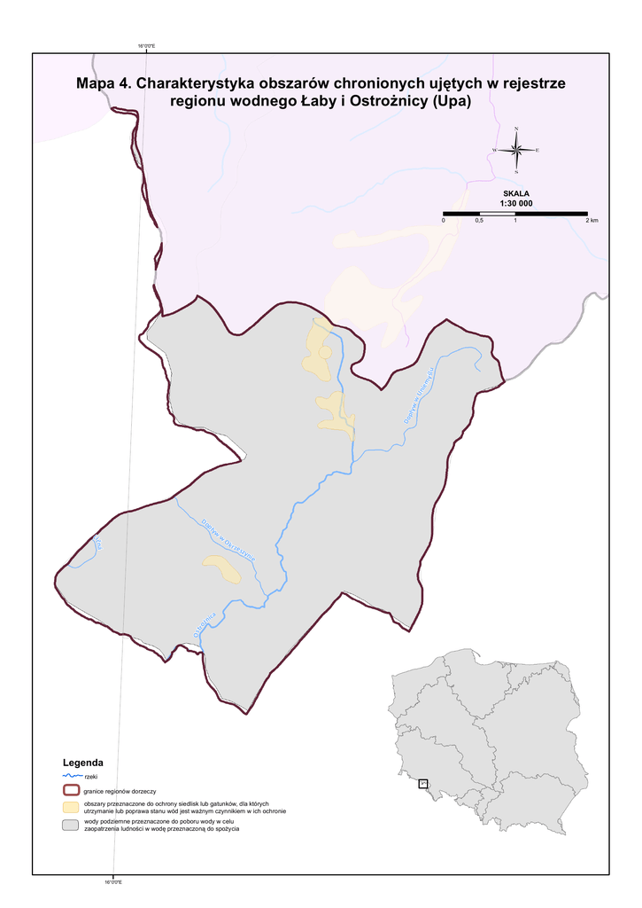 16°0'0"E Mapa 4. Charakterystyka obszarów chronionych ujętych w rejestrze regionu wodnego Łaby i Ostrożnicy (Upa) ¶ SKALA 1:30 000 Do pły ww Un i em y ślu 0 Do yw pł L ičná w Ok r ze e szy ni Ost r o ica żn Legenda rzeki granice regionów dorzeczy obszary przeznaczone do ochrony siedlisk lub gatunków, dla których utrzymanie lub poprawa stanu wód jest ważnym czynnikiem w ich ochronie wody podziemne przeznaczone do poboru wody w celu zaopatrzenia ludności w wodę przeznaczoną do spożycia 16°0'0"E 0,5 1 2 km