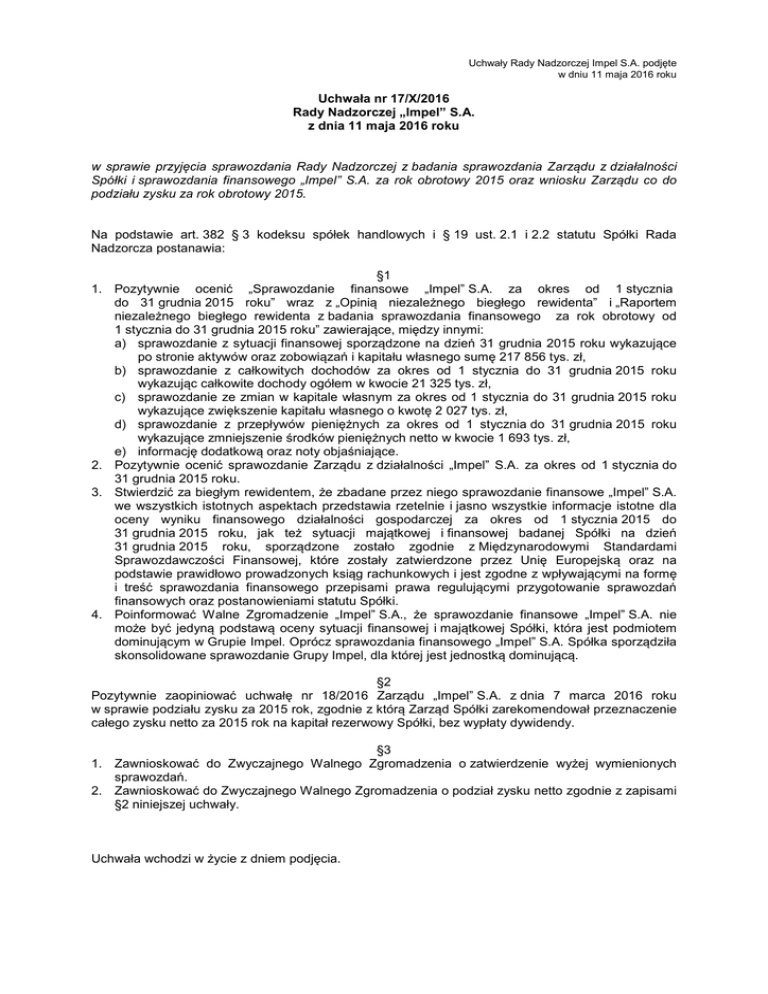 Uchwały Rady Nadzorczej Impel S.A. podjęte w dniu 11 maja 2016 roku Uchwała nr 17/X/2016 Rady Nadzorczej „Impel” S.A. z dnia 11 maja 2016 roku w sprawie przyjęcia sprawozdania Rady Nadzorczej z badania sprawozdania Zarządu z działalności Spółki i sprawozdania finansowego „Impel” S.A. za rok obrotowy 2015 oraz wniosku Zarządu co do podziału zysku za rok obrotowy 2015. Na podstawie art. 382 § 3 kodeksu spółek handlowych i § 19 ust. 2.1 i 2.2 statutu Spółki Rada Nadzorcza postanawia: §1 1. Pozytywnie ocenić „Sprawozdanie finansowe „Impel” S.A. za okres od 1 stycznia do 31 grudnia 2015 roku” wraz z „Opinią niezależnego biegłego rewidenta” i „Raportem niezależnego biegłego rewidenta z badania sprawozdania finansowego za rok obrotowy od 1 stycznia do 31 grudnia 2015 roku” zawierające, między innymi: a) sprawozdanie z sytuacji finansowej sporządzone na dzień 31 grudnia 2015 roku wykazujące po stronie aktywów oraz zobowiązań i kapitału własnego sumę 217 856 tys. zł, b) sprawozdanie z całkowitych dochodów za okres od 1 stycznia do 31 grudnia 2015 roku wykazując całkowite dochody ogółem w kwocie 21 325 tys. zł, c) sprawozdanie ze zmian w kapitale własnym za okres od 1 stycznia do 31 grudnia 2015 roku wykazujące zwiększenie kapitału własnego o kwotę 2 027 tys. zł, d) sprawozdanie z przepływów pieniężnych za okres od 1 stycznia do 31 grudnia 2015 roku wykazujące zmniejszenie środków pieniężnych netto w kwocie 1 693 tys. zł, e) informację dodatkową oraz noty objaśniające. 2. Pozytywnie ocenić sprawozdanie Zarządu z działalności „Impel” S.A. za okres od 1 stycznia do 31 grudnia 2015 roku. 3. Stwierdzić za biegłym rewidentem, że zbadane przez niego sprawozdanie finansowe „Impel” S.A. we wszystkich istotnych aspektach przedstawia rzetelnie i jasno wszystkie informacje istotne dla oceny wyniku finansowego działalności gospodarczej za okres od 1 stycznia 2015 do 31 grudnia 2015 roku, jak też sytuacji majątkowej i finansowej badanej Spółki na dzień 31 grudnia 2015 roku, sporządzone zostało zgodnie z Międzynarodowymi Standardami Sprawozdawczości Finansowej, które zostały zatwierdzone przez Unię Europejską oraz na podstawie prawidłowo prowadzonych ksiąg rachunkowych i jest zgodne z wpływającymi na formę i treść sprawozdania finansowego przepisami prawa regulującymi przygotowanie sprawozdań finansowych oraz postanowieniami statutu Spółki. 4. Poinformować Walne Zgromadzenie „Impel” S.A., że sprawozdanie finansowe „Impel” S.A. nie może być jedyną podstawą oceny sytuacji finansowej i majątkowej Spółki, która jest podmiotem dominującym w Grupie Impel. Oprócz sprawozdania finansowego „Impel” S.A. Spółka sporządziła skonsolidowane sprawozdanie Grupy Impel, dla której jest jednostką dominującą. §2 Pozytywnie zaopiniować uchwałę nr 18/2016 Zarządu „Impel” S.A. z dnia 7 marca 2016 roku w sprawie podziału zysku za 2015 rok, zgodnie z którą Zarząd Spółki zarekomendował przeznaczenie całego zysku netto za 2015 rok na kapitał rezerwowy Spółki, bez wypłaty dywidendy. §3 1. Zawnioskować do Zwyczajnego Walnego Zgromadzenia o zatwierdzenie wyżej wymienionych sprawozdań. 2. Zawnioskować do Zwyczajnego Walnego Zgromadzenia o podział zysku netto zgodnie z zapisami §2 niniejszej uchwały. Uchwała wchodzi w życie z dniem podjęcia. Uchwały Rady Nadzorczej Impel S.A. podjęte w dniu 11 maja 2016 roku Uchwała nr 18/X/2016 Rady Nadzorczej „Impel” S.A. z dnia 11 maja 2016 roku w sprawie przyjęcia sprawozdania Rady Nadzorczej z badania sprawozdania Zarządu z działalności Grupy Impel i skonsolidowanego sprawozdania finansowego Grupy Impel za rok obrotowy 2015. Na podstawie § 6 ust. 2 pkt 6.11 Regulaminu Rady Nadzorczej w związku z art.395 §5 kodeksu spółek handlowych oraz art.63 c ust.4 ustawy o rachunkowości, Rada Nadzorcza postanawia: §1 1. Pozytywnie ocenić „Skonsolidowane sprawozdanie finansowe Grupy Impel za okres od 1 stycznia do 31 grudnia 2015 roku” wraz z „Opinią niezależnego biegłego rewidenta” i „Raportem niezależnego biegłego rewidenta z badania skonsolidowanego sprawozdania finansowego za rok obrotowy od 1 stycznia do 31 grudnia 2015 roku” zawierające, między innymi: a) skonsolidowane sprawozdanie z sytuacji finansowej sporządzone na dzień 31 grudnia 2015 roku wykazujące po stronie aktywów oraz zobowiązań i kapitału własnego sumę 894 795 tys. zł, b) skonsolidowane sprawozdanie z całkowitych dochodów za okres od 1 stycznia do 31 grudnia 2015 roku wykazujące całkowite dochody ogółem w kwocie 24 360 tys. zł, c) skonsolidowane sprawozdanie ze zmian w kapitale własnym za okres od 1 stycznia do 31 grudnia 2015 roku wykazujące zwiększenie kapitału własnego o kwotę 5 427 tys. zł, d) skonsolidowane sprawozdanie z przepływów pieniężnych za okres od 1 stycznia do 31 grudnia 2015 roku wykazujące przyrost środków pieniężnych netto w kwocie 20 852 tys. zł, e) informację dodatkową oraz noty objaśniające. 2. Pozytywnie ocenić sprawozdanie Zarządu z działalności Grupy Impel za okres od 1 stycznia do 31 grudnia 2015 roku. 3. Stwierdzić za biegłym rewidentem, że zbadane przez niego skonsolidowane sprawozdanie finansowe we wszystkich istotnych aspektach przedstawia rzetelnie i jasno wszystkie informacje istotne dla oceny wyniku finansowego działalności gospodarczej za okres od 1 stycznia 2015 do 31 grudnia 2015 roku, jak też sytuacji majątkowej i finansowej badanej Grupy na dzień 31 grudnia 2015 roku, sporządzone zostało zgodnie z Międzynarodowymi Standardami Sprawozdawczości Finansowej, które zostały zatwierdzone przez Unię Europejską i jest zgodne z wpływającymi na formę i treść sprawozdania finansowego przepisami prawa regulującymi przygotowanie sprawozdań finansowych. §2 Zawnioskować do Zwyczajnego Walnego Zgromadzenia o zatwierdzenie wyżej wymienio