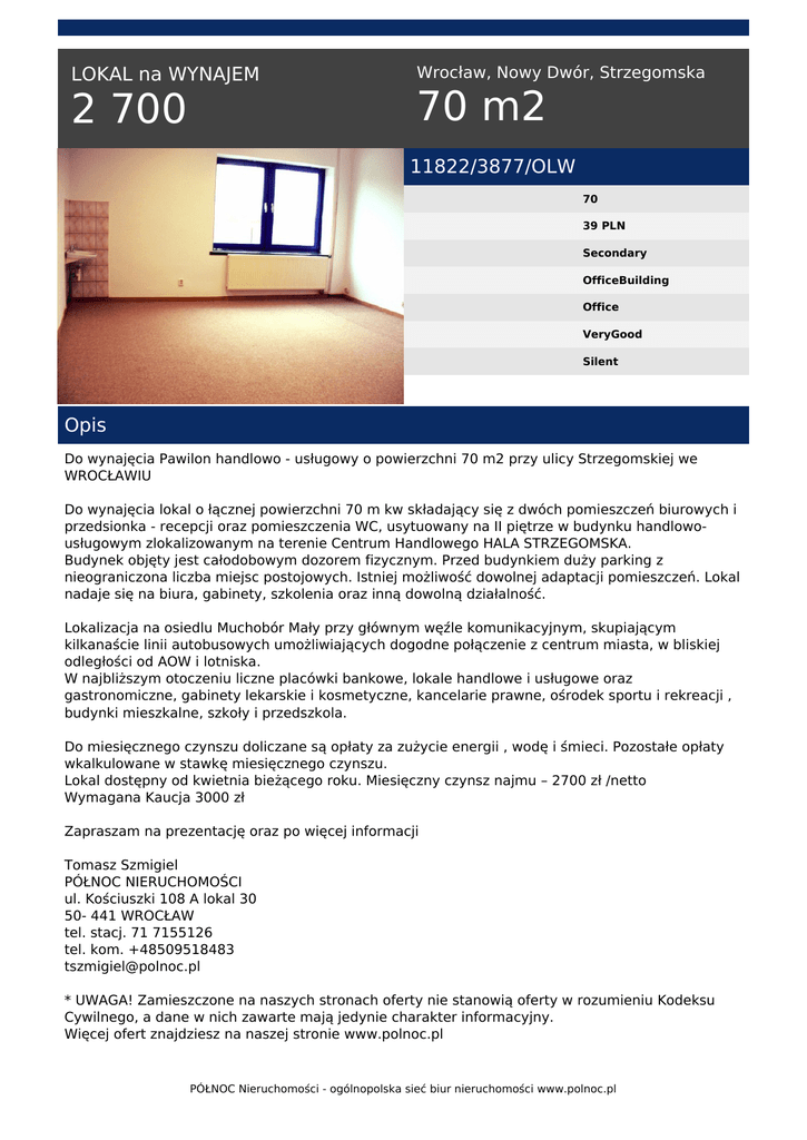 LOKAL na WYNAJEM 2 700 Wrocław, Nowy Dwór, Strzegomska 70 m2 11822/3877/OLW 70 39 PLN Secondary OfficeBuilding Office VeryGood Silent Opis Do wynajęcia Pawilon handlowo - usługowy o powierzchni 70 m2 przy ulicy Strzegomskiej we WROCŁAWIU Do wynajęcia lokal o łącznej powierzchni 70 m kw składający się z dwóch pomieszczeń biurowych i przedsionka - recepcji oraz pomieszczenia WC, usytuowany na II piętrze w budynku handlowousługowym zlokalizowanym na terenie Centrum Handlowego HALA STRZEGOMSKA. Budynek objęty jest całodobowym dozorem fizycznym. Przed budynkiem duży parking z nieograniczona liczba miejsc postojowych. Istniej możliwość dowolnej adaptacji pomieszczeń. Lokal nadaje się na biura, gabinety, szkolenia oraz inną dowolną działalność. Lokalizacja na osiedlu Muchobór Mały przy głównym węźle komunikacyjnym, skupiającym kilkanaście linii autobusowych umożliwiających dogodne połączenie z centrum miasta, w bliskiej odległości od AOW i lotniska. W najbliższym otoczeniu liczne placówki bankowe, lokale handlowe i usługowe oraz gastronomiczne, gabinety lekarskie i kosmetyczne, kancelarie prawne, ośrodek sportu i rekreacji , budynki mieszkalne, szkoły i przedszkola. Do miesięcznego czynszu doliczane są opłaty za zużycie energii , wodę i śmieci. Pozostałe opłaty wkalkulowane w stawkę miesięcznego czynszu. Lokal dostępny od kwietnia bieżącego roku. Miesięczny czynsz najmu – 2700 zł /netto Wymagana Kaucja 3000 zł Zapraszam na prezentację oraz po więcej informacji Tomasz Szmigiel PÓŁNOC NIERUCHOMOŚCI ul. Kościuszki 108 A lokal 30 50- 441 WROCŁAW tel. stacj. 71 7155126 tel. kom. +48509518483 [email protected] * UWAGA! Zamieszczone na naszych stronach oferty nie stanowią oferty w rozumieniu Kodeksu Cywilnego, a dane w nich zawarte mają jedynie charakter informacyjny. Więcej ofert znajdziesz na naszej stronie www.polnoc.pl PÓŁNOC Nieruchomości - ogólnopolska sieć biur nieruchomości www.polnoc.pl * UWAGA! Zamieszczone na naszych stronach oferty nie stanowią oferty w rozumieniu Kodeksu Cywilnego, a dane w nich zawarte mają jedynie charakter informacyjny. Tomasz Szmigiel tel. 509-518-483 email: [email protected] PÓŁNOC Nieruchomości - ogólnopolska sieć biur nieruchomości www.polnoc.pl Powered by TCPDF (www.tcpdf.org)