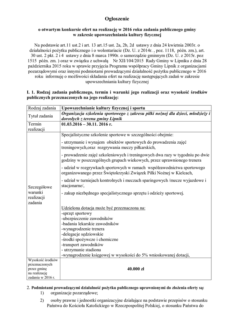 Ogłoszenie o otwartym konkursie ofert na realizację w 2016 roku zadania publicznego gminy w zakresie upowszechniania kultury fizycznej Na podstawie art.11 ust.2 i art. 13 art.15 ust. 2a, 2b, 2d ustawy z dnia 24 kwietnia 2003r. o działalności pożytku publicznego i o wolontariacie (Dz. U. z 2014r. , poz. 1118, późn. zm.), art. 30 ust. 2 pkt. 2 i 4 ustawy z dnia 8 marca 1990r. o samorządzie gminnym (Dz. U. z 2015r. poz 1515 późn. zm. ) oraz w związku z uchwałą Nr XII/104/2015 Rady Gminy w Lipniku z dnia 28 października 2015 roku w sprawie przyjęcia Programu współpracy Gminy Lipnik z organizacjami pozarządowymi oraz innymi podmiotami prowadzącymi działalność pożytku publicznego w 2016 roku informuję o możliwości składania ofert na realizację następujących zadań w zakresie upowszechniania kultury fizycznej I. 1. Rodzaj zadania publicznego, termin i warunki jego realizacji oraz wysokość środków publicznych przeznaczonych na jego realizację: Rodzaj zadania Tytuł zadania Termin realizacji Upowszechnianie kultury fizycznej i sportu Organizacja szkolenia sportowego z zakresu piłki nożnej dla dzieci, młodzieży i dorosłych z terenu gminy Lipnik 01.03.2016 – 30.11. 2016 r. Specjalistyczne szkolenie sportowe w szczególności obejmie: - utrzymanie i wynajem obiektów sportowych do prowadzenia zajęć treningowych,oraz rozgrywania meczy piłkarskich, - prowadzenie zajęć szkoleniowych i treningowych dwa razy w tygodniu po dwie godziny w poszczególnych grupach wiekowych, przez uprawnionego trenera - udział w rozgrywkach sportowych w ramach współzawodnictwa sportowego organizowanego przez Świętokrzyski Związek Piłki Nożnej w Kielcach, Szczegółowe warunki realizacji zadania - udział w turniejach kontrolnych i meczach sparingowych /mecze wyjazdowe i stacjonarne/, - zakup niezbędnego specjalistycznego sprzętu i odzieży sportowej. Udzielona dotacja może być przeznaczona na: -sprzęt sportowy -ubezpieczenie zawodników -badania lekarskie zawodników -wynagrodzenie trenera -delegacje sędziowskie -środki spożywcze i chemiczne -transport zawodników - utrzymanie stadionu -wynagrodzenie księgowej w wysokości do 5% wnioskowanej dotacji, Wysokość środków przeznaczonych przez gminę na realizację zadania w 2016 r. 40.000 zł 2. Podmiotami prowadzącymi działalność pożytku publicznego uprawnionymi do złożenia oferty są: 1) organizacje pozarządowe; 2) osoby prawne i jednostki organizacyjne działające na podstawie przepisów o stosunku Państwa do Kościoła Katolickiego w Rzeczpospolitej Polskiej, o stosunku Państwa do innych kościołów i związków wyznaniowych oraz o gwarancjach wolności sumienia i wyznania, jeżeli ich cele statutowe obejmują prowadzenie działalności pożytku publicznego; 3) stowarzyszenia jednostek samorządu terytorialnego; 4) spółdzielnie socjalne; 5) spółki akcyjne i spółki z ograniczoną odpowiedzialnością oraz kluby sportowe, będące spółkami. 3. Zlecenie realizacji zadania będzie miało formę powierzenia wykonania zadania poprzez udzielenie dotacji na realizację zadania. 4. Warunkiem przyznania dotacji jest zawarcie umowy pomiędzy Gminą Lipnik a podmiotem wyłonionym w drodze konkursu. 5. Termin realizacji zadania ustalony zostanie w umowie i nie może być dłuższy niż od chwili podpisania umowy na realizację zadania do 31.12.2016r. 6. Zadanie powinno być realizowane na rzecz mieszkańców Gminy Lipnik z najwyższą starannością, zgodnie z zawartą umową oraz z obowiązującymi standardami i przepisami, w zakresie opisanym w ofercie. W trakcie realizacji zadania zmiany rzeczowe i finansowe będą dokonywane na podstawie pisemnych aneksów do umów. 7. W przypadku, gdy suma dofinansowania zgłoszonych ofert na realizację zadania przekroczy wysokość środków przeznaczonych na wsparcie tego zadania, organizator konkursu zastrzega sobie możliwość przydzielenia odpowiednio niższego dofinansowania, stosownie do posiadanych środków. W przypadku zaistnienia konieczności zmniejszenia kwoty dotacji w stosunku do wnioskowanej przez oferentów, mogą oni złożyć oświadczenie, że nie będą oni związani złożonymi ofertami. 8. Zastrzega się możliwość powierzenia realizacji zadania lub jego części więcej niż jednemu podmiotowi. II. Termin składania ofert: Oferty zgodne ze wzorem określonym w rozporządzeniu Ministra Pracy i Polityki Społecznej z dnia 15 grudnia 2010r. w sprawie wzoru oferty i ramowego wzoru umowy dotyczących realizacji zadania publicznego oraz wzoru sprawozdania z wykonania tego zadania /Dz.U. Nr 6, poz. 25/ należy składać w sekretariacie Gminy w Lipnik lub pocztą (liczy się data wpływu) na adres: Urząd Gminy Lipnik, Lipnik 20, 27-540 Lipnik w zamkniętych kopertach z dopiskiem : Oferta na realizację zadania publicznego na 2016 rok tytuł zadania „………………...”, w nieprzekraczalnym terminie do 24 lutego 2016 roku do godz. 900. Do oferty należy dołączyć, poświadczoną za zgodność z oryginałem, kopię aktualnego odpisu z Krajowego Rejestru Sadowego, innego rejestru lub ewidencji. III. 1. Termin, tryb i kryteria stosowane przy dokonywaniu wyboru ofert: Rozpatrzenie i wybór ofert nastąpi w terminie 14 dni od upływu terminu składania ofert. 2. Oferty ocenia, powołana przez Wójta Gminy, Komisja Konkursowa, która dokonuje wyboru ofert w oparciu o następujące kryteria (zgodnie z kartą oceny oferty, stanowiącą załącznik do ogłoszenia: zgodność oferty z warunkami konkursowymi wartość merytoryczna, w szczególności sposób naboru uczestników, formy realizacji, zakładane rezultaty i sposób ich oceny, liczba beneficjentów, do których skierowane jest zadanie. kwalifikacje i doświadczenia osób bezpośrednio zaangażowanych w realizację zadania zasoby lokalowe i sprzętowe oferenta odpowiednie do realizacji zadania koszt realizacji projektu, ze szczególnym uwzględnieniem stawek i kosztów wynagrodzeń wysok
