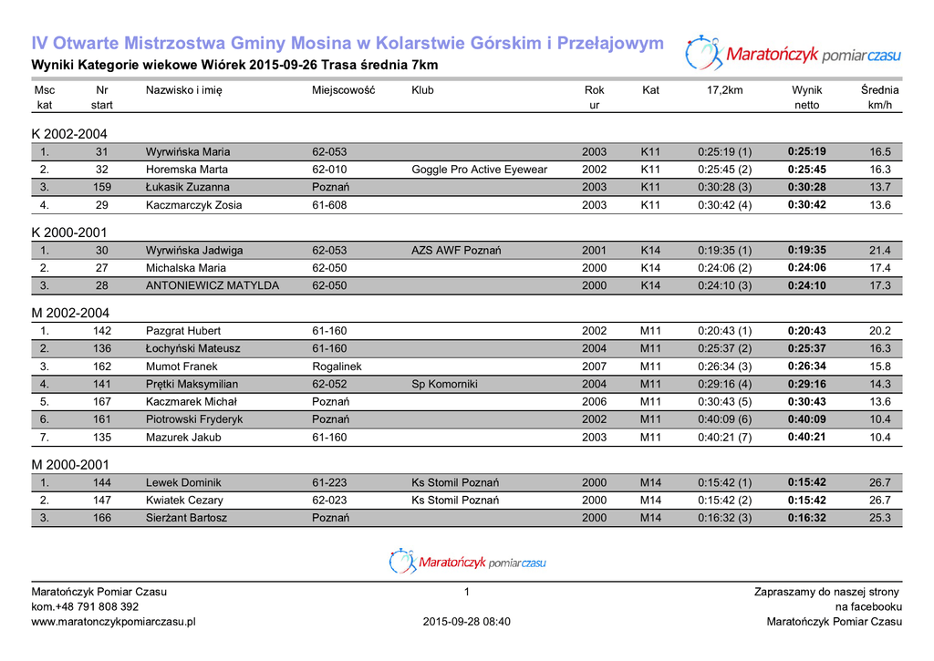 IV Otwarte Mistrzostwa Gminy Mosina w Kolarstwie Górskim i Przełajowym Wyniki Kategorie wiekowe Wiórek 2015-09-26 Trasa średnia 7km Msc kat Nr start Nazwisko i imię Miejscowość Klub Wynik netto Średnia 0:25:19 (1) 0:25:19 16.5 K11 0:25:45 (2) 0:25:45 16.3 K11 0:30:28 (3) 0:30:28 13.7 13.6 Rok ur Kat 2003 K11 2002 2003 17,2km km/h K 2002-2004 1. 31 Wyrwińska Maria 62-053 2. 32 Horemska Marta 62-010 3. 159 Łukasik Zuzanna Poznań 4. 29 Kaczmarczyk Zosia 61-608 Goggle Pro Active Eyewear 2003 K11 0:30:42 (4) 0:30:42 2001 K14 0:19:35 (1) 0:19:35 21.4 K 2000-2001 1. 30 Wyrwińska Jadwiga 62-053 2. 27 Michalska Maria 62-050 2000 K14 0:24:06 (2) 0:24:06 17.4 3. 28 ANTONIEWICZ MATYLDA 62-050 2000 K14 0:24:10 (3) 0:24:10 17.3 AZS AWF Poznań M 2002-2004 1. 142 Pazgrat Hubert 61-160 2002 M11 0:20:43 (1) 0:20:43 20.2 2. 136 Łochyński Mateusz 61-160 2004 M11 0:25:37 (2) 0:25:37 16.3 3. 162 Mumot Franek Rogalinek 2007 M11 0:26:34 (3) 0:26:34 15.8 4. 141 Prętki Maksymilian 62-052 2004 M11 0:29:16 (4) 0:29:16 14.3 5. 167 Kaczmarek Michał Poznań 2006 M11 0:30:43 (5) 0:30:43 13.6 6. 161 Piotrowski Fryderyk Poznań 2002 M11 0:40:09 (6) 0:40:09 10.4 7. 135 Mazurek Jakub 61-160 2003 M11 0:40:21 (7) 0:40:21 10.4 Sp Komorniki M 2000-2001 1. 144 Lewek Dominik 61-223 Ks Stomil Poznań 2000 M14 0:15:42 (1) 0:15:42 26.7 2. 147 Kwiatek Cezary 62-023 Ks Stomil Poznań 2000 M14 0:15:42 (2) 0:15:42 26.7 3. 166 Sierżant Bartosz Poznań 2000 M14 0:16:32 (3) 0:16:32 25.3 Maratończyk Pomiar Czasu kom.+48 791 808 392 www.maratonczykpomiarczasu.pl 1 2015-09-28 08:40 Zapraszamy do naszej strony na facebooku Maratończyk Pomiar Czasu Miejscowość Wynik netto Średnia 0:17:50 (4) 0:17:50 23.5 M14 0:17:54 (5) 0:17:54 23.4 2000 M14 0:19:38 (6) 0:19:38 21.3 62-035 2001 M14 0:19:40 (7) 0:19:40 21.3 Alankiewicz Hubert 61-160 2001 M14 0:20:17 (8) 0:20:17 20.7 140 Wiciak Mateusz 61-160 2000 M14 0:21:06 (9) 0:21:06 19.8 10. 137 Parzęcki Jakub 61-160 2001 M14 0:21:42 (10) 0:21:42 19.3 11. 139 Tomczak Maciej 62-022 2000 M14 0:24:21 (11) 0:24:21 17.2 Msc kat Nr start Nazwisko i imię 4. 148 Sieradzki Adam 61-228 5. 138 Alankiewicz Maciej 6. 134 7. Klub Rok ur Kat 2000 M14 61-160 2000 Milinski Filip 61-160 133 Haremski Krzysztof 8. 143 9. Ks Stomil Poznań Szybcy i Wściekli 17 Team 17,2km km/h Liczba zawodników: 25 Maratończyk Pomiar Czasu kom.+48 791 808 392 www.maratonczykpomiarczasu.pl 2 2015-09-28 08:40 Zapraszamy do naszej strony na facebooku Maratończyk Pomiar Czasu