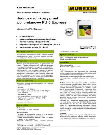 Karta Techniczna Technika KLT_PU5klejenia express wykładzin i parkietów Jednoskładnikowy grunt poliuretanowy PU 5 Express (Voranstrich PU 5 Express) szybkoschnący niezawierający rozpuszczalników i wody do stosowania pod kleje PU i MS na podłoża z wilgocią resztkową do 3,5% CM bardzo niska emisja, EC1-PLUS Właściwości produktu a ich zawartość szybko zużyć. Szybkoschnący, niezawierający wody i rozpuszczalników, jednoskładnikowy, gotowy do użycia preparat gruntujący na bazie żywicy poliuretanowej. Zgodność badania Karta Charakterystyki (Karta Bezpieczeństwa) GEV Emicode EC1-PLUS Zastosowanie Stosowanie Preparat gruntujący przeznaczony do gruntowania normalnych i bardzo chłonnych oraz pylących jastrychów przed użyciem klejów poliuretanowych do parkietów (PU) i klejów MS oraz (po zasypaniu piaskiem kwarcowym) klejów do płytek i mas samopoziomujących. Do odcięcia podwyższonej wilgoci szczątkowej do max 3,5% CM w jastrychach cementowych (bez ogrzewania podłogowego). Grunt nadaje się do gruntowania podłoży przy ogrzewaniu podłogowym oraz na podłogi obciążone kółkami krzeseł. Do stosowania wewnątrz budynków Zalecane narzędzia: Wałek malarski z gąbki lub weluru. Podłoże: Grunt przeznaczony do stosowania na wszystkich standardowych, chłonnych podłożach mineralnych, takich jak jastrychy cementowe i anhydrytowe. Nie stosować na podłożach metalowych i niechłonnych. Na nietypowych podłożach zalecane jest wykonanie próby. Parametry techniczne Podłoże powinno być wykonane zgodnie z zasadami sztuki budowlanej, obowiązującymi wytycznymi, instrukcjami i normami. Podłoże musi być chłonne, mocne, stabilne, odpowiednio wytrzymałe, bez spękań, czyste, dobrze przeszlifowane, oczyszczone i odkurzone. Warstwy podłoża ograniczające jego chłonność i przyczepność kleju, np. twarde powłoki, mleczko cementowe, mleczko anhydrytowe, twardziel powierzchniową, stare warstwy klejów lub mas wyrównawczych, itp. należy dokładnie usunąć poprzez szlifowanie, szczotkowanie, frezowanie lub śrutowanie. Wszystkie rysy i pęknięcia w podłożu należy sklamrować i wypełnić żywicą poliestrową 2K HOCO 24 lub żywicą poliuretanową 2K SI 60, czy żywicą epoksydową 2K EP 170 i przesypać piaskiem kwarcowym. Podłoże należy sprawdzić w oparciu o obowiązujące wytyczne, normy i instrukcje. Temperatura podłoża powinna wynosić minimum +16°C. Dane dotyczą warunków: temperatura powietrza 20oC, wilgotność względna powietrza 55% Zużycie: - jako grunt: ok. 100-150 g/m² - jako odcięcie wilgoci szczątkowej*: ok. 350-400 g/m² Czas schnięcia: - jako grunt: ok. 2 godz. - jako odcięcie wilgoci szczątkowej: ok. 12 godz. Optymalna temp. obróbki: +15°C do +25°C Gęstość 1,2 g/cm³ * Zaleca się nałożenie 2 warstw Dane produktu Opakowanie: 11 kg kanister (1 paleta: 42 kanistry) Magazynowanie: Warunki: w temperaturze powyżej 5°C, w suchych warunkach, w oryginalnych opakowaniach. Okres przechowywania: najlepiej zużyć w okresie 6 miesięcy od daty produkcji. Napoczęte opakowania należy szczelnie zamknąć, PU 5 Express, ważna od: 01.08.2016, WTA, stron 2 Murexin Polska Sp. z o.o. 31-320 Kraków, ul. Słowicza 3 Tel.: +48 12 265 01 10, fax: 12 311 01 41 e-mail: [email protected], Internet: www.murexin.pl Obróbka: Pojemnik z gruntem przed użyciem należy doprowadzić do temperatury pokojowej. Kanister dobrze wstrząsnąć i jego zawartość przelać do czystego pojemnika (wiadra). 1 Karta Techniczna Technika KLT_PU5klejenia express wykładzin i parkietów Grunt nakładać na podłoże równomiernie na całej powierzchni przy pomocy wałka. Nakładać w cienkich warstwach, unikać tworzenia się kałuż. Nałożenie gruntu w grubszej warstwie może spowodować jego spienienie na powierzchni. Perfekcyjny system Gruntowanie: Grunt poliuretanowy PU 5 Express. Klejenie parkietu: Klej poliuretanowy: PU566, PU560 Jako grunt - grunt nanosić jednokrotnie, cienką warstwą za pomocą wałka. Czas schnięcia gruntu wynosi 2 godziny*. Jeśli na warstwie gruntującej będzie wylewana masa wyrównująca należy przesypać grunt piaskiem kwarcowym 0,6-1,2 mm w ilości ok. 2,5 kg/m². Jeśli grunt jest stosowany pod kleje poliuretanowe do parkietu i klejenie będzie wykonywane w okresie dłuższym niż 24 godz. od gruntowania, świeżą warstwę przesypać piaskiem kwarcowym 0,4-0,8 mm. Jako odcięcie resztkowej wilgoci z podłoża - grunt należy stosować w 2 cienkich warstwach nakładanych krzyżowo. Czas schnięcia między warstwami wynosi ok. 1 godz.* Dalsze prace można wykonywać po ok. 12 godz.* od nałożenia drugiej warstwy gruntu. W razie potrzeby przesypać świeżo nałożoną druga warstwę gruntu piaskiem kwarcowym. Klej MS: X-Bond MS K511, X-Bond MS K509, X-Bond MS K530, X-Bond K88 Ważne informacje Należy przestrzegać norm i wytycznych oraz zaleceń podanych w kartach technicznych dla danego podłoża. Wysoka wilgotność oraz niska temperatura powietrza mogą być przyczyną wydłużenia czasu schnięcia. Wysoka temperatura powietrza może przyczynić się do przyspieszenia schnięcia. Nie dodawać żadnych obcych materiałów. Nie spożywać. Chronić przed dziećmi. Ochrona pracy i ochrona środowiska: Należy przestrzegać oznaczeń na dotyczących bezpieczeństwa produktów bezpieczeństwa produktu. W przypadku kolejnych prac związanych ze szpachlowaniem podłoża lub klejeniem płytek nakładać grunt w dwóch warstwach. Drugą, mokrą warstwę gruntu PU 5 Express należy zasypać piaskiem kwarcowym o frakcji 0,4-0,8 mm lub 0,6 -1,2 mm (ok. 2,5 kg/m2). Po wyschnięciu i utwardzeniu się gruntu luźny piasek kwarcowy należy zebrać i dokładnie odkurzyć powierzchnię podłogi. Jeżeli klejenie klejami poliuretanowymi PU lub MS będzie wykonywane w okresie krótszym niż 24 godz.* to można pominąć zasypywanie piaskiem kwarcowym świeżo nałożonego gruntu PU5 Express. Usuwanie odpadów: Resztki produktó