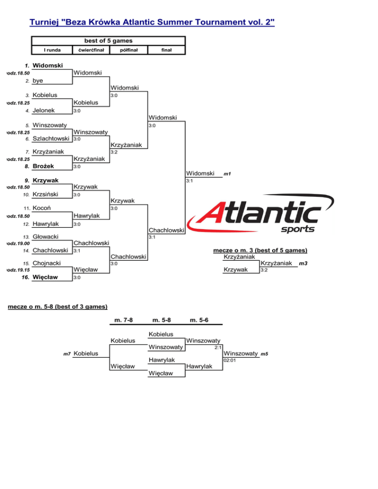 Turniej "Beza Krówka Atlantic Summer Tournament vol. 2" best of 5 games I runda ćwierćfinał półfinał finał 1. Widomski Widomski godz.18.50 2. bye 3. Kobielus Widomski 3:0 Kobielus godz.18.25 4. Jelonek 3:0 Widomski 5. godz.18.25 6. 7. Winszowaty Szlachtowski 3:0 Winszowaty 3:0 Krzyżaniak Krzyżaniak 3:2 Krzyżaniak godz.18.25 8. Brożek 3:0 Widomski 9. Krzywak Krzywak godz.18.50 10. Krzsiński 11. Kocoń 3:0 Krzywak 3:0 Hawrylak godz.18.50 12. Hawrylak 13. godz.19.00 Głowacki 14. 15. godz.19.15 m1 3:1 3:0 Chachlowski 3:1 Chachlowski Chachlowski Chojnacki mecze o m. 3 (best of 5 games) Krzyżaniak Krzyżaniak m3 Krzywak 3:2 3:1 Chachlowski 3:0 Więcław 16. Więcław 3:0 mecze o m. 5-8 (best of 3 games) m. 7-8 Kobielus m7 Kobielus Więcław m. 5-8 Kobielus Winszowaty Hawrylak Więcław m. 5-6 Winszowaty 2:1 Winszowaty 02:01 Hawrylak m5 mecze o m. 9-16 (best of 3 games) m. 9-16 1. m. 9-12 m. 9-10 bye Jelonek 2. Jelonek Brożek 3. Szlachtowski 4. Brożek 5. Krasiński 6. Kocoń Brożek Głowacki m9 Krasiński Głowacki 7. m. 11-12 (best of 3 games) Głowacki Krasiński Głowacki 8. Krasiński Chojnacki Jelonek mecze o m. 13-16 (best of 3 games) m. 15-16 m. 13-16 m. 13-14 bye Szlachtowski Szlachtowski m15 Kocoń Chojnacki Kocoń Kocoń Chojnacki Chojnacki m13 m11