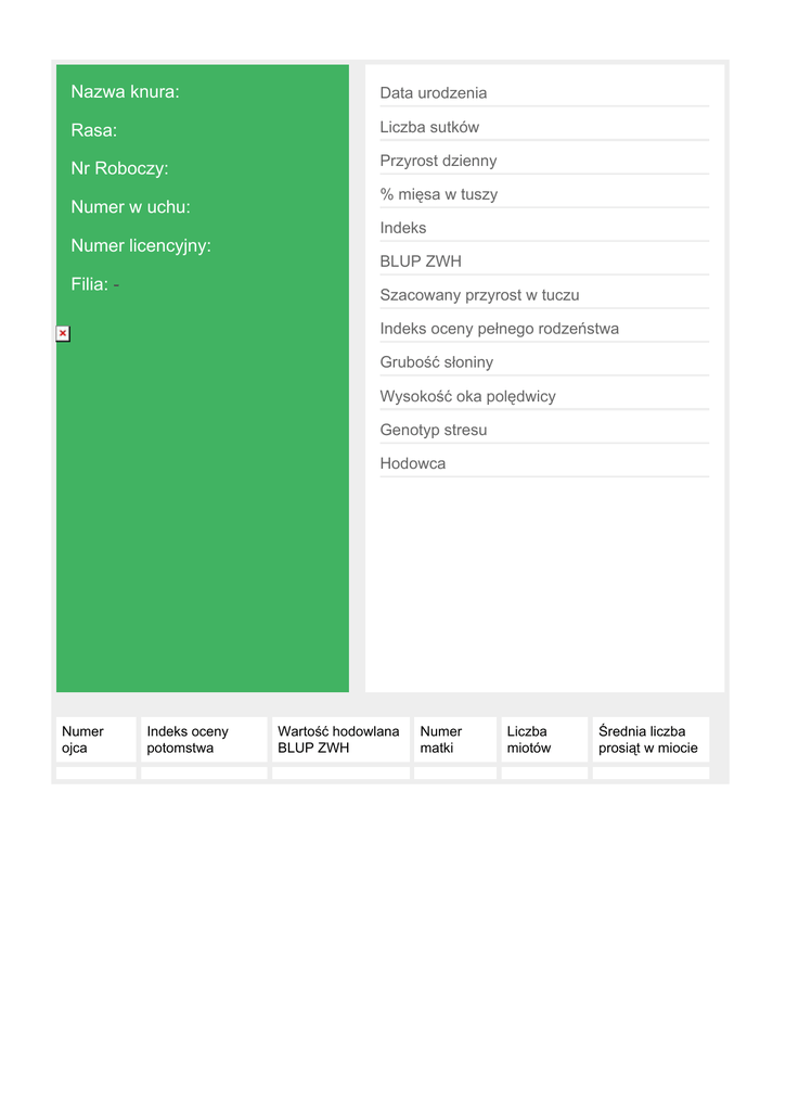 Nazwa knura: Data urodzenia Rasa: Liczba sutków Nr Roboczy: Przyrost dzienny Numer w uchu: Numer licencyjny: Filia: - % mięsa w tuszy Indeks BLUP ZWH Szacowany przyrost w tuczu Indeks oceny pełnego rodzeństwa Grubość słoniny Wysokość oka polędwicy Genotyp stresu Hodowca Numer ojca Indeks oceny potomstwa Wartość hodowlana BLUP ZWH Numer matki Liczba miotów Średnia liczba prosiąt w miocie