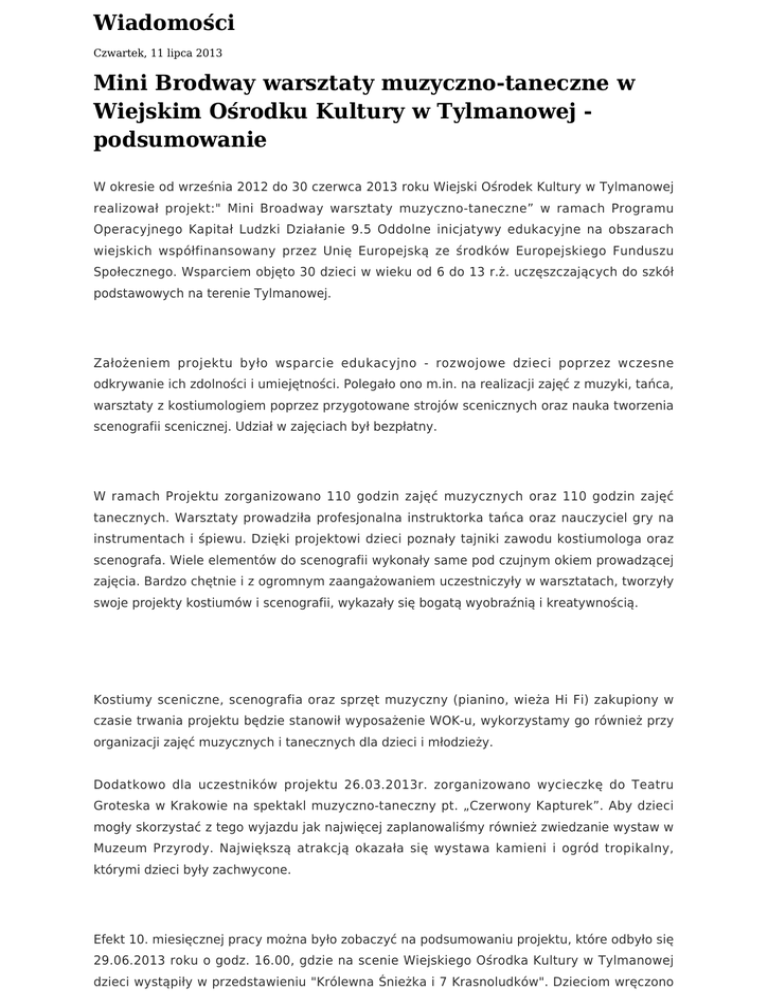 Wiadomości Czwartek, 11 lipca 2013 Mini Brodway warsztaty muzyczno-taneczne w Wiejskim Ośrodku Kultury w Tylmanowej podsumowanie W okresie od września 2012 do 30 czerwca 2013 roku Wiejski Ośrodek Kultury w Tylmanowej realizował projekt:" Mini Broadway warsztaty muzyczno-taneczne” w ramach Programu Operacyjnego Kapitał Ludzki Działanie 9.5 Oddolne inicjatywy edukacyjne na obszarach wiejskich współfinansowany przez Unię Europejską ze środków Europejskiego Funduszu Społecznego. Wsparciem objęto 30 dzieci w wieku od 6 do 13 r.ż. uczęszczających do szkół podstawowych na terenie Tylmanowej. Założeniem projektu było wsparcie edukacyjno - rozwojowe dzieci poprzez wczesne odkrywanie ich zdolności i umiejętności. Polegało ono m.in. na realizacji zajęć z muzyki, tańca, warsztaty z kostiumologiem poprzez przygotowane strojów scenicznych oraz nauka tworzenia scenografii scenicznej. Udział w zajęciach był bezpłatny. W ramach Projektu zorganizowano 110 godzin zajęć muzycznych oraz 110 godzin zajęć tanecznych. Warsztaty prowadziła profesjonalna instruktorka tańca oraz nauczyciel gry na instrumentach i śpiewu. Dzięki projektowi dzieci poznały tajniki zawodu kostiumologa oraz scenografa. Wiele elementów do scenografii wykonały same pod czujnym okiem prowadzącej zajęcia. Bardzo chętnie i z ogromnym zaangażowaniem uczestniczyły w warsztatach, tworzyły swoje projekty kostiumów i scenografii, wykazały się bogatą wyobraźnią i kreatywnością. Kostiumy sceniczne, scenografia oraz sprzęt muzyczny (pianino, wieża Hi Fi) zakupiony w czasie trwania projektu będzie stanowił wyposażenie WOK-u, wykorzystamy go również przy organizacji zajęć muzycznych i tanecznych dla dzieci i młodzieży. Dodatkowo dla uczestników projektu 26.03.2013r. zorganizowano wycieczkę do Teatru Groteska w Krakowie na spektakl muzyczno-taneczny pt. „Czerwony Kapturek”. Aby dzieci mogły skorzystać z tego wyjazdu jak najwięcej zaplanowaliśmy również zwiedzanie wystaw w Muzeum Przyrody. Największą atrakcją okazała się wystawa kamieni i ogród tropikalny, którymi dzieci były zachwycone. Efekt 10. miesięcznej pracy można było zobaczyć na podsumowaniu projektu, które odbyło się 29.06.2013 roku o godz. 16.00, gdzie na scenie Wiejskiego Ośrodka Kultury w Tylmanowej dzieci wystąpiły w przedstawieniu "Królewna Śnieżka i 7 Krasnoludków". Dzieciom wręczono dyplomy ukończenia warsztatów muzyczno-tanecznych oraz baletki do tańca a dla przybyłych gości przygotowano skromny poczęstunek. W związku z dużym zainteresowaniem społeczności lokalnej tym spektaklem zorganizowano drugi występ 30.06.2013r. Katarzyna Ziajkiewicz GALERIA ZDJĘĆ