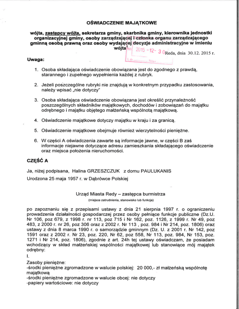 oŚWtADczENlE MAJĄTKoWE wóita, zasÚepcv wóita. sekretarza gminy, skarbnika gminy, kierownika jednostki organizacyinej gminy, osoby gminną osobą prawną oraz osoby Yvydaj tu 2- 3 on"aa, dnia 3o.rz. Uwaga: zor5 r. Ldt 1. osoba składająca oświadczenie obowiązana jest do zgodnego z prawdą, starannego i zupełnego wypełnienia kaŻdej z rubryk. 2' Jezeli poszczególne rubryki nie znajdują naleŻy wpisaó ,,nie dotyczy'' 3' osoba składająca oświadczenie obowiązana jest określićprzynależność poszczególnych składników majątkowych, dochodów i zobowiązań do majątku odrębnego i majątku objętego małżeńskąwspólnotą majątkową. 4' oświadczenie majątkowe dotyczy majątku w kraju iza granicą 5. oświadczenie majątkowe 6. W konkretnym przypadku zastosowania, obejmuje również wierzytelności pieniężne W częściA oświadczenia zawaĺte są informacje jawne, w częściB zaś informacje niejawne dotyczące adresu zamieszkania składającego oświadczenie oraz miejsca połoŹenia nieruchomości. czĘŚl A Ja, niŻej podpisana, Halina GRZESZCZUK z domu PAULUKANIS Urodzona 25 mĄa 1957 r. w Dąbrówce Polskiej Urząd Miasta Redy - zastępca burmistrza (miejsce zatrudnienia, stanowisko lub funkcja) z dnia 21 sierpnia 1997 r' o ograniczeniu prowadzenia działalnoŚci gospodarczej przez osoby pełniące funkcje publiczne (Dz.U. Nr 106, poz679, z 1998 r. nr 113,po2715a Nr 162, poz. 1126,21999 r. Nr49, poz 483, z 2000 r. nr 26, poz 306 oraz z 2002 r. Nr 1 13 , poz. 984 i Nr 214, poz. 1806) oraz ustawy z dnia 8 marca 1990 r' o samorządzie gminnym (Dz. U' z2001 r. Nr 142, poz 1591 orazz2002 r. Nr23, po2.220, Nr62, poz 558, Nr 113,po2.984, Nr 153, poz. 1271 i Nr 214, poz. 1806), zgodnie z art. 24h tą ustawy oŚwiadczam, Że posiadam wchodzący w skład małŻeńskiej wspólności majątkowej lub stanowiące mój majątek po zapoznaniu się z przepisami ustawy odrębny: !. Zasoby pienięŻne: -środki pieniężne zgromadzone W walucie polskiej: 20 000,- zł małŻeńską wspólnotę majątkową -środki pienięŻne zgromadzone W walucie obcej: nie dotyczy -papiery wartościowe: nie dotyczy !!. 1' Dom o powierzchni użytkowej 181,5 m2 na działce o powierzchni 1 546 m2 o wartoŚci ok. 600 000,- zł ' tyiluł prawny: małŻeńska wspólnośó majątkowa 2. Mieszkanie o powierzchni: a) 36,0 ffi', o wartości: ok. 140 000,00zł..' ' tytuł prawny: małżeńska wspólnośó majątkowa b) 52,0 ffi' , o wartości;ok' 420 000,00zł'. '. týuł prawny: małżeńska wspólnoŚć majątkowa do 2l3 (współwłasnośćz synem) 3. Gospodarstwo rolne: .... nie dotyczy..... rodzĄ gospodarstw; ... nie dotyczy.'., powierzchnia: .. nie doýczy.., o wartości: .. nie dotyczy..., rodzaj zabudowy: .. nie dotyczy...., tytuł prawny: .. nie dotyczy.''', Z tego týułu osĺągnęłamw roku ubiegłym przychód i dochód w wysokości nie dotyczy 4' lnne nieruchomości: a) lokal biurowy o powierzchni 41,O m2, o wartości: ok. 160 ooo,oO prawny: małżeńska wspólność majątkowa zł tytuł b) działka rzemieślnicza o powierzchni 1456 ffi2, c) o wartości: ok' 280 000,00 zł tytuł prawny: małżeńska wspólność majątkowa do % (współwłasność) budynek garaŻowy 2 - stanowiskowy o powierzchni 31,65 m2, o wartości: ok. 20 000,00 zł tytuł prawny: małŻeńska wspólność majątkowa il1. Posiadam udziały w spółkach handlowych -należy podać liczbę i emitenta udziałów: ..nie dotyczy .. udziaý te stanowią pakiet większy niŻ 10% udziałów w spółce: ''.nie dotyczy ... Z tego tytułu osiągnęłam w roku ubiegłym dochód w wysokości: .. nie dotyczy.... tv. Posiadam akcje w spółkach handlowych - naleŻy podać, liczbę i emitenta akcji: nie dotyczy akcje te stanowią pakiet większy niŻ 10% akcji w spółce: .nie dotyczy... Ztego tytułu osiągnęłam w roku ubiegłym dochód w wysokoścí:nie dotyczy V. Nabyłam (nabył mój małżonek, z wyłączeniem mienia przynaleŻnego do jego majątku odrębnego) od Skarbu Państwa, innej państwowej osoby prawnej, jednostki samorządu terytorialnego, ich związkőw lub od komunalnej osoby prawnej następujące mienie, które podlegało zbyciu w drodze przetargu _ naleŻy podać opis mienia i datę nabycia, od kogo: ..nie dotyczy..... vt. 1 . Prowad zę działalnośćgosp odarczą2 (naleŻy podać formę i przedmiot działalnoŚci) nie dotyczy - osobiście: nie dotyczy (działalnośó zawieszona 30.1 1.2015) - wspólnie z innymi osobami: nie dotyczy Ztego tytułu osiągnęłam od 01 -11'2015 roku a) przychód w wysokości144 684,- zł b) dochód w wysokości: 51 835,- zł 2. Zarządzam działalnoŚcią gospodarcząlub jestem przedstawicĺelem, pełnomocnikiem takiej działalności(należy podać formę prawną i przedmiot działalności):nie dotyczy - osobiścienie dotyczy - wspólnie z innymi osobami nie dotyczy. Z tego tytułu osiągnęłam w ubiegłym roku dochód w wysokości: nie dotyczy vil. W spółkach handlowych (nazwa, siedziba spółki): nie dotyczy jestem członkiern zarządu (od kiedy): nie dotyczy - jestem członkiem rady nadzorczej (od kiedy): nie dotyczy - jestem członkiem komisji rewizyjnej (od kiedy): nie dotyczy Ztego tytułu osiągnęłam w roku ubiegłym dochód w wysokości: nie dotyczy 1. - 2. W spółdzielniach: nie dotyczy jestem członkiem zarządu (od kiedy): nie dotyczy - jestem członkiem rady nadzorczej3 (od kiedy): nie dotyczy -jestem członkiem komĺsji rewizyjnej (od kiedy): nie dotyczy Z tego tytułu osĺągnęłamw roku ubiegłym dochód w wysokoŚci: nie dotyczy - 3. W fundacjach prowadzących działalnośćgospodarczą: nie dotyczy - jestem członkiem zarządu ( od kiedy): nie dotyczy jestem członkiem rady nadzorczď1( od kiedy): nie dotyczy - jestem członkiem komisji rewizyjnej (od kiedy): nie dotyczy Ztego tytułu osiągnęłam w roku ubiegłym dochód w wysokości: nĺe dotyczy - vill. !nne dochody osiągane z tytułu zatrudnienia lub innej działalnościzarobkowej lub z podaniem kwot uzyskiw