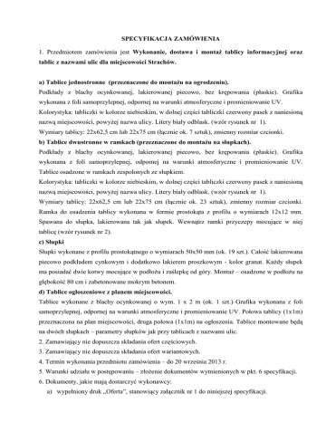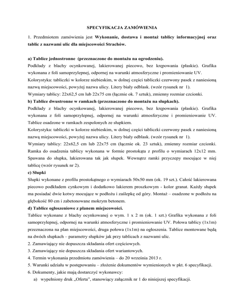 SPECYFIKACJA ZAMÓWIENIA 1. Przedmiotem zamówienia jest Wykonanie, dostawa i montaż tablicy informacyjnej oraz tablic z nazwami ulic dla miejscowości Strachów. a) Tablice jednostronne (przeznaczone do montażu na ogrodzeniu). Podkłady z blachy ocynkowanej, lakierowanej piecowo, bez krępowania (płaskie). Grafika wykonana z foli samoprzylepnej, odpornej na warunki atmosferyczne i promieniowanie UV. Kolorystyka: tabliczki w kolorze niebieskim, w dolnej części tabliczki czerwony pasek z naniesioną nazwą miejscowości, powyżej nazwa ulicy. Litery biały odblask. (wzór rysunek nr 1). Wymiary tablicy: 22x62,5 cm lub 22x75 cm (łącznie ok. 7 sztuk), zmienny rozmiar czcionki. b) Tablice dwustronne w ramkach (przeznaczone do montażu na słupkach). Podkłady z blachy ocynkowanej, lakierowanej piecowo, bez krępowania (płaskie). Grafika wykonana z foli samoprzylepnej, odpornej na warunki atmosferyczne i promieniowanie UV. Tablice osadzone w ramkach zespolonych ze słupkiem. Kolorystyka: tabliczki w kolorze niebieskim, w dolnej części tabliczki czerwony pasek z naniesioną nazwą miejscowości, powyżej nazwa ulicy. Litery biały odblask. (wzór rysunek nr 1). Wymiary tablicy: 22x62,5 cm lub 22x75 cm (łącznie ok. 23 sztuk), zmienny rozmiar czcionki. Ramka do osadzenia tablicy wykonana w formie prostokąta z profilu o wymiarach 12x12 mm. Spawana do słupka, lakierowana tak jak słupek. Wewnątrz ramki przyczepy mocujące w niej tablicę (wzór rysunek nr 2). c) Słupki Słupki wykonane z profilu prostokątnego o wymiarach 50x50 mm (ok. 19 szt.). Całość lakierowana piecowo podkładem cynkowym i dodatkowo lakierem proszkowym - kolor granat. Każdy słupek ma posiadać dwie kotwy mocujące w podłożu i zaślepkę od góry. Montaż – osadzone w podłożu na głębokość 80 cm i zabetonowane mokrym betonem. d) Tablice ogłoszeniowe z planem miejscowości. Tablice wykonane z blachy ocynkowanej o wym. 1 x 2 m (ok. 1 szt.) Grafika wykonana z foli samoprzylepnej, odpornej na warunki atmosferyczne i promieniowanie UV. Połowa tablicy (1x1m) przeznaczona na plan miejscowości, druga połowa (1x1m) na ogłoszenia. Tablice montowane będą na dwóch słupkach – parametry słupków jak przy tablicach z nazwami ulic. 2. Zamawiający nie dopuszcza składania ofert częściowych. 3. Zamawiający nie dopuszcza składania ofert wariantowych. 4. Termin wykonania przedmiotu zamówienia – do 20 września 2013 r. 5. Warunki udziału w postępowaniu – złożenie dokumentów wymienionych w pkt. 6 specyfikacji. 6. Dokumenty, jakie mają dostarczyć wykonawcy: a) wypełniony druk „Oferta”, stanowiący załącznik nr 1 do niniejszej specyfikacji. 7. Pracownikiem zamawiającego uprawnionym do bezpośredniego kontaktowania się z wykonawcami jest: Pobudkiewicz Patryk – pokój nr 17, tel. (25) 675 40 44 wew. 47 8. Oferty należy dostarczyć w terminie do dnia 26.07.2013 r. godz.1000. Oferty powinny być dostarczone faksem na nr (25) 675 43 84, przesyłką pocztową lub osobiście. 9. Sposób obliczania ceny: należy podać ceny jednostkowe tablic z nazwami ulic o wym. 22x62,5 cm oraz tablic z nazwami ulic o wym. 22x75 cm (w cenie tablicy należy uwzględnić cenę ramki oraz cenę jej montażu do słupka), a także cenę jednostkową słupka wraz z montażem w gruncie oraz cenę jednostkową tablicy ogłoszeniowej z planem miejscowości (w cenie tablicy należy uwzględnić cenę ramki oraz cenę jej montażu do słupka). Zamawiający przyjmie ceny jednostkowe do porównania ofert w odniesieniu do ilości przewidzianych w zamówieniu. 10. Rozliczenia pomiędzy zamawiającym a przyszłym wykonawcą odbywać będą się w złotych polskich. Dane Gminy Jadów do faktury: Gmina Jadów, ul. Jana Pawła II 17, 05-280 Jadów, Nr NIP 125-13-34-791. Płatność dokonana będzie w ciągu 14 dni na podstawie złożonej faktury na konto bankowe Wykonawcy po stwierdzeniu prawidłowości wykonania zamówienia przez odpowiedzialnego pracownika UG Jadów. 11. Kryterium wyboru oferty najkorzystniejszej będzie cena – 100%. 12. Z Wykonawcą, który złoży najkorzystniejszą ofertę zostanie podpisana umowa. 13. Postępowanie prowadzone jest na podstawie Zarządzenia nr 7/2009 Wójta Gminy Jadów z dnia 23 stycznia 2009 r. w sprawie wprowadzenia regulaminu udzielania zamówień publicznych o wartości nieprzekraczającej kwoty wyrażonej w złotych równowartości 14 000 euro netto. Jadów, 18 lipca 2013 r.