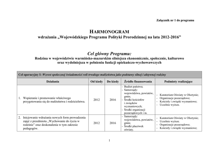 Załącznik nr 1 do programu HARMONOGRAM wdrażania „Wojewódzkiego Programu Polityki Prorodzinnej na lata 2012-2016” Cel główny Programu: Rodzina w województwie warmińsko-mazurskim silniejsza ekonomicznie, społecznie, kulturowo oraz wydolniejsza w pełnieniu funkcji opiekuńczo-wychowawczych Cel operacyjny I: Wzrost społecznej świadomości roli trwałego małżeństwa jako podstawy silnej i aktywnej rodziny Działania 1. Wspieranie i promowanie właściwego przygotowania się do małżeństwa i rodzicielstwa. 2. Inicjowanie wdrażania nowych form prowadzenia zajęć z przedmiotu „Wychowanie do życia w rodzinie” oraz doskonalenia w tym zakresie pedagogów. Od kiedy 2012 2012 Do kiedy 2016 2016 1 Źródło finansowania - Budżet państwa; - Samorządy: województwa, powiatów, gmin; - Środki kościołów i związków wyznaniowych; - Środki organizacji pozarządowych i in. - Samorządy: województwa, powiatów, gmin; - Środki placówek oświaty. Podmioty realizujące - Kuratorium Oświaty w Olsztynie; Organizacje pozarządowe; Kościoły i związki wyznaniowe; Uczelnie wyższe. - Kuratorium Oświaty w Olsztynie; Uczelnie wyższe. Organizacje pozarządowe; Kościoły i związki wyznaniowe; Działania Od kiedy Do kiedy 3. Propagowanie wydawnictw, stron internetowych, przekazów medialnych ukazujących prawidłowy model życia małżeńskiego. 2012 2016 4. Badania dotyczące świadomości przygotowania do małżeństwa. 2012 2016 Źródło finansowania - Samorządy: województwa, powiatów, gmin; - Środki organizacji pozarządowych i in. - UWM, Wydział Teologii – Nauki o Rodzinie. Podmioty realizujące - Samorządy: województwa, powiatów, gmin; - Kościoły i związki wyznaniowe; - Organizacje pozarządowe. - UWM, Wydział Teologii – Nauki o Rodzinie. Cel operacyjny II: Wzrost społecznej świadomości roli rodziny jako podstawowego środowiska funkcjonowania człowieka 1. Inicjowanie opracowywania gminnych programów wspierania rodziny i realizacji polityki prorodzinnej. 2012 2016 - Samorządy: województwa, gmin. 2. Inicjowanie opracowywania powiatowych programów wspierania rodziny, rozwoju systemu pieczy zastępczej i realizacji polityki prorodzinnej. 2012 2016 - Samorządy: województwa, powiatów. 2016 - Samorządy: województwa, powiatów, gmin; - Środki organizacji pozarządowych i in. 3. Wspieranie rozwoju inicjatyw prorodzinnych w zakresie pomocy w prawidłowym funkcjonowaniu rodziny i ukazywaniu pozytywnych wzorców. 4. Promowanie i współorganizowanie konkursów dotyczących rodziny. 5. Propagowanie przez Samorząd Województwa wydawnictw, stron internetowych, przekazów medialnych ukazujących prawidłowy model życia rodzinnego. 2012 2012 2012 2016 2016 2 - Samorządy: województwa, powiatów, gmin; - Środki organizacji pozarządowych i in. - Samorządy: województwa, powiatów, gmin; - Środki organizacji pozarządowych i in. - - Samorządy: województwa, gmin; Kościoły i związki wyznaniowe; Organizacje pozarządowe. Samorządy: województwa, powiatów, Kościoły i związki wyznaniowe; Organizacje pozarządowe. Samorządy i ich jednostki organizacyjne: województwa, powiatów, gmin; Kuratorium Oświaty w Olsztynie; Kościoły i związki wyznaniowe; Organizacje pozarządowe. - Samorządy i ich jednostki organizacyjne: województwa, powiatów, gmin. - Samorządy: województwa, powiatów, gmin; - Kościoły i związki wyznaniowe; - Organizacje pozarządowe. Działania Od kiedy Do kiedy Źródło finansowania Podmioty realizujące Cel operacyjny III: Wzrost umiejętności rodziców w procesie wychowania dzieci i młodzieży 1. Inicjowanie, propagowanie i współudział w tworzeniu „Szkół dla rodziców i wychowawców”. 2. Propagowanie tworzenia placówek wsparcia dziennego prowadzonych w formie opiekuńczej, specjalistycznej i w formie pracy podwórkowej, realizowanej przez wychowawcę oraz propagowanie współuczestniczenia rodziców w zajęciach. 3. Promowanie współpracy lokalnych podmiotów z rodzicami m. in. przedszkoli, szkół, parafii, ośrodków kultury, sportu w sprawach wychowawczych. 4. Promowanie tworzenia klubów i grup wsparcia dla rodziców. 2012 2012 2012 2012 2016 - Samorządy: województwa, powiatów, gmin; - Środki organizacji pozarządowych i in. - Samorządy i ich jednostki organizacyjne: województwa, powiatów, gmin; - Kościoły i związki wyznaniowe; - Organizacje pozarządowe. 2016 - Budżet Ministerstwa Pracy i Polityki Społecznej; - Środki UE. - Samorządy i ich jednostki organizacyjne: województwa, powiatów, gmin; - Kościoły i związki wyznaniowe; - Organizacje pozarządowe. 2016 2016 3 - Budżet Ministerstwa Pracy i Polityki Społecznej i Ministerstwa Edukacji Narodowej; - Samorządy: województwa, powiatów, gmin; - Środki placówek oświaty; - Środki organizacji pozarządowych. - Samorządy: województwa, powiatów, gmin; - Środki spółdzielni mieszkaniowych, parafii, organizacji pozarz. i in. - Samorządy i ich jednostki organizacyjne: województwa, powiatów, gmin; - Kuratorium Oświaty w Olsztynie; - Kościoły i związki wyznaniowe; - Organizacje pozarządowe. - Samorządy i ich jednostki organizacyjne: województwa, powiatów, gmin; - Kościoły i związki wyznaniowe; - Organizacje pozarządowe. Działania Od kiedy Do kiedy Źródło finansowania Podmioty realizujące Cel operacyjny IV: Rodzina bardziej samodzielna ekonomicznie oraz aktywniejsza społecznie i zawodowo 1. Promowanie aktywności młodego pokolenia, m. in. w ramach wolontariatu – np. Samorządowy Konkurs „Ośmiu Wspaniałych”. 2. Wspierania rozwoju podmiotów umożliwiających aktywne spędzanie wolnego czasu, form aktywności w ramach dostępnej bazy oraz organizacji zajęć pozaszkolnych dla dzieci i młodzieży, zwłaszcza na terenach wiejskich. 3. Współpraca z jednostkami organizacyjnymi pomocy społecznej, dotycząca form aktywizacji zawodowej rodzin oraz ukazywania zagrożeń związanych z podejmowaniem pracy w „sz