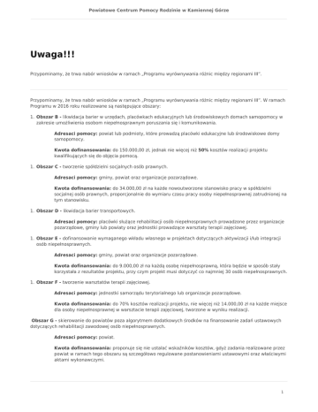 Powiatowe Centrum Pomocy Rodzinie w Kamiennej Górze Uwaga!!! Przypominamy, że trwa nabór wniosków w ramach „Programu wyrównywania różnic między regionami III”. Przypominamy, że trwa nabór wniosków w ramach „Programu wyrównywania różnic między regionami III”. W ramach Programu w 2016 roku realizowane są następujące obszary: 1. Obszar B - likwidacja barier w urzędach, placówkach edukacyjnych lub środowiskowych domach samopomocy w zakresie umożliwienia osobom niepełnosprawnym poruszania się i komunikowania. Adresaci pomocy: powiat lub podmioty, które prowadzą placówki edukacyjne lub środowiskowe domy samopomocy. Kwota dofinansowania: do 150.000,00 zł, jednak nie więcej niż 50% kosztów realizacji projektu kwalifikujących się do objęcia pomocą. 1. Obszar C - tworzenie spółdzielni socjalnych osób prawnych. Adresaci pomocy: gminy, powiat oraz organizacje pozarządowe. Kwota dofinansowania: do 34.000,00 zł na każde nowoutworzone stanowisko pracy w spółdzielni socjalnej osób prawnych, proporcjonalnie do wymiaru czasu pracy osoby niepełnosprawnej zatrudnionej na tym stanowisku. 1. Obszar D - likwidacja barier transportowych. Adresaci pomocy: placówki służące rehabilitacji osób niepełnosprawnych prowadzone przez organizacje pozarządowe, gminy lub powiaty oraz jednostki prowadzące warsztaty terapii zajęciowej. 1. Obszar E - dofinansowanie wymaganego wkładu własnego w projektach dotyczących aktywizacji i/lub integracji osób niepełnosprawnych. Adresaci pomocy: gminy, powiat oraz organizacje pozarządowe. Kwota dofinansowania: do 9.000,00 zł na każdą osobę niepełnosprawną, która będzie w sposób stały korzystała z rezultatów projektu, przy czym projekt musi dotyczyć co najmniej 30 osób niepełnosprawnych. 1. Obszar F - tworzenie warsztatów terapii zajęciowej. Adresaci pomocy: jednostki samorządu terytorialnego lub organizacje pozarządowe. Kwota dofinansowania: do 70% kosztów realizacji projektu, nie więcej niż 14.000,00 zł na każde miejsce dla osoby niepełnosprawnej w warsztacie terapii zajęciowej, tworzone w wyniku realizacji. Obszar G - skierowanie do powiatów poza algorytmem dodatkowych środków na finansowanie zadań ustawowych dotyczących rehabilitacji zawodowej osób niepełnosprawnych. Adresaci pomocy: powiat. Kwota dofinansowania: proponuje się nie ustalać wskaźników kosztów, gdyż zadania realizowane przez powiat w ramach tego obszaru są szczegółowo regulowane postanowieniami ustawowymi oraz właściwymi aktami wykonawczymi. 1 Powiatowe Centrum Pomocy Rodzinie w Kamiennej Górze Projektodawcy ubiegający się o dofinansowanie nie mogą posiadać: 1. wymagalnych zobowiązań wobec PFRON; 2. zaległości w obowiązkowych wpłatach na PFRON; 3. wymagalnych zobowiązań wobec Zakładu Ubezpieczeń Społecznych i Urzędu Skarbowego. Wnioski dotyczące obszarów B, C, D, F i G programu przyjmowane będą w terminie od 08 marca do 20 kwietnia 2016 roku. Wnioski dotyczące obszaru E programu przyjmowane będą w terminie od 08 marca do 30 listopada 2016 roku. Szczegółowe informacje dotyczące „Programu wyrównywania różnic między regionami III”, w tym: 1. treść „Programu wyrównywania różnic między regionami III”; 2. kierunki działań oraz warunki brzegowe obowiązujące realizatorów „Programu wyrównywania różnic między regionami III” w 2016 roku wraz z załącznikami; 3. procedury realizacji „Programu wyrównywania różnic między regionami III” wraz z załącznikami; 4. aktualne komunikaty dotyczące Programu; dostępne są na stronie www.pfron.org.pl; zakładka: Programy i zadania PFRON; Programy i zadania realizowane obecnie. Informujemy, że: W przypadku obszarów programu B, C, D, F i G projektodawca składa wniosek do Powiatowego Centrum Pomocy Rodzinie w Kamiennej Górze, ul. H.Sienkiewicza 6A zgodnie z Zasadami dotyczącymi wyboru, dofinansowania i rozliczania projektów dotyczących obszarów B, C, D, F i G wymienionego programu. W przypadku obszaru E programu projektodawca składa wniosek bezpośrednio do Dolnośląskiego Oddziału PFRON we Wrocławiu ul. Szewska 6/7, zgodnie z Zasadami dotyczącymi wyboru, dofinansowania i rozliczania projektów dotyczących obszaru E 'Programu wyrównywania różnic między regionami III'. 2