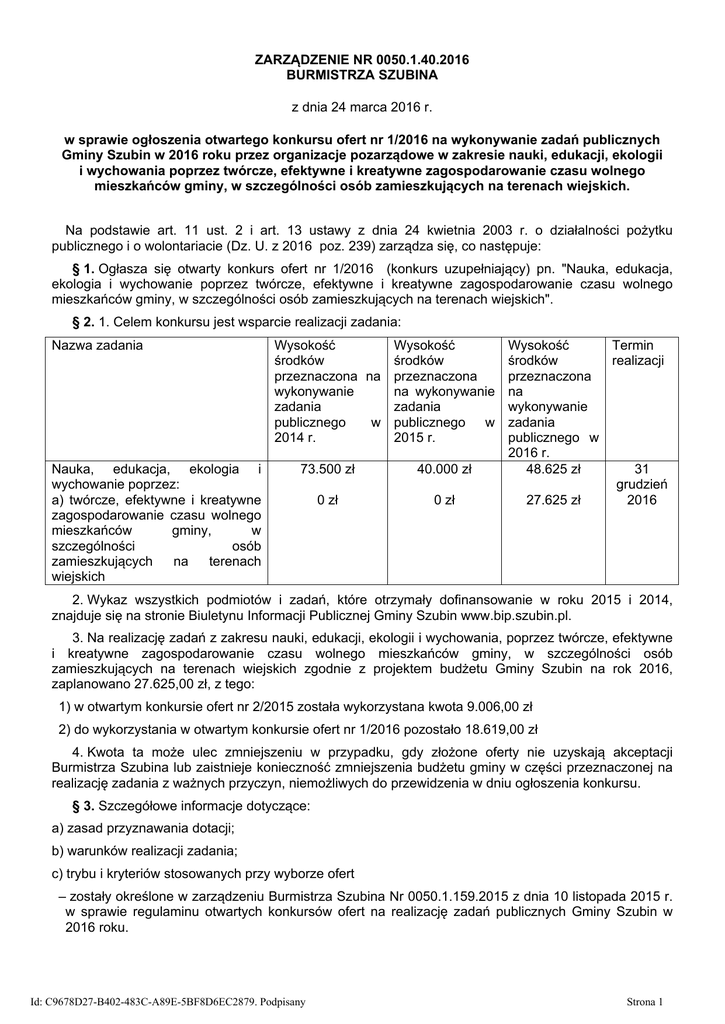 ZARZĄDZENIE NR 0050.1.40.2016 BURMISTRZA SZUBINA z dnia 24 marca 2016 r. w sprawie ogłoszenia otwartego konkursu ofert nr 1/2016 na wykonywanie zadań publicznych Gminy Szubin w 2016 roku przez organizacje pozarządowe w zakresie nauki, edukacji, ekologii i wychowania poprzez twórcze, efektywne i kreatywne zagospodarowanie czasu wolnego mieszkańców gminy, w szczególności osób zamieszkujących na terenach wiejskich. Na podstawie art. 11 ust. 2 i art. 13 ustawy z dnia 24 kwietnia 2003 r. o działalności pożytku publicznego i o wolontariacie (Dz. U. z 2016 poz. 239) zarządza się, co następuje: § 1. Ogłasza się otwarty konkurs ofert nr 1/2016 (konkurs uzupełniający) pn. "Nauka, edukacja, ekologia i wychowanie poprzez twórcze, efektywne i kreatywne zagospodarowanie czasu wolnego mieszkańców gminy, w szczególności osób zamieszkujących na terenach wiejskich". § 2. 1. Celem konkursu jest wsparcie realizacji zadania: Nazwa zadania Nauka, edukacja, ekologia i wychowanie poprzez: a) twórcze, efektywne i kreatywne zagospodarowanie czasu wolnego mieszkańców gminy, w szczególności osób zamieszkujących na terenach wiejskich Wysokość Wysokość środków środków przeznaczona na przeznaczona wykonywanie na wykonywanie zadania zadania publicznego w publicznego w 2014 r. 2015 r. 73.500 zł 40.000 zł 0 zł 0 zł Wysokość Termin środków realizacji przeznaczona na wykonywanie zadania publicznego w 2016 r. 48.625 zł 31 grudzień 27.625 zł 2016 2. Wykaz wszystkich podmiotów i zadań, które otrzymały dofinansowanie w roku 2015 i 2014, znajduje się na stronie Biuletynu Informacji Publicznej Gminy Szubin www.bip.szubin.pl. 3. Na realizację zadań z zakresu nauki, edukacji, ekologii i wychowania, poprzez twórcze, efektywne i kreatywne zagospodarowanie czasu wolnego mieszkańców gminy, w szczególności osób zamieszkujących na terenach wiejskich zgodnie z projektem budżetu Gminy Szubin na rok 2016, zaplanowano 27.625,00 zł, z tego: 1) w otwartym konkursie ofert nr 2/2015 została wykorzystana kwota 9.006,00 zł 2) do wykorzystania w otwartym konkursie ofert nr 1/2016 pozostało 18.619,00 zł 4. Kwota ta może ulec zmniejszeniu w przypadku, gdy złożone oferty nie uzyskają akceptacji Burmistrza Szubina lub zaistnieje konieczność zmniejszenia budżetu gminy w części przeznaczonej na realizację zadania z ważnych przyczyn, niemożliwych do przewidzenia w dniu ogłoszenia konkursu. § 3. Szczegółowe informacje dotyczące: a) zasad przyznawania dotacji; b) warunków realizacji zadania; c) trybu i kryteriów stosowanych przy wyborze ofert – zostały określone w zarządzeniu Burmistrza Szubina Nr 0050.1.159.2015 z dnia 10 listopada 2015 r. w sprawie regulaminu otwartych konkursów ofert na realizację zadań publicznych Gminy Szubin w 2016 roku. Id: C9678D27-B402-483C-A89E-5BF8D6EC2879. Podpisany Strona 1 § 4. 1. Zadanie może być realizowane w różnych formach, w szczególności przez: 1) prowadzenie zajęć edukacyjnych, wychowawczych, dydaktycznych i kulturalnych, 2) organizację, prowadzenie i uczestnictwo w kursach, spotkaniach, w zakresie prowadzonego przedsięwzięcia, 3) zakup niezbędnych w procesie realizacji zadania sprzętów, towarów, materiałów, pomocy naukowych i innych usług. 2. W ramach konkursu uzupełniającego nie będą pokrywane wszelkiego rodzaju formy wypoczynku (rajdy piesze, rowerowe, biwaki, wycieczki). § 5. Warunkiem przystąpienia do konkursu jest złożenie oferty realizacji zadania wg wzoru określonego w załączniku do rozporządzenia Ministra Pracy i Polityki Społecznej z dnia 15 grudnia 2010 r. w sprawie wzoru oferty i ramowego wzoru umowy dotyczącej realizacji zadania publicznego oraz wzoru sprawozdania z wykonania tego zadania (Dz. U. z 2011 r. Nr 6, poz. 25) w terminie do dnia 22 kwietnia 2016 r. na niżej podany adres: Urząd Miejski w Szubinie przy ulicy Kcyńskiej 12, 89-200 Szubin. § 6. Ostateczne rozstrzygnięcie konkursu nastąpi nie później, niż w ciągu 45 dni od ostatniego dnia przyjmowania ofert. § 7. Zarządzenie wchodzi w życie z dniem podpisania. Burmistrz Szubina Artur Michalak Id: C9678D27-B402-483C-A89E-5BF8D6EC2879. Podpisany Strona 2 Uzasadnienie Celem ogłoszenia otwartego konkursu ofert nr 1/2016 pn. "Nauka, edukacja, ekologia i wychowanie poprzez twórcze, efektywne i kreatywne zagospodarowanie czasu wolnego mieszkańców gminy, w szczególności osób zamieszkujących na terenach wiejskich" jest wyłonienie ofert i zlecenie podmiotom prowadzącym działalność pożytku publicznego realizacji zadań publicznych Gminy Szubin w zakresie nauki, edukacji, ekologii i wychowania w 2016 roku. Podstawą prawną ogłoszenia konkursu jest ustawa z dnia 24 kwietnia 2003 r. o działalności pożytku publicznego i o wolontariacie (Dz. U. z 2016 r. poz. 239) oraz uchwała nr XIII/114/15 Rady Miejskiej w Szubinie z dnia 29 września 2015 r. w sprawie uchwalenia “Rocznego programu współpracy Gminy Szubin z organizacjami pozarządowymi oraz innymi organizacjami pożytku publicznego na rok 2016”. Konkurs ma służyć realizacji zadania, które polega na wielopłaszczyznowej pomocy dzieciom, prowadzeniu zajęć edukacyjno – wychowawczych poza strukturą szkolną pogłębiających wiedzę, wpływających na rozwój intelektualny, kształtujących odpowiednie zachowanie i aktywność w grupie, kreujących umiejętność współpracy przy jednoczesnym zachowaniu własnego światopoglądu. W związku z rozstrzygnięciem konkursów i niewykorzystaniem w całości środków na realizację konkursów nr 2/2015 i 6/2015 Burmistrz Szubina podjął decyzję o ogłoszeniu konkursu uzupełniającego w celu wykorzystania zaplanowanych środków w budżecie gminy na 2016 rok. Na realizację zadań z zakresu nauki, edukacji, ekologii i wychowania, poprzez twórcze, efektywne i kreatywne zagospodarowanie czasu wolnego mieszkańców gminy, w szczególności osób zamieszkujących na terenach wiejskich w 2016 r