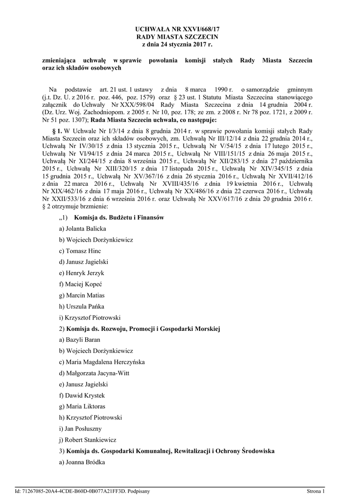 UCHWAŁA NR XXVI/668/17 RADY MIASTA SZCZECIN z dnia 24 stycznia 2017 r. zmieniająca uchwałę w sprawie oraz ich składów osobowych powołania komisji stałych Rady Miasta Szczecin Na podstawie art. 21 ust. 1 ustawy z dnia 8 marca 1990 r. o samorządzie gminnym (j.t. Dz. U. z 2016 r. poz. 446, poz. 1579) oraz § 23 ust. 1 Statutu Miasta Szczecina stanowiącego załącznik do Uchwały Nr XXX/598/04 Rady Miasta Szczecina z dnia 14 grudnia 2004 r. (Dz. Urz. Woj. Zachodniopom. z 2005 r. Nr 10, poz. 178; ze zm. z 2008 r. Nr 78 poz. 1721, z 2009 r. Nr 51 poz. 1307); Rada Miasta Szczecin uchwala, co następuje: § 1. W Uchwale Nr I/3/14 z dnia 8 grudnia 2014 r. w sprawie powołania komisji stałych Rady Miasta Szczecin oraz ich składów osobowych, zm. Uchwałą Nr III/12/14 z dnia 22 grudnia 2014 r., Uchwałą Nr IV/30/15 z dnia 13 stycznia 2015 r., Uchwałą Nr V/54/15 z dnia 17 lutego 2015 r., Uchwałą Nr VI/94/15 z dnia 24 marca 2015 r., Uchwałą Nr VIII/151/15 z dnia 26 maja 2015 r., Uchwałą Nr XI/244/15 z dnia 8 września 2015 r., Uchwałą Nr XII/283/15 z dnia 27 października 2015 r., Uchwałą Nr XIII/320/15 z dnia 17 listopada 2015 r., Uchwałą Nr XIV/345/15 z dnia 15 grudnia 2015 r., Uchwałą Nr XV/367/16 z dnia 26 stycznia 2016 r., Uchwałą Nr XVII/412/16 z dnia 22 marca 2016 r., Uchwałą Nr XVIII/435/16 z dnia 19 kwietnia 2016 r., Uchwałą Nr XIX/462/16 z dnia 17 maja 2016 r., Uchwałą Nr XX/486/16 z dnia 22 czerwca 2016 r., Uchwałą Nr XXII/533/16 z dnia 6 września 2016 r. oraz Uchwałą Nr XXV/617/16 z dnia 20 grudnia 2016 r. § 2 otrzymuje brzmienie: „1) Komisja ds. Budżetu i Finansów a) Jolanta Balicka b) Wojciech Dorżynkiewicz c) Tomasz Hinc d) Janusz Jagielski e) Henryk Jerzyk f) Maciej Kopeć g) Marcin Matias h) Urszula Pańka i) Krzysztof Piotrowski 2) Komisja ds. Rozwoju, Promocji i Gospodarki Morskiej a) Bazyli Baran b) Wojciech Dorżynkiewicz c) Maria Magdalena Herczyńska d) Małgorzata Jacyna-Witt e) Janusz Jagielski f) Dawid Krystek g) Maria Liktoras h) Krzysztof Piotrowski i) Jan Posłuszny j) Robert Stankiewicz 3) Komisja ds. Gospodarki Komunalnej, Rewitalizacji i Ochrony Środowiska a) Joanna Bródka Id: 71267085-20A4-4CDE-B60D-0B077A21FF3D. Podpisany Strona 1 b) Witold Dąbrowski c) Wojciech Dorżynkiewicz d) Marek Duklanowski e) Władysław Dzikowski f) Małgorzata Gadomska g) Maria Magdalena Herczyńska h) Małgorzata Jacyna-Witt i) Henryk Jerzyk j) Jan Posłuszny k) Robert Stankiewicz l) Łukasz Tyszler m) Michał Wilkocki n) Grażyna Zielińska 4) Komisja ds. Budownictwa i Mieszkalnictwa a) Mariusz Bagiński b) Jolanta Balicka c) Witold Dąbrowski d) Marek Duklanowski e) Władysław Dzikowski f) Małgorzata Jacyna-Witt g) Dawid Krystek h) Krzysztof Piotrowski i) Jan Posłuszny j) Michał Wilkocki k) Grażyna Zielińska 5) Komisja ds. Edukacji a) Jolanta Balicka b) Bazyli Baran c) Paweł Bartnik d) Stefania Biernat e) Joanna Bródka f) Wojciech Dorżynkiewicz g) Marek Duklanowski h) Małgorzata Gadomska i) Małgorzata Jacyna-Witt j) Marek Kolbowicz k) Maria Liktoras l) Renata Łażewska m) Marcin Matias n) Urszula Pańka Id: 71267085-20A4-4CDE-B60D-0B077A21FF3D. Podpisany Strona 2 o) Grażyna Zielińska 6) Komisja ds. Kultury a) Jolanta Balicka b) Bazyli Baran c) Paweł Bartnik d) Stefania Biernat e) Joanna Bródka f) Wojciech Dorżynkiewicz g) Małgorzata Gadomska h) Małgorzata Jacyna-Witt i) Marek Kolbowicz j) Maria Liktoras k) Renata Łażewska l) Rafał Niburski m) Urszula Pańka n) Jan Posłuszny o) Robert Stankiewicz p) Jan Stopyra q) Grażyna Zielińska 7) Komisja ds. Sportu a) Bazyli Baran b) Henryk Jerzyk c) Marek Kolbowicz d) Dawid Krystek e) Rafał Niburski f) Urszula Pańka g) Jan Posłuszny h) Jan Stopyra 8) Komisja ds. Zdrowia i Pomocy Społecznej a) Bazyli Baran b) Stefania Biernat c) Maria Magdalena Herczyńska d) Małgorzata Jacyna-Witt e) Marek Kolbowicz f) Dawid Krystek g) Renata Łażewska h) Marcin Matias i) Łukasz Tyszler 9) Komisja ds. Bezpieczeństwa Publicznego i Samorządności a) Paweł Bartnik Id: 71267085-20A4-4CDE-B60D-0B077A21FF3D. Podpisany Strona 3 b) Stefania Biernat c) Witold Dąbrowski d) Marek Duklanowski e) Władysław Dzikowski f) Tomasz Hinc g) Henryk Jerzyk h) Maciej Kopeć i) Krzysztof Piotrowski j) Jan Stopyra 10) Komisja ds. Inicjatyw Społecznych a) Joanna Bródka b) Wojciech Dorżynkiewicz c) Małgorzata Gadomska d) Maria Magdalena Herczyńska e) Henryk Jerzyk f) Maria Liktoras g) Rafał Niburski h) Robert Stankiewicz i) Jan Stopyra j) Łukasz Tyszler 11) Komisja Rewizyjna a) Joanna Bródka b) Maria Magdalena Herczyńska c) Henryk Jerzyk d) Renata Łażewska e) Marcin Matias f) Rafał Niburski g) Jan Stopyra”. § 2. Uchwała wchodzi w życie z dniem podjęcia. Przewodniczący Rady Miasta Szczecin Mariusz Bagiński Id: 71267085-20A4-4CDE-B60D-0B077A21FF3D. Podpisany Strona 4