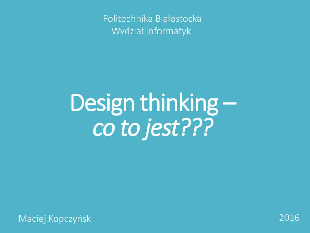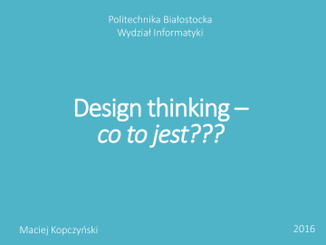 Politechnika Białostocka Wydział Informatyki Design thinking – co to jest??? Maciej Kopczyński 2016 Torba ryżu:) Design thinking „Matching people’s needs with what is technologically feasible and viable as a business strategy” Tim Brown, IDEO Design thinking Metoda projektowania skoncentrowana na wykorzystaniu informacji na temat ludzi: Czego chcą, czego potrzebują i co lubią! Pozwala skonfrontować to czego ludzie chcą z tym co da się wykonać i opracować realny model biznesowy, który dostarcza wartości dla klientów i monetyzuje rozwiązanie. Siła Design Thinking to kreatywność multidyscyplinarna Design vs Design Thinking DESIGN Kiedyś projektant miał zaprojektować coś nowego co się spodoba zamawiającemu projekt. DESIGN THINKING Teraz projektant jest proszony o to, aby zaprojektować coś odpowiadającego potrzebom konsumentów. Prosty schemat Inspiration Identyfikacja problemu: Coś nie jest doskonałe Przykład: • Personel szpitala zauważył, że źle działa przepływ informacji na styku zmian pielęgniarek i lekarzy • Problem: Opieka nad pacjentem jest niedoskonała, pielęgniarki nie mają systemu katalogowania informacji o pacjencie przez co dane o pacjentach są niekompletne. Ideation Szybkie prototypowanie i ciągłe zmiany. Cechy prototypu: • Tani, prosty i szybki • „Namacalny” • Poddany recenzji • Ciągłe zmiany Implementation Weź najlepszy prototyp i użyj go w praktyce! Design thinking Emphatize Wejście w skórę użytkownika Głębokie zrozumienie potrzeb i problemów użytkownika. Rozpoznanie czynników mających wpływ na wybory i zachowania. Narzędzia: mapy empatii, wywiady, kontakt z ludźmi. Define Definiowanie właściwego problemu Synteza zebranych informacji Przełamanie myślenia i przyzwyczajeń Praca w zespole Szybkość działania niewskazana Czy użytkownik potrzebuje tańszego inkubatora czy może tańszego sposobu na podtrzymanie ciepłoty ciała niemowlęcia? Ideate Generowanie pomysłów Duża ilość rozwiązań Odwaga i nieszablonowość Brak krytyki! Na koniec – ocena i demokratyczny wybór Narzędzia: burza mózgów, karteczki typu POST-IT, pisaki Ideate Prototype Budowanie prototypów Wytworzenie realnego prototypu Szybko i tanio To nie produkt końcowy! Narzędzia: wszystko co wpadnie w ręce:) Prototype Test Testowanie Sprawdzanie prototypu Realne środowisko Prawdziwi klienci Bardzo ważny! Dziękuję! Pytania? Kontakt: [email protected]