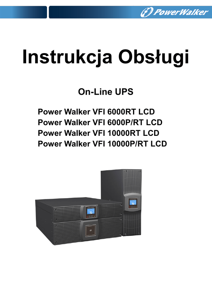 Instrukcja Obsługi On-Line UPS Power Walker VFI 6000RT LCD Power Walker VFI 6000P/RT LCD Power Walker VFI 10000RT LCD Power Walker VFI 10000P/RT LCD Uninterruptible Power Supply System Contents 1. Wprowadzenie ......................................................................................... 1 2. WAŻNE INSTRUKCJE DOTYCZĄCE BEZPIECZEŃSTWA ................... 4 2.1 Instalacja ............................................................................................ 4 2.2 Przygotowanie .................................................................................... 5 2.3 Konserwacje, usterki, serwis .............................................................. 6 2.4 Transport ............................................................................................ 7 2.5 Przygotowywanie................................................................................ 7 2.6 Standardy ........................................................................................... 8 3. Instalacja .................................................................................................. 8 3.1 Inspekcja sprzętu ............................................................................... 9 3.2 Rozpakowanie .................................................................................... 9 3.3 UPS Panel Tylni................................................................................ 12 3.4 UPS Panel Przedni ........................................................................... 13 3.5 Rackmount Setup ............................................................................. 14 3.6 Tower Setup ...................................................................................... 18 3.7 Instalacja UPS’a z AC na wejściu..................................................... 19 4. Podłączenie kabli zasiania & uruchomienie ...................................... 21 4.1 Dostęp do terminalu ......................................................................... 22 4.2 Połączenie powszechnych urządzeń wejściowych .......................... 22 4.3 Połączenie urządzeń z sperowanym wejściem ................................ 23 4.4 Połączenie Frequency converter ...................................................... 24 4.5 UPS Startup ...................................................................................... 24 4.6 Połączenie równoległe UPSów ........................................................ 25 5. Operation ........................................................................................... 2531 5.1 Panel wyświetlacza .......................................................................... 31 5.2 Operating mode ................................................................................ 33 5.3 Włączanie i wyłączanie UPS ............................................................ 36 5.4 LCD operation .................................................................................. 38 6. Konserwacja UPS ................................................................................. 46 6.1 UPS and Battery Care ...................................................................... 46 6.2 Transport UPS .................................................................................. 46 6.3 Przechowywanie UPS i Baterii ......................................................... 47 6.4 Testowanie Baterii ............................................................................ 47 6.5 Recykling zużytych baterii ................................................................ 48 7. Specifications........................................................................................ 48 2 8. Rozwiązywanie problemów ................................................................. 50 8.1 Typowe Alarmy ................................................................................. 50 9. Komunikacja.......................................................................................... 54 9.1 RS-232 i USB ................................................................................... 54 9.2 Network Management Card (Optional) ............................................ 56 9.3 UPS Management Software ............................................................. 56 9.4 REPO Function................................................................................. 57 1. Wprowadzenie Seria Online R/T z technologią podwójnej konwersji. Zapewnia perfekcyjną ochronę szczególnie komponentom komputerowym, systemom komunikacyjnym itp. Chroni wrażliwe urządzenia przed podstawowymi problemami sieci np. awaria zasilania, zaniki napięcia, przepięcia, zakłócenia sieci. Przerwy z dostawą sieci mogą się pojawić w najmniej oczekiwanym momencie, a jakość sieci jest nie do przewidzenia. Może to spowodować uszkodzenie urządzenia, utratę niezapisanych plików itp. wszystkie te problemy rozwiąże UPS Online R/T. Online R/T UPS as Rack installation: Figure 1-1: Online R/T 6K UPS Figure 1-2: Online R/T 10K UPS 1 Online R/T UPS as Tower installation. Figure 1-3: Online R/T 6K UPS Figure 1-4: Online R/T 10K UPS UPS zapewnia najwyższą wydajność i niezawodność a unikalnymi cechami zasilacza UPS są: UPS Online z czystą sinusoidą na wyjściu. True online double-conversion technology z wysoką gęstością mocy, niezależność częstotliwościowa, i kompatybilność pracy z generatorem. Intelligent Battery Management technology, która wykorzystuje zaawansowane zarządzanie baterią zwiększa jej żywotność oraz optymalizuje czas ładowania. Selektywny tryb pracy High Efficiency mode. Start-on-battery zdolność do uruchomienia UPSa nawet, jeśli 2 występuje brak napięcia zasilania. Standardowe opcje komunikacji: 1 x RS-232 communication port, 1x USB communication port. Opcjonalne karty rozszerzeń umożliwiające więcej możliwości komunikacji i zarządzania urządzeniem. 3 Wydłużony czas pracy dzięk