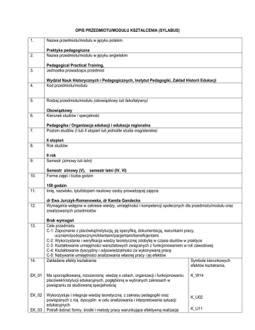 OPIS PRZEDMIOTU/MODUŁU KSZTAŁCENIA (SYLABUS) 1. Nazwa przedmiotu/modułu w języku polskim 2. Praktyka pedagogiczna Nazwa przedmiotu/modułu w języku angielskim 3. Pedagogical Practical Training, Jednostka prowadząca przedmiot 4. Wydział Nauk Historycznych i Pedagogicznych, Instytut Pedagogiki, Zakład Historii Edukacji Kod przedmiotu/modułu 5. Rodzaj przedmiotu/modułu (obowiązkowy lub fakultatywny) 6. Obowiązkowy Kierunek studiów / specjalność 7. Pedagogika / Organizacja edukacji i edukacja regionalna Poziom studiów (I lub II stopień lub jednolite studia magisterskie) 8. II stopień Rok studiów 9. II rok Semestr (zimowy lub letni) 10. Semestr zimowy (V), semestr letni (IV, VI) Forma zajęć i liczba godzin 11. 150 godzin Imię, nazwisko, tytuł/stopień naukowy osoby prowadzącej zajęcia 12. 13. 14. dr Ewa Jurczyk-Romanowska, dr Kamila Gandecka Wymagania wstępne w zakresie wiedzy, umiejętności i kompetencji społecznych dla przedmiotu/modułu oraz zrealizowanych przedmiotów Brak wymagań Cele przedmiotu C-1: Zapoznanie z placówką/instytucją, jej specyfiką, dokumentacją, warunkami pracy, uczniami/podopiecznymi/klientami/pacjentami/beneficjentami C-2: Wykorzystanie i weryfikacja wiedzy teoretycznej zdobytej w czasie studiów w praktyce C-3: Kształtowanie umiejętności warsztatowych związanych z funkcjonowaniem w roli zawodowej C-4: Kształtowanie dyscypliny i odpowiedzialności za wykonywaną pracę C-5: Nabywanie umiejętności analizowania własnej pracy i jej efektów Zakładane efekty kształcenia Symbole kierunkowych efektów kształcenia, EK_01 Ma uporządkowaną, rozszerzoną wiedzę o celach, organizacji i funkcjonowaniu placówek/instytucji edukacyjnych, pogłębioną w wybranych zakresach w powiązaniu ze studiowaną specjalnością EK_02 Wykorzystuje i integruje wiedzę teoretyczną z zakresu pedagogiki oraz powiązanych z nią dyscyplin w celu analizowania i interpretowania sytuacji edukacyjnych EK_03 Potrafi dobrać formy, środki i metody pracy warunkujące efektywną realizacje K_W14 K_U02 K_U11 zadań zawodowych EK_04 Ma przekonanie o sensie, wartości i potrzebie podejmowania działań K_K03, K_K04 pedagogicznych w środowisku lokalnym oraz o konieczności zachowania się w sposób profesjonalny i etyczny EK_05 Odznacza się świadomym i odpowiedzialnym przygotowaniem się do swojej pracy zawodowej, odpowiedzialnie diagnozuje sytuacje edukacyjne oraz projektuje i wykonuje działania edukacyjne w zakresie studiowanej specjalności 15. Treści programowe K_K09 Praktyka realizowana jest w semestrach IV, V, VI (po 3 punkty ECTS za każdy semestr ) 150 godzin: − semestr IV – 50 godzin (47 + 3*) realizowanych w placówkach oświatowych publicznych i prywatnych oraz w instytucjach administracji samorządowej na stanowiskach odpowiedzialnych za edukację, − semestr V – 50 godzin (47 + 3*) realizowanych w placówkach kultury (Domy Kultury, kluby, ośrodki kultury), w instytucjach zajmujących się organizacją różnego typu działalności edukacyjnej dla dorosłych (Zakłady Doskonalenia Zawodowego, Centra Kształcenia Ustawicznego, szkoły dla dorosłych) − semestr VI – 50 godzin (47 + 3*) realizowanych w instytucjach zajmujących się pracą z ludźmi starszymi (Uniwersytety Trzeciego Wieku, Domy Pomocy Społecznej), w instytucjach rynku pracy oraz organizacjach pozarządowych (np. Urząd Pracy, Centrum Informacji Zawodowej i Planowania Kariery, działy kadr, i działy szkolenia różnego typu przedsiębiorstw oraz firmach konsultingowych. * Godziny realizowane z uczelnianym opiekunem praktyk Praktyki realizowane są formie: a) praktyki hospitacyjnej (semestr II) mającej na celu: − zapoznanie ze strukturą i organizacją pracy w wybranej placówce/instytucji (poznanie dokumentacji placówki: regulaminy, statut, akty normatywne regulujące pracę w placówce itp.) − zapoznanie z infrastrukturą placówki/instytucji, jej aktualnymi planami/strategiami pracy, − poznanie specyfiki pracy: zakres działania, rodzaje zajęć, metody i formy pracy − zebranie informacji dotyczących zadań pracowników placówki/instytucji oraz informacji dotyczących uczestników/klientów/podopiecznych/beneficjentów, b) praktyki asystenckiej (semestr III), w ramach której studenci: − uczestniczą w działaniach prowadzonych przez pracowników placówki/instytucji, biorą udział w naradach, spotkaniach, zebraniach oraz innych formach aktywności podejmowanych przez pracowników placówki/instytucji, − angażują się w przygotowywanie różnych form działań edukacyjnych skierowanych do ludzi dorosłych, podejmują różne obowiązki związane ze specyfiką miejsca praktykowania, aktywnie włączają się w realizację zadań, inicjatyw prowadzonych w wybranej placówce/instytucji, podejmują zadania edukacyjne, pomocowe, animacyjne i organizacyjne, c) praktyki zadaniowej (semestr IV), której celem jest: − samodzielne przygotowanie i realizacja własnego projektu edukacyjnego w wybranej placówce/instytucji, − skonstruowanie indywidualnego planu edukacyjnego dla uczestników/klientów/podopiecznych/beneficjentów − podjęcie próby projektowania i realizowania kampanii społecznych oraz przygotowania i realizowania projektów animacji środowiska lokalnego. Przebieg praktyki oraz informacje związane z realizacją założonych zadań rejestrowane są przez studentów w dzienniku praktyk, z uwzględnieniem: a) opisu placówki/instytucji z uwzględnieniem jej specyfiki, przeznaczenia i struktury, b) opisu podstawowych zadań pracowników, c) opisu metod, form oraz narzędzi pracy stosowanych w placówce/instytucji, d) opisu udostępnionej w ramach praktyki dokumentacji placówki/instytucji, e) opisu przeprowadzonych obserwacji, f) dodatkowych informacji uzyskane od pracowników placówki/instytucji, g) subiektywnych uwag praktykanta, dotyczących podejmowanych w czasie praktyk działań z uwzględnieniem możliwości i ograniczeń. 16. Zalec