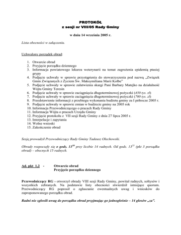PROTOKÓŁ z sesji nr VIII/05 Rady Gminy w dniu 14 września 2005 r. Lista obecności w załączeniu. Uchwalony porządek obrad: 1. Otwarcie obrad 2. Przyjęcie porządku dziennego 3. Informacja powiatowego lekarza weterynarii na temat zagrożenia epidemią ptasiej grypy 4. Podjęcie uchwały w sprawie przystąpienia do stowarzyszenia pod nazwą „Związek Gmin Związanych z Życiem Św. Maksymiliana Marii Kolbe” 5. Podjęcie uchwały w sprawie załatwienia skargi Pani Barbary Matejko na działalność Wójta Gminy Teresin 6. Podjęcie uchwały w sprawie zaciągnięcia długoterminowej pożyczki (450 tys. zł) 7. Podjęcie uchwały w sprawie zaciągnięcia długoterminowej pożyczki (700 tys. zł) 8. Przedstawienie informacji z przebiegu wykonania budżetu gminy za I półrocze 2005 r. 9. Podjęcie uchwały w sprawie zmian w budżecie gminy na 2005 rok 10. Informacja Przewodniczącego o pracach Rady Gminy 11. Informacja Wójta o pracach Urzędu Gminy 12. Przyjęcie protokołu z VII sesji Rady Gminy z dnia 27 lipca 2005 r. 13. Interpelacje i zapytania 14. Wolne wnioski 15. Zakończenie obrad Sesję prowadził Przewodniczący Rady Gminy Tadeusz Olechowski. Obrady rozpoczęły się o godz. 1310 przy liczbie 14 radnych. Od godz. 1325 (pkt 3 porządku obrad) – obecnych 15 radnych. Ad. pkt 1,2 - Otwarcie obrad Przyjęcie porządku dziennego Przewodniczący RG - otworzył obrady VIII sesji Rady Gminy, powitał radnych, sołtysów i wszystkich zebranych. Na podstawie listy obecności stwierdził istniejące quorum. Przewodniczący RG poprosił o zgłaszanie ewentualnych uwag i wniosków do zaproponowanego porządku obrad. Radni nie zgłosili uwag do porządku obrad przyjmując go jednogłośnie – 14 głosów „za”. Przed przystąpieniem do realizacji uchwalonego porządku obrad Przewodniczący RG zwrócił się do pani Wiesławy Stalpińskiej, która zakończyła pracę na stanowisku Dyrektora Szkoły Podstawowej w Teresinie, z podziękowaniem za bardzo dobrą, kilkuletnią współpracę z samorządem gminy Teresin, za trudną i owocną pracę, życząc dalszych sukcesów zawodowych na stanowisku nauczyciela. Następnie Przewodniczący RG złożył na ręce Pana Jana Mitrowskiego gratulacje dla Moniki Mitrowskiej – uczennicy Szkoły Podstawowej w Paprotni - za zwycięstwo w powiatowym konkursie pt. „Jak zostać rzetelnym i interesującym dziennikarzem w epoce informacji. Ad. pkt 3 - Informacja powiatowego lekarza weterynarii na temat zagrożenia epidemią ptasiej grypy Przewodniczący RG – przedstawił pana Wojciecha Wojciechowskiego – powiatowego lekarza weterynarii, który przekaże najważniejsze informacje na temat zagrożenia epidemią ptasiej grypy. W.Wojciechowski (powiatowy lekarz weterynarii) – w związku z nadchodzącym zagrożeniem epidemią ptasiej grypy podjęte zostały odpowiednie działania zapobiegawcze. Jednym z elementów umożliwiających zmniejszenie ryzyka szerzenia się choroby jest rozpowszechnianie - głównie wśród hodowców drobiu – informacji o objawach klinicznych ptasiej grypy, sposobach przeciwdziałania zakażeniu wirusem oraz zaleceniach Inspekcji Weterynaryjnej, których bezwzględnie należy przestrzegać. Pan W.Wojciechowski rozdał zebranym materiał z wytycznymi dla rolników utrzymujących drób, zwracając się z prośbą szczególnie do sołtysów - o jak najszersze rozpropagowanie tych zaleceń wśród mieszkańców wsi. Inspekcja Weterynaryjna apeluje przede wszystkim o: przetrzymywanie hodowanych ptaków w zamknięciu, aby ograniczyć kontakt drobiu z dzikim ptactwem; przykrywanie pojemników z karmą i wodą lub ustawianie ich wewnątrz budynków; zachowanie higieny przez osoby pracujące w fermach, używanie przez nich odzieży ochronnej. W.Wojciechowski zapewnił, że nie istnieje żadne zagrożenie zakażenia się konsumentów ptasią grypą poprzez spożywanie mięsa drobiowego i jego przetworów. Przewodniczący RG – podziękował panu Wojciechowi Wojciechowskiemu za informacje, które zapewne w znacznym stopniu uspokoją mieszkańców gminy Teresin. Ad. pkt 4 - Podjęcie uchwały w sprawie przystąpienia do stowarzyszenia pod nazwą „Związek Gmin Związanych z Życiem Św. Maksymiliana Marii Kolbe” (uchwała RG nr VIII/42/05) A.Rybak – Sekretarz Gminy – w dniu 8 października 2004 r. Rada Gminy Teresin podjęła uchwałę w sprawie wyrażenia woli współdziałania z gminami: Miasto Zduńska Wola, Miasto Pabianice i Miasto Oświęcim. Współpraca ta ma polegać na podejmowaniu wspólnych przedsięwzięć promujących gminy poprzez upowszechnianie miejsc związanych z życiem i kultem osoby Świętego Maksymiliana Marii Kolbego. W ślad za tą inicjatywą podjęte zostały działania w celu nadania formy organizacyjno-prawnej. Uznano, że najbardziej efektywną 2 formułą współpracy międzygminnej będzie zawiązanie stowarzyszenia. Opracowano projekt statutu, który po uzgodnieniach, wraz z projektem uchwały został skierowany do jednostek samorządu terytorialnego celem zatwierdzenia. Projekt statutu określa m.in. cele i zadania Związku oraz precyzuje sposób jego funkcjonowania. Jedną z pierwszych propozycji do realizacji jest stworzenie szlaku pielgrzymkowego, który prowadziłby od miejsca urodzenia Maksymiliana Kolbe – Zduńskiej Woli poprzez Pabianice – miejsce życia Świętego i objawienia Matki Bożej Dwóch Koron, Niepokalanów, w którym Ojciec Maksymilian prowadził swoją działalność oraz Oświęcim – miejsce męczeństwa Świętego Maksymiliana. Przedstawiciele członków Związku ustalili również zasady gospodarki finansowej, zgodnie z którymi wysokość składki członkowskiej będzie wynosiła 0,10 zł od jednego mieszkańca gminy. M.Matela – poinformowała, że Komisja Oświaty, Kultury i Sportu na posiedzeniu w dniu 13 września br. omówiła projekt uchwały oraz projekt statutu, wyrażając opinię pozytywną. Przewodniczący RG – wspomniał, że na dzisiejszą sesj