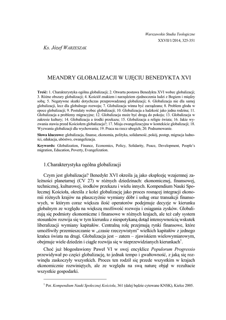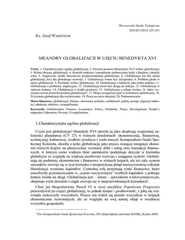 Warszawskie Studia Teologiczne XXVII/1/2014, 325-351 Ks. Józef WARZESZAK MEANDRY GLOBALIZACJI W UJĘCIU BENEDYKTA XVI Treść: 1. Charakterystyka ogólna globalizacji; 2. Otwarta postawa Benedykta XVI wobec globalizacji; 3. RóŜne obszary globalizacji; 4. Kościół znakiem i narzędziem zjednoczenia ludzi z Bogiem i między sobą; 5. Negatywne skutki dotychczas przeprowadzanej globalizacji; 6. Globalizacja nie dla samej globalizacji, lecz dla globalnego rozwoju; 7. Globalizacja winna być zarządzana; 8. Problem głodu w epoce globalizacji; 9. Postulaty wobec globalizacji; 10. Globalizacja a ludzkość jako jedna rodzina; 11. Globalizacja a problemy migracyjne; 12. Globalizacja moŜe być drogą do pokoju; 13. Globalizacja w zakresie kultury; 14. Globalizacja a środki przekazu; 15. Globalizacja a religie świata; 16. Jakie wyzwania stawia przed Kościołem globalizacja?; 17. Misja ewangelizacyjna w kontekście globalizacji; 18. Wyzwania globalizacji dla wychowania; 19. Praca na rzecz ubogich; 20. Podsumowanie. Słowa kluczowe: globalizacja, finanse, ekonomia, polityka, solidarność, pokój, postęp, migracja ludności, edukacja, ubóstwo, ewangelizacja. Keywords: Globalization, Finance, Economics, Policy, Solidarity, Peace, Development, People’s migration, Education, Poverty, Evangelization. 1.Charakterystyka ogólna globalizacji Czym jest globalizacja? Benedykt XVI określa ją jako eksplozję wzajemnej zaleŜności planetarnej (CV 27) w róŜnych dziedzinach: ekonomicznej, finansowej, technicznej, kulturowej, środków przekazu i wielu innych. Kompendium Nauki Społecznej Kościoła, określa z kolei globalizację jako proces rosnącej integracji ekonomii róŜnych krajów na płaszczyźnie wymiany dóbr i usług oraz transakcji finansowych, w którym coraz większa ilość operatorów podejmuje decyzje w kierunku globalnym ze względu na większą moŜliwość rozwoju i osiągania zysków. Globalizują się podmioty ekonomiczne i finansowe w róŜnych krajach, ale teŜ cały system stosunków rozwija się w tym kierunku z niespotykaną dotąd intensywnością wskutek liberalizacji wymiany kapitałów. Centralną rolę przejmują rynki finansowe, które umoŜliwiły przemieszczanie w „czasie rzeczywistym” wielkich kapitałów z jednego krańca świata na drugi. Globalizacja jest – zatem – zjawiskiem wielowymiarowym, obejmuje wiele dziedzin i ciągle rozwija się w nieprzewidzianych kierunkach1. Choć juŜ błogosławiony Paweł VI w swej encyklice Populorum Progressio przewidywał po części globalizację, to jednak tempo i gwałtowność, z jaką się rozwinęła zaskoczyły wszystkich. Proces ten rodził się przede wszystkim w krajach ekonomicznie rozwiniętych, ale ze względu na swą naturę objął w rezultacie wszystkie gospodarki. 1 Por. Kompendium Nauki Społecznej Kościoła, 361 (dalej będzie cytowane KNSK), Kielce 2005. 326 KS. JÓZEF WARZESZAK Jak widać, proces globalizacji obejmuje w pierwszym rzędzie sferę gospodarczo – finansową. Powstaje zatem pytanie: dlaczego tym problemem miałby zajmować się teolog, PapieŜ, czy w ogóle Kościół?2 A jednak. Benedykt XVI zauwaŜa, Ŝe globalizacja jest rzeczywistością złoŜoną i z tego względu zachęca, by rozpatrywać ją nie tylko z punktu widzenia ekonomicznego i socjologicznego, ale takŜe z punktu widzenia teologicznego, duchowego i moralnego3. 2.Otwarta postawa Benedykta XVI wobec globalizacji MoŜna powiedzieć, Ŝe Benedykt XVI podchodzi do zagadnienia globalizacji bez uprzedzeń. Stwierdza bowiem, Ŝe z jednej strony nie naleŜy negować pewnych wymiarów strukturalnych, ale teŜ z drugiej tych wymiarów absolutyzować, gdyŜ globalizacja a priori nie jest ani dobra, ani zła. Będzie przecieŜ taka, jaką uczynią ją wolne podmioty ludzkie4. Wedle PapieŜa – globalizacja powinna być tak prowadzona i zarządzana, aby ludzie nie stawali się jej ofiarami, lecz odgrywali w niej aktywną rolę, postępując rozumnie oraz kierując się miłością i prawdą (CV 42). Ślepe sprzeciwianie się procesom globalizacji uwaŜa Benedykt za postawę błędną, za wyraz uprzedzenia, za lekcewaŜenie procesu, który ma równieŜ aspekty pozytywne. Wskutek postawy twardego sprzeciwu ryzykowałoby się – jego zdaniem – utratę wielkiej okazji wykorzystania wielu szans rozwoju, które globalizacja przynosi. Pozytywną stroną globalizacji wydaje się być m.in. to, Ŝe jej procesy odpowiednio pojmowane i zarządzane dają dziś, jak nigdy wcześniej, moŜliwość wielkiej redystrybucji bogactw w wymiarze planetarnym. Natomiast – źle zarządzane, mogą nawet powodować wzrost ubóstwa i nierówności, a takŜe prowadzić do kryzysu całego świata. PapieŜ zachęca zatem do naprawy funkcjonowania tych procesów, czasem groźnych i wprowadzających nowe podziały tak między poszczególnymi narodami, jak i w obrębie ich samych. Z tego punktu widzenia naleŜy więc czynić wszystko, by redystrybucja bogactw nie wiązała się nieuchronnie z redystrybucją ubóstwa, albo wręcz je pogłębiała. Niestety obecny sposób zarządzania procesami globalizacji nie wydaje się właściwy i tym samym budzi niepokój PapieŜa. Benedykt XVI podtrzymuje wyraŜony w Populorum progressio sprzeciw Pawła VI wobec przeświadczenia, Ŝe narody ubogie powinny pozostać na obecnym poziomie rozwoju i zadowalać się filantropią narodów rozwiniętych. Za słusznością tego sprzeciwu przemawia – przede wszystkim – etyczny wzgląd na sprawiedliwość, ale teŜ fakt, Ŝe dzisiejszy potencjał zasobów materialnych, które moŜna by spoŜytkować, pozwalając tym narodom na wyrwanie się z nędzy, jest większy niŜ dawniej. Niestety wykorzystują go głównie narody krajów rozwiniętych, które miały dotychczas większą moŜliwość zrobienia uŜytku z procesów liberalizacji przepływu kapitału i pracy. W tej sytuacji 2 Obszerne studium na temat globalizacji przedstawił K. BEŁCH, Wyzwania globalizacji w świe