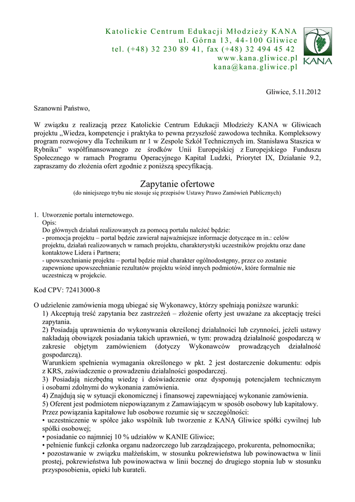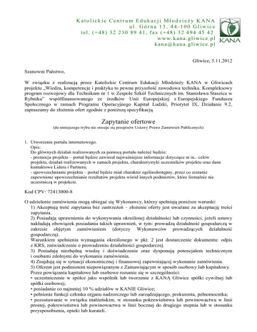 Katolickie Centrum Edukacji Młodzieży KANA ul. Górna 13, 44-100 Gliwice t e l . ( + 4 8 ) 3 2 2 3 0 89 4 1 , f a x ( + 4 8 ) 3 2 4 9 4 4 5 4 2 www.kana.gliwice.pl k a n a @k a n a . g l i w i c e . p l Gliwice, 5.11.2012 Szanowni Państwo, W związku z realizacją przez Katolickie Centrum Edukacji Młodzieży KANA w Gliwicach projektu „Wiedza, kompetencje i praktyka to pewna przyszłość zawodowa technika. Kompleksowy program rozwojowy dla Technikum nr 1 w Zespole Szkół Technicznych im. Stanisława Staszica w Rybniku” współfinansowanego ze środków Unii Europejskiej z Europejskiego Funduszu Społecznego w ramach Programu Operacyjnego Kapitał Ludzki, Priorytet IX, Działanie 9.2, zapraszamy do złożenia ofert zgodnie z poniższą specyfikacją. Zapytanie ofertowe (do niniejszego trybu nie stosuje się przepisów Ustawy Prawo Zamówień Publicznych) 1. Utworzenie portalu internetowego. Opis: Do głównych działań realizowanych za pomocą portalu należeć będzie: - promocja projektu – portal będzie zawierał najważniejsze informacje dotyczące m in.: celów projektu, działań realizowanych w ramach projektu, charakterystyki uczestników projektu oraz dane kontaktowe Lidera i Partnera; - upowszechnianie projektu – portal będzie miał charakter ogólnodostępny, przez co zostanie zapewnione upowszechnianie rezultatów projektu wśród innych podmiotów, które formalnie nie uczestniczą w projekcie. Kod CPV: 72413000-8 O udzielenie zamówienia mogą ubiegać się Wykonawcy, którzy spełniają poniższe warunki: 1) Akceptują treść zapytania bez zastrzeżeń – złożenie oferty jest uważane za akceptację treści zapytania. 2) Posiadają uprawnienia do wykonywania określonej działalności lub czynności, jeżeli ustawy nakładają obowiązek posiadania takich uprawnień, w tym: prowadzą działalność gospodarczą w zakresie objętym zamówieniem (dotyczy Wykonawców prowadzących działalność gospodarczą). Warunkiem spełnienia wymagania określonego w pkt. 2 jest dostarczenie dokumentu: odpis z KRS, zaświadczenie o prowadzeniu działalności gospodarczej. 3) Posiadają niezbędną wiedzę i doświadczenie oraz dysponują potencjałem technicznym i osobami zdolnymi do wykonania zamówienia. 4) Znajdują się w sytuacji ekonomicznej i finansowej zapewniającej wykonanie zamówienia. 5) Oferent jest podmiotem niepowiązanym z Zamawiającym w sposób osobowy lub kapitałowy. Przez powiązania kapitałowe lub osobowe rozumie się w szczególności: • uczestniczenie w spółce jako wspólnik lub tworzenie z KANĄ Gliwice spółki cywilnej lub spółki osobowej; • posiadanie co najmniej 10 % udziałów w KANIE Gliwice; • pełnienie funkcji członka organu nadzorczego lub zarządzającego, prokurenta, pełnomocnika; • pozostawanie w związku małżeńskim, w stosunku pokrewieństwa lub powinowactwa w linii prostej, pokrewieństwa lub powinowactwa w linii bocznej do drugiego stopnia lub w stosunku przysposobienia, opieki lub kurateli. Termin składania oferty: do dnia 20.11.2012. Proszę o podanie cen brutto usługi. Kryterium wyboru: 100% cena. W załączeniu przekazuję wzór oferty. W razie pytań proszę o kontakt: Waldemar Kuwaczka KANA Gliwice ul. Górna 13, 44-100 Gliwice tel. +48 32 230 89 41 e-mail: [email protected] Oferty należy dostarczyć do KANY Gliwice osobiście, pocztą tradycyjną lub za pomocą poczty elektronicznej na powyżej podane adresy. „Wiedza, kompetencje i praktyka to pewna przyszłość zawodowa technika. Kompleksowy program rozwojowy dla Technikum nr 1 w Zespole Szkół Technicznych im. Stanisława Staszica w Rybniku” współfinansowany ze środków Unii Europejskiej z Europejskiego Funduszu Społecznego w ramach Programu Operacyjnego Kapitał Ludzki, Priorytet IX, Działanie 9.2 FORMULARZ OFERTOWY (pieczęć wykonawcy) Dane dotyczące Wykonawcy Oferent: Zarejestrowana nazwa Wykonawcy: Zarejestrowany adres Wykonawcy: REGON: Numer telefonu: Numer faxu Numer konta bankowego: NIP Upełnomocnieni przedstawiciele Dostawcy: (data) (podpis, pieczęć) „Wiedza, kompetencje i praktyka to pewna przyszłość zawodowa technika. Kompleksowy program rozwojowy dla Technikum nr 1 w Zespole Szkół Technicznych im. Stanisława Staszica w Rybniku” współfinansowany ze środków Unii Europejskiej z Europejskiego Funduszu Społecznego w ramach Programu Operacyjnego Kapitał Ludzki, Priorytet IX, Działanie 9.2 FORMULARZ OFERTOWY (pieczęć wykonawcy) „Oferta cenowa” 1. Utworzenie portalu internetowego Opis: Do głównych działań realizowanych za pomocą portalu należeć będzie: - promocja projektu – portal będzie zawierał najważniejsze informacje dotyczące m in.: celów projektu, działań realizowanych w ramach projektu, charakterystyki uczestników projektu oraz dane kontaktowe Lidera i Partnera; - upowszechnianie projektu – portal będzie miał charakter ogólnodostępny, przez co zostanie zapewnione upowszechnianie rezultatów projektu wśród innych podmiotów, które formalnie nie uczestniczą w projekcie. Wyszczególnienie Kwota zł Słownie zł Wartość brutto [zł] Utworzenie portalu internetowego Upełnomocnieni przedstawiciele Wykonawcy: (data) (podpis, pieczęć) „Wiedza, kompetencje i praktyka to pewna przyszłość zawodowa technika. Kompleksowy program rozwojowy dla Technikum nr 1 w Zespole Szkół Technicznych im. Stanisława Staszica w Rybniku” współfinansowany ze środków Unii Europejskiej z Europejskiego Funduszu Społecznego w ramach Programu Operacyjnego Kapitał Ludzki, Priorytet IX, Działanie 9.2