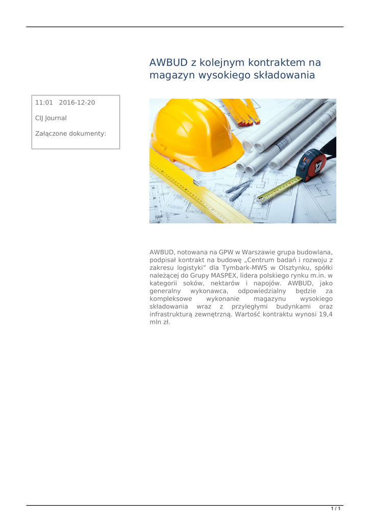 AWBUD z kolejnym kontraktem na magazyn wysokiego składowania 11:01 2016-12-20 CIJ Journal Załączone dokumenty: AWBUD, notowana na GPW w Warszawie grupa budowlana, podpisał kontrakt na budowę „Centrum badań i rozwoju z zakresu logistyki” dla Tymbark-MWS w Olsztynku, spółki należącej do Grupy MASPEX, lidera polskiego rynku m.in. w kategorii soków, nektarów i napojów. AWBUD, jako generalny wykonawca, odpowiedzialny będzie za kompleksowe wykonanie magazynu wysokiego składowania wraz z przyległymi budynkami oraz infrastrukturą zewnętrzną. Wartość kontraktu wynosi 19,4 mln zł. 1/1