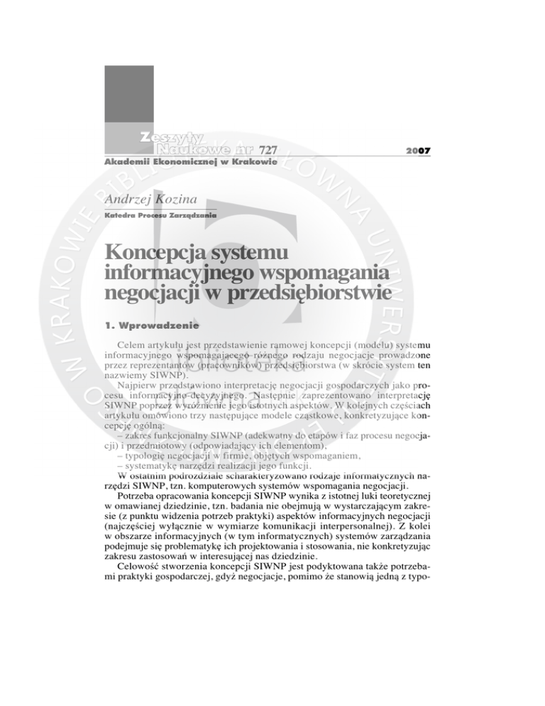 Zesz yty Naukowe nr 727 2007 Akademii Ekonomicznej w Krakowie Andrzej Kozina Katedra Procesu Zarzàdzania Koncepcja systemu informacyjnego wspomagania negocjacji w przedsi´biorstwie 1. Wprowadzenie Celem artyku∏u jest przedstawienie ramowej koncepcji (modelu) systemu informacyjnego wspomagajàcego ró˝nego rodzaju negocjacje prowadzone przez reprezentantów (pracowników) przedsi´biorstwa (w skrócie system ten nazwiemy SIWNP). Najpierw przedstawiono interpretacj´ negocjacji gospodarczych jako procesu informacyjno-decyzyjnego. Nast´pnie zaprezentowano interpretacj´ SIWNP poprzez wyró˝nienie jego istotnych aspektów. W kolejnych cz´Êciach artyku∏u omówiono trzy nast´pujàce modele czàstkowe, konkretyzujàce koncepcj´ ogólnà: – zakres funkcjonalny SIWNP (adekwatny do etapów i faz procesu negocjacji) i przedmiotowy (odpowiadajàcy ich elementom), – typologi´ negocjacji w firmie, obj´tych wspomaganiem, – systematyk´ narz´dzi realizacji jego funkcji. W ostatnim podrozdziale scharakteryzowano rodzaje informatycznych narz´dzi SIWNP, tzn. komputerowych systemów wspomagania negocjacji. Potrzeba opracowania koncepcji SIWNP wynika z istotnej luki teoretycznej w omawianej dziedzinie, tzn. badania nie obejmujà w wystarczajàcym zakresie (z punktu widzenia potrzeb praktyki) aspektów informacyjnych negocjacji (najcz´Êciej wy∏àcznie w wymiarze komunikacji interpersonalnej). Z kolei w obszarze informacyjnych (w tym informatycznych) systemów zarzàdzania podejmuje si´ problematyk´ ich projektowania i stosowania, nie konkretyzujàc zakresu zastosowaƒ w interesujàcej nas dziedzinie. CelowoÊç stworzenia koncepcji SIWNP jest podyktowana tak˝e potrzebami praktyki gospodarczej, gdy˝ negocjacje, pomimo ˝e stanowià jednà z typo- 120 Andrzej Kozina wych dziedzin dzia∏alnoÊci firmy, do tej pory w ograniczonym zakresie zosta∏y obj´te wspomaganiem informacyjnym. Szeroki zakres rozwa˝anych negocjacji wymaga znacznie efektywniejszego wsparcia informacyjnego poprzez wdro˝enie technologii adekwatnej do potrzeb. Dotychczasowe, kilkunastoletnie doÊwiadczenia w zakresie tworzenia informatycznych (w tym internetowych) rozwiàzaƒ, g∏ównie w postaci systemów wspomagania negocjacji (NSS) i ogólne tendencje rozwojowe technologii informacyjnej wskazujà na coraz wi´ksze mo˝liwoÊci poszerzania i wzbogacania tych zastosowaƒ (e-negocjacji). Odzwierciedla to zasadnicze zmiany jakoÊciowe negocjacji w porównaniu do tradycyjnych ich narz´dzi, a zw∏aszcza znaczne poszerzenie zakresu analizy sytuacji negocjacyjnej, ze wzgl´du na du˝à ró˝norodnoÊç i zmiennoÊç celów, za∏o˝eƒ i uwarunkowaƒ negocjacji, a co za tym idzie z∏o˝onoÊç procesów przetwarzania informacji. W zwiàzku z powy˝szym jest zarówno celowe, jak i mo˝liwe dà˝enie do stworzenia i implementacji kompleksowego (zintegrowanego) SIWNP, obejmujàcego wszystkie typowe narz´dzia metodyczne i u˝ytkowe negocjacji prowadzonych przez firm´, przynajmniej na poziomie kompleksowej analizy przed- i ponegocjacyjnej czy wybranych sytuacji negocjacyjnych. System taki mo˝e w istotnie podnieÊç efektywnoÊç tych negocjacji, zw∏aszcza poprzez ograniczenie subiektywizmu podejÊcia negocjatorów-reprezentantów firmy. 2. Negocjacje gospodarcze jako proces informacyjno-decyzyjny Dla celów prezentowanych badaƒ przez negocjacje gospodarcze b´dziemy rozumieç wszelkiego rodzaju negocjacje prowadzone przez reprezentantów firmy (w∏aÊcicieli, mened˝erów, pracowników funkcjonalnych, ewentualnych doradców), dotyczàce g∏ównie transakcji, niezb´dnych dla dokonania sprzeda˝y bàdê zakupu ró˝nego rodzaju zasobów rzeczowych i finansowych, tj. produktów lub us∏ug, materia∏ów, a tak˝e Êrodków trwa∏ych i wyposa˝enia oraz wartoÊci niematerialnych. Do typowych obszarów (rodzajów) omawianych negocjacji nale˝à: sprzeda˝ produktów (us∏ug), pozyskiwanie kredytów, transakcje leasingowe i ubezpieczeniowe, przetargi, sprzeda˝ firmy, fuzje i alianse strategiczne itp. Wi´kszoÊç spoÊród tych negocjacji ma charakter kompleksowy, tj. obejmuje szereg specyficznych problemów czàstkowych. SpoÊród ró˝norodnych interpretacji poj´cia negocjacji, najistotniejsze – z punktu widzenia celu artyku∏u – jest ich uj´cie jako procesu wymiany informacji i podejmowania decyzji. Mo˝na je bowiem traktowaç jako interakcyjny (wspólny) proces decyzyjny partnerów. Proces ten – w swojej fazie przygotowawczej – jest realizowany przez nich niezale˝nie od siebie (z punktu widzenia ich celów), a nast´pnie wchodzi w faz´ wzajemnych uzgodnieƒ w zakresie dwóch par zbiorów (okreÊlonych wst´pnie dla ka˝dego z negocjatorów z osobna), jako efektu analizy problemu decyzyjnego: alternatyw rozwiàzaƒ i kryte- Koncepcja systemu informacyjnego... 121 riów oceny. Strony dokonujà doboru kryteriów z punktu widzenia ich interesów i ustalenia zbioru alternatyw mo˝liwych do przyj´cia (jako cz´Êci wspólnej wyjÊciowych mo˝liwoÊci rozwiàzaƒ). Proces ten ma charakter iteracyjny: strony poszukujà rozwiàzaƒ dla siebie zadowalajàcych, w drodze stopniowego oferowania ust´pstw i korzyÊci [Kozina, Mesjasz 2005, s. 27–28]. SpoÊród innych interpretacji negocjacji, mo˝na wymieniç nast´pujàce: – proces komunikacyjno-decyzyjny, w którym strony starajà si´ dobrowolnie rozwiàzaç konflikt, tak aby uzyskany rezultat by∏ dla nich mo˝liwy do przyj´cia [Brdulak, Brdulak 2000, s. 13]; – rodzaj procesu podejmowania decyzji, anga˝ujàcego dwie lub wi´cej stron, które nie mogà podejmowaç decyzji niezale˝nie od siebie i muszà wzajemnie ust´powaç, aby osiàgnàç porozumienie [Bharat, Solomon 1999]; – sposób, w jaki dwóch lub wi´cej celowo dzia∏ajàcych uczestników dochodzi do specyficznych uzgodnieƒ lub rezultatów, w warunkach strategicznej interakcji mi´dzy nimi lub interaktywnego procesu podejmowania decyzji [Lim 1999]. Proces negocjacji traktowany jak