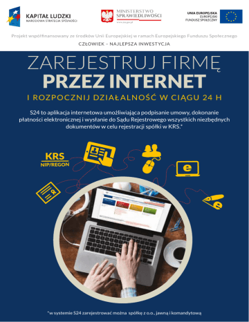 Projekt współ finansowany ze środków Unii Europejskiej w ramach Europejskiego Funduszu Społecznego CZŁOWIEK – NA JLEPSZA INWEST YCJA ZAREJESTRUJ FIRMĘ PRZEZ INTERNET I ROZP O C ZNIJ DZIAŁ A L N O Ś Ć W CIĄG U 24 H S24 to aplikacja internetowa umożliwiająca podpisanie umowy, dokonanie płatności elektronicznej i wysłanie do Sądu Rejestrowego wszystkich niezbędnych dokumentów w celu rejestracji spółki w KRS.* KRS NIP/REGON *w systemie S24 zarejestrować można spółkę z o.o., jawną i komandytową REJESTRACJA KROK PO KROKU 1 WEJDŹ NA STRONĘ INTERNETOWĄ http://ems.ms.gov.pl i postępuj zgodnie z podpowiedziami aplikacji PODPISZ UMOWĘ. POTRZEBNE BĘDĄ: 2 lub profil zaufany ePUAP zwykły podpis elektroniczny (login i hasło) lub bezpieczny podpis weryfikowany przy pomocy ważnego kwalifikowanego certyfikatu (Rejestracja spółki jawnej i komandytowej nie dopuszcza zwykłego podpisu elektronicznego.) ODBIERZ INFORMACJĘ ZWROTNĄ O NADANYCH NR-ACH KRS I NIP 3 Wszystkie wypełnione elektronicznie dokumenty po podpisaniu i opłaceniu przekazywane są drogą elektroniczną do Sądu Rejestrowego. Sąd po sprawdzeniu dokumentów dokonuje wpisu do Krajowego Rejestru Sądowego i dzięki integracji z systemem Ministerstwa Finansów nadawany jest numer NIP. Zwrotna informacja o nadanych numerach KRS i NIP przekazywana jest drogą elektroniczną do przedsiębiorcy. 3. droga elektroniczna 2. 1. przedsiębiorca integracja systemu Sąd Rejestrowy podpisane i opłacone dokumenty 4. informacja zwrotna Ministerstwo Finansów GUS wpis do KRS nadanie NIP/REGON KRS NIP/REGON CZY WIESZ, ŻE: Od 1.01.2012 r. do 31.12.2014 r. WZRÓSŁ ODSETEK REJESTROWANYCH SPÓŁEK Z O.O. W TRYBIE S24 ogólna liczba zarejestrowanych w KRS spółek z o.o. 84 676 8% 33% od 1.01.2012 r. do 31.12.2014 r. liczba spółek z o.o. zarejestrowanych tradycyjnie WIĘCEJ INFORMACJI: HTTP://EMS.MS.GOV.PL 63 645 liczba spółek z o.o. zarejestrowanych w trybie S24 21 031