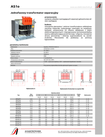 AS1o Jednofazowy transformator separacyjny przeznaczenie zasilanie układów wymagających separacji galwanicznej od sieci zasilającej budowa Uzwojenia pierwotne i wtórne transformatora oddzielone warstwą materiału izolacyjnego nawinięte na wspólnym karkasie, umieszczone na rdzeniu składanym z blach elektromagnetycznych i impregnowane termoutwardzalną żywicą zabezpieczającą przed korozją i wilgocią. Uzwojenia strony pierwotnej i wtórnej wyprowadzone na zaciski śrubowe. Mocowanie do podstawy za pomocą kątowników. parametry techniczne Wykonanie Zgodne z PN-EN 61558-2-4 Moc od 0,05 do 1,6 kVA Napięcie pierwotne do 1000 V Napięcie wtórne do 500 V Częstotliwość 50/60 Hz Stopień ochrony IP00 Klasa izolacji F standardowo Temperatura otoczenia Od -25⁰C do +40⁰C Klasa środowiskowa C1/E0 – wykonanie lądowe, C2E1 – wykonanie kopalniane i morskie Klasa ochronności I Montaż Przy pomocy kątowników lub dla wybranych typów na szynę Wykonanie A Wykonanie B (montaż na szynie NS) Wymiary [mm] Typ Moc [kVA] AS1o/11 0,05 AS1o/12 Ciężar [kg] Wykonanie 4,8*9 1,3 A+B 50 4,8*9 1,4 A+B 65 4,8*9 2,0 A+B 5,8*11 3,0 A+B 5,8*11 3,1 A+B 5,8*11 3,4 A+B A B C D E F [mm] [mm] [mm] [mm] [mm] [mm] 78 60 90 55 45 0,075 84 65 95 65 AS1o/13 0,10 84 75 95 65 AS1o/14 0,13 105 75 110 85 65 AS1o/15 0,16 105 80 110 85 65 AS1o/16 0,20 105 90 110 85 70 AS1o/17 0,25 105 102 110 85 90 5,8*11 4,5 A+B AS1o/18 0,32 120 90 120 90 70 5,8*11 4,6 A+B AS1o/19 0,40 120 105 120 90 85 5,8*11 5,9 A+B AS1o/110 0,50 120 122 120 90 105 5,8*11 6,7 A+B AS1o/111 0,63 150 110 150 120 85 7*13 8,3 A AS1o/112 0,80 150 125 150 120 100 7*13 10,1 A AS1o/113 1,0 150 150 150 120 130 7*13 13,5 A AS1o/114 1,3 174 140 165 135 110 7*13 15,8 A AS1o/115 1,6 174 170 165 135 135 7*13 21,0 A