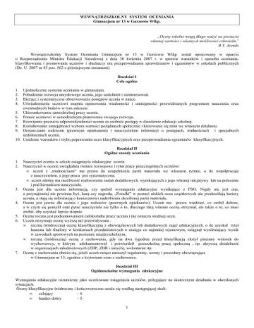 WEWNĄTRZSZKOLNY SYSTEM OCENIANIA Gimnazjum nr 13 w Gorzowie Wlkp. „Oceny szkolne mogą długo waŜyć na poczuciu własnej wartości i własnych moŜliwości człowieka” B.Y. Arends Wewnątrzszkolny System Oceniania Gimnazjum nr 13 w Gorzowie Wlkp. został opracowany w oparciu o Rozporządzenie Ministra Edukacji Narodowej z dnia 30 kwietnia 2007 r. w sprawie warunków i sposobu oceniania, klasyfikowania i promowania uczniów i słuchaczy ora przeprowadzania sprawdzianów i egzaminów w szkołach publicznych (Dz. U. 2007 nr 83 poz. 562 z późniejszymi zmianami). Rozdział I Cele ogólne 1. 2. 3. 4. Ujednolicenie systemu oceniania w gimnazjum. Pobudzenie rozwoju umysłowego ucznia, jego uzdolnień i zainteresowań. BieŜące i systematyczne obserwowanie postępów ucznia w nauce. Uświadomienie uczniowi stopnia opanowania wiadomości i umiejętności przewidzianych programem nauczania oraz ewentualnych braków w tym zakresie. 5. Ukierunkowanie samodzielnej pracy ucznia. 6. Pomoc uczniowi w samodzielnym planowaniu swojego rozwoju. 7. Rozwijanie poczucia odpowiedzialności ucznia za osobiste postępy w dziedzinie edukacji szkolnej. 8. Kształtowanie umiejętności wyboru wartości poŜądanych społecznie i kierowanie się nimi we własnym działaniu. 9. Dostarczanie rodzicom (prawnym opiekunom) i nauczycielom informacji o postępach, trudnościach i specjalnych uzdolnieniach ucznia. 10. Ustalenie warunków i trybu poprawiania ocen klasyfikacyjnych oraz przeprowadzania egzaminów klasyfikacyjnych. Rozdział II Ogólne zasady oceniania 1. 2. 3. 4. 5. 6. 7. Nauczyciel ocenia w szkole osiągnięcia edukacyjne ucznia. Nauczyciel w ocenie uwzględnia róŜnice rozwojowe i rytm pracy poszczególnych uczniów: • uczeń z „trudnościami” ma prawo do uzupełnienia partii materiału we własnym rytmie, o ile współpracuje z nauczycielem, a jego praca jest systematyczna; • uczeń zdolny ma moŜliwość realizowania zadań dodatkowych, wynikających z jego własnej inicjatywy lub na polecenie i pod kierunkiem nauczyciela. Ocena jest dla ucznia informacją, czy spełnił wymagania edukacyjne wynikające z PSO. Nigdy nie jest ona, a przynajmniej nie powinna być, karą czy nagrodą. „PoraŜki” w postaci niskich ocen cząstkowych nie przekreślają kariery ucznia, a stają się informacją o konieczności nadrobienia określonej partii materiału. Ocena jest jawna dla ucznia i jego rodziców (prawnych opiekunów). Uczeń ma prawo wiedzieć, co zrobił dobrze, a w czym się pomylił oraz pytać nauczyciela nie tylko o to, dlaczego taką właśnie ocenę otrzymał, ale takŜe o to, co musi zrobić, aby uzyskać lepsze stopnie. Ocena roczna jest podsumowaniem całokształtu pracy ucznia i nie oznacza średniej ocen. Uczeń otrzymuje ocenę wyŜszą niŜ przewidywana : • roczną (śródroczną) ocenę klasyfikacyjną z obowiązkowych lub dodatkowych zajęć edukacyjnych, o ile uzyskał tytuł laureata lub finalisty w konkursach przedmiotowych o zasięgu co najmniej rejonowym, osiągnął wyróŜniający wynik w zawodach sportowych na poziomie międzyszkolnym; • roczną (śródroczną) ocenę z zachowania, gdy na dwa tygodnie przed klasyfikacją złoŜył pisemny wniosek do wychowawcy, w którym udokumentował i potwierdził pozaszkolną pracę społeczną , np. aktywną działalność w organizacjach młodzieŜowych (ZHP, ZHR i innych), wolontariat itp. Ocenę z zachowania obniŜa się, jeŜeli uczeń raŜąco naruszył regulaminy, normy i procedury obowiązujące w Gimnazjum nr 13, zgodnie z kryteriami ocen z zachowania. Rozdział III Ogólnoszkolne wymagania edukacyjne Wymagania edukacyjne rozumiemy jako oczekiwane osiągnięcia uczniów, polegające na skutecznym działaniu w określonych sytuacjach. Oceny klasyfikacyjne śródroczne i końcoworoczne ustala się według następującej skali: • celujący –6 • bardzo dobry –5 1 • • • • W kontroli dobry –4 dostateczny –3 dopuszczający –2 niedostateczny –1 bieŜącej dopuszcza się rozszerzoną skalę ocen cząstkowych przez stosowanie „ + ’’ i „- ’’. Ocenę dopuszczającą otrzymuje uczeń, który: - ma braki w podstawowych wiadomościach, lecz z pomocą nauczyciela potrafi je nadrobić, - rozwiązuje i wykonuje typowe zadania teoretyczne i praktyczne o niewielkim stopniu trudności –uŜyteczne w Ŝyciu pozaszkolnym i ewentualnej pracy, - przejawia gotowość do przyswajania nowych wiadomości. Ocenę dostateczną otrzymuje uczeń, który: - rozwiązuje i wykonuje typowe zadania teoretyczne i praktyczne o średnim stopniu trudności uŜyteczne w Ŝyciu pozaszkolnym i ewentualnej pracy, - próbuje porównywać, selekcjonować i klasyfikować fakty i informacje, - dostrzega podstawowe związki w otaczającym świecie, - współpracuje z nauczycielem, - wykazuje aktywność na lekcji. Ocenę dobrą otrzymuje uczeń, który: potrafi samodzielnie pracować z podręcznikiem, materiałem źródłowym, ustnie i pisemnie stosuje terminologię typową dla danego przedmiotu, rozwiązuje typowe problemy z wykorzystaniem informacji z róŜnych źródeł, efektywnie współdziała w zespole i aktywnie pracuje w grupie, bierze udział w dyskusjach, wymianie poglądów; potrafi argumentować i bronić swych racji. Ocenę bardzo dobrą otrzymuje uczeń, który: - opanował pełny zakres wiedzy i umiejętności określony w podstawie programowej nauczania przedmiotu w danej klasie, - sprawnie posługuje się wiadomościami, - rozwiązuje samodzielnie problemy teoretyczne i praktyczne, - potrafi zastosować posiadaną wiedzę w nowych sytuacjach, - umie bronić swoich poglądów, a takŜe potrafi dochodzić do porozumienia w kwestiach spornych, - wnosi twórczy wkład w realizowane zagadnienia. Ocenę celującą otrzymuje uczeń, który: - opanował treści programowe, rozszerzając swoją wiedzę o wiadomości w znacznym stopniu wykraczające poza program danej klasy, - umie formułować oryginalne i przemyślane wni