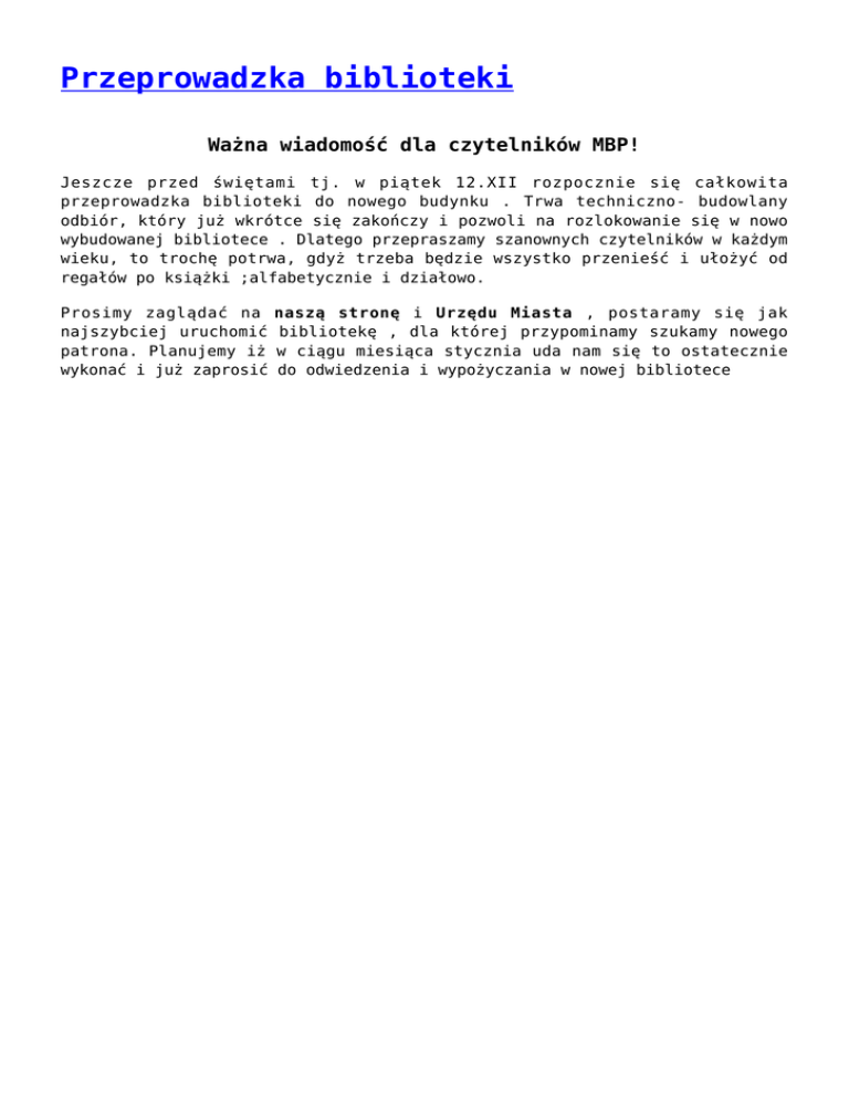 Przeprowadzka biblioteki Ważna wiadomość dla czytelników MBP! Jeszcze przed świętami tj. w piątek 12.XII rozpocznie się całkowita przeprowadzka biblioteki do nowego budynku . Trwa techniczno- budowlany odbiór, który już wkrótce się zakończy i pozwoli na rozlokowanie się w nowo wybudowanej bibliotece . Dlatego przepraszamy szanownych czytelników w każdym wieku, to trochę potrwa, gdyż trzeba będzie wszystko przenieść i ułożyć od regałów po książki ;alfabetycznie i działowo. Prosimy zaglądać na najszybciej uruchomić patrona. Planujemy iż wykonać i już zaprosić naszą stronę i Urzędu Miasta , postaramy się jak bibliotekę , dla której przypominamy szukamy nowego w ciągu miesiąca stycznia uda nam się to ostatecznie do odwiedzenia i wypożyczania w nowej bibliotece