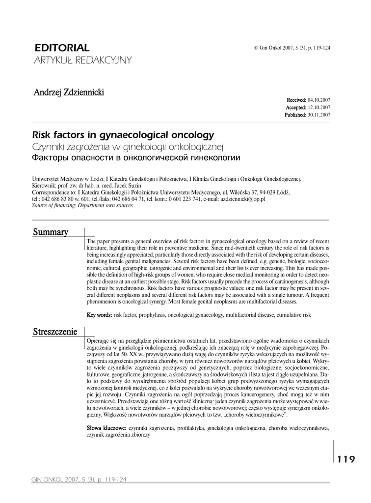 EDITORIAL ARTYKU£ REDAKCYJNY © Gin Onkol 2007, 5 (3), p. 119-124 Andrzej Zdziennicki Received: 04.10.2007 Accepted: 12.10.2007 Published: 30.11.2007 Risk factors in gynaecological oncology Czynniki zagro¿enia w ginekologii onkologicznej Факторы опасности в онкологической гинекологии Uniwersytet Medyczny w £odzi, I Katedra Ginekologii i Po³o¿nictwa, I Klinika Ginekologii i Onkologii Ginekologicznej. Kierownik: prof. zw. dr hab. n. med. Jacek Suzin Correspondence to: I Katedra Ginekologii i Po³o¿nictwa Uniwersytetu Medycznego, ul. Wileñska 37, 94-029 £ódŸ, tel.: 042 686 83 80 w. 601, tel./faks: 042 686 04 71, tel. kom.: 0 601 223 741, e-mail: [email protected] Source of financing: Department own sources Summary The paper presents a general overview of risk factors in gynaecological oncology based on a review of recent literature, highlighting their role in preventive medicine. Since mid-twentieth century the role of risk factors is being increasingly appreciated, particularly those directly associated with the risk of developing certain diseases, including female genital malignancies. Several risk factors have been defined, e.g. genetic, biologic, socioeconomic, cultural, geographic, iatrogenic and environmental and their list is ever increasing. This has made possible the definition of high-risk groups of women, who require close medical monitoring in order to detect neoplastic disease at an earliest possible stage. Risk factors usually precede the process of carcinogenesis, although both may be synchronous. Risk factors have various prognostic values: one risk factor may be present in several different neoplasms and several different risk factors may be associated with a single tumour. A frequent phenomenon is oncological synergy. Most female genital neoplasms are multifactorial diseases. Key words: risk factor, prophylaxis, oncological gynaecology, multifactorial disease, cumulative risk Streszczenie Opieraj¹c siê na przegl¹dzie piœmiennictwa ostatnich lat, przedstawiono ogólne wiadomoœci o czynnikach zagro¿enia w ginekologii onkologicznej, podkreœlaj¹c ich znacz¹c¹ rolê w medycynie zapobiegawczej. Pocz¹wszy od lat 50. XX w., przywi¹zywano du¿¹ wagê do czynników ryzyka wskazuj¹cych na mo¿liwoœæ wyst¹pienia zagro¿enia powstania choroby, w tym równie¿ nowotworów narz¹dów p³ciowych u kobiet. Wykryto wiele czynników zagro¿enia pocz¹wszy od genetycznych, poprzez biologiczne, socjoekonomiczne, kulturowe, geograficzne, jatrogenne, a skoñczuwszy na œrodowiskowych i lista ta jest ci¹gle uzupe³niana. Da³o to podstawy do wyodrêbnienia spoœród populacji kobiet grup podwy¿szonego ryzyka wymagaj¹cych wzmo¿onej kontroli medycznej, co z kolei pozwala³o na wykrycie choroby nowotworowej we wczesnym etapie jej rozwoju. Czynniki zagro¿enia na ogó³ poprzedzaj¹ proces kancerogenezy, choæ mog¹ te¿ w nim uczestniczyæ. Przedstawiaj¹ one ró¿n¹ wartoœæ kliniczn¹: jeden czynnik zagro¿enia mo¿e wystêpowaæ w wielu nowotworach, a wiele czynników – w jednej chorobie nowotworowej; czêsto wystêpuje synergizm onkologiczny. Wiêkszoœæ nowotworów narz¹dów p³ciowych to tzw. „choroby wieloczynnikowe”. S³owa kluczowe: czynniki zagro¿enia, profilaktyka, ginekologia onkologiczna, choroba wieloczynnikowa, czynnik zagro¿enia zbiorczy 119 GIN ONKOL 2007, 5 (3), p. 119-124 EDITORIAL/ARTYKU£ REDAKCYJNY C , . 50- ! , ! !. " ! , , , , , , , ! , # . $ # ! ! , ! , ! ! . % , ! . & . , – . ' ( ). " # . „ ”. : , , , , „Development of neoplasms is the price we pay for a longer life” W.E. Wright and J.W. Shaw(1) „Powstawanie nowotworów jest cen¹, jak¹ p³acimy za wyd³u¿anie ¿ycia” W.E. Wright, J.W. Shay(1) n Poland malignant neoplasms are, after cardiovascular diseases, the second most common cause of premature mortality in women in the 20-64 age group(2). At present, one of the key issues in oncologic gynaecology is the earliest possible detection of risk of development of female genital malignancy and timely institution of effective prophylaxis and treatment(3,4,5,6). This is made possible by selection of high-risk groups, detection of precancerous conditions or of malignant tumours at the very initial phase of development. This should result in a significant improvement of cure rates. Attempts at understanding mechanisms underlying carcinogenesis were largely successful due to a dramatic progress in research and diagnostic techniques(1,5,7-11). Currently, we are able to detect many precancerous conditions or cancers at an early phase and we improve our understanding of risk factors associated therewith. Klimek(5) states that neoplastic disease is caused by several factors, including genetic, biological and environmental. Mutter et al.(12) noticed, that hormonal imbalance might increase the risk of carcinogenesis. Spaczyñski et al., as well as several other authors, define malignant tumours as “multifactorial diseases”(4-6,10). Definition of risk factors is necessary in order to select high-risk groups of women and to draw conclusions aiming at prevention of female genital cancers to decrease their incidence and reduce mortality. The notion of “risk factor”, coined by American investigators over 50 years ago, appeared in medicine much earlier. It was referred to as unfavorable external stimuli, conditions favoring the development and progression Polsce nowotwory z³oœliwe u kobiet s¹ drug¹, po chorobach uk³adu kr¹¿enia, przyczyn¹ œmierci; stanowi¹ 45% przedwczesnych zgonów w grupie wiekowej 20-64 lat(2). Jednym z naczelnych zadañ ginekologii onkologicznej jest dzisiaj jak najwczeœniejsze rozpoznawanie i wykrywanie zagro¿eñ zachorowania na nowotwory z³oœliwe narz¹dów p³ciowych oraz wdro¿enie w³aœciwego oddzia³ywania profilaktycznego i/lub leczniczego(3-6). Stwarza to mo¿liwoœci wyodrêbnienia grup wysokiego ryzyka, wychwycenia przypadków zachorowañ na