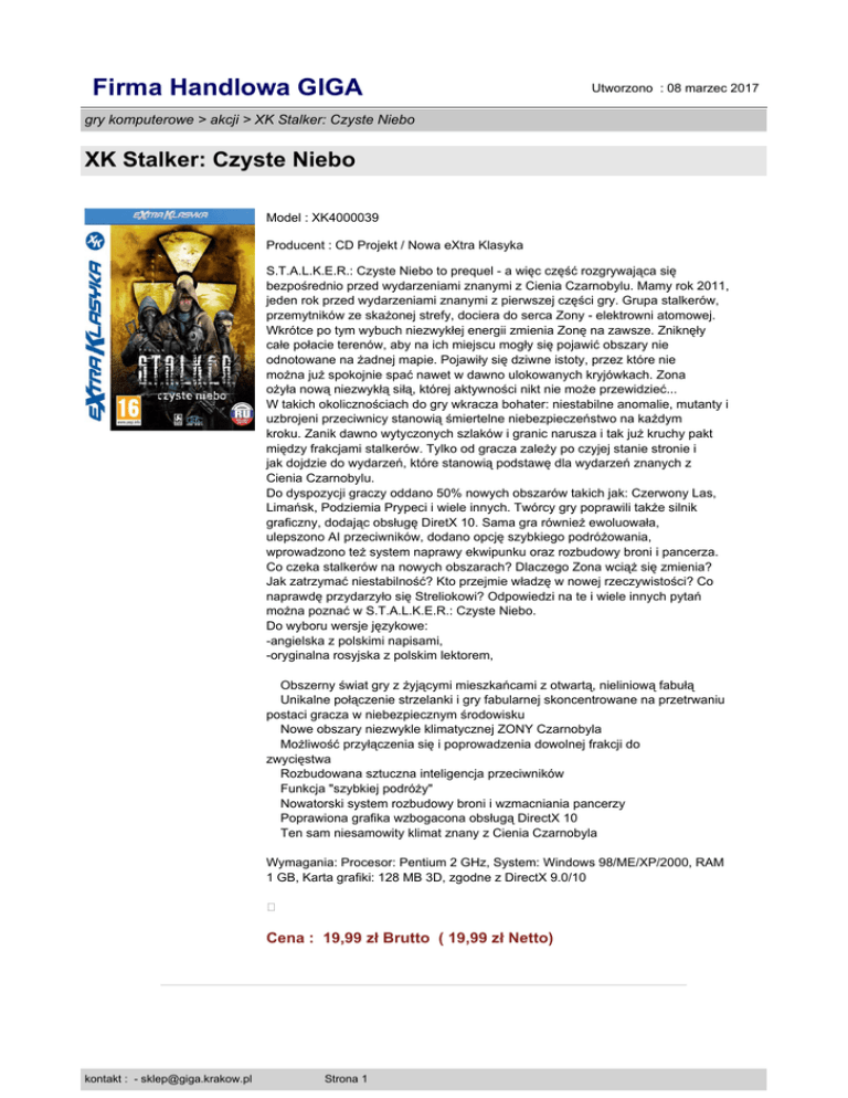 Firma Handlowa GIGA Utworzono : 08 marzec 2017 gry komputerowe > akcji > XK Stalker: Czyste Niebo XK Stalker: Czyste Niebo Model : XK4000039 Producent : CD Projekt / Nowa eXtra Klasyka S.T.A.L.K.E.R.: Czyste Niebo to prequel - a więc część rozgrywająca się bezpośrednio przed wydarzeniami znanymi z Cienia Czarnobylu. Mamy rok 2011, jeden rok przed wydarzeniami znanymi z pierwszej części gry. Grupa stalkerów, przemytników ze skażonej strefy, dociera do serca Zony - elektrowni atomowej. Wkrótce po tym wybuch niezwykłej energii zmienia Zonę na zawsze. Zniknęły całe połacie terenów, aby na ich miejscu mogły się pojawić obszary nie odnotowane na żadnej mapie. Pojawiły się dziwne istoty, przez które nie można już spokojnie spać nawet w dawno ulokowanych kryjówkach. Zona ożyła nową niezwykłą siłą, której aktywności nikt nie może przewidzieć... W takich okolicznościach do gry wkracza bohater: niestabilne anomalie, mutanty i uzbrojeni przeciwnicy stanowią śmiertelne niebezpieczeństwo na każdym kroku. Zanik dawno wytyczonych szlaków i granic narusza i tak już kruchy pakt między frakcjami stalkerów. Tylko od gracza zależy po czyjej stanie stronie i jak dojdzie do wydarzeń, które stanowią podstawę dla wydarzeń znanych z Cienia Czarnobylu. Do dyspozycji graczy oddano 50% nowych obszarów takich jak: Czerwony Las, Limańsk, Podziemia Prypeci i wiele innych. Twórcy gry poprawili także silnik graficzny, dodając obsługę DiretX 10. Sama gra również ewoluowała, ulepszono AI przeciwników, dodano opcję szybkiego podróżowania, wprowadzono też system naprawy ekwipunku oraz rozbudowy broni i pancerza. Co czeka stalkerów na nowych obszarach? Dlaczego Zona wciąż się zmienia? Jak zatrzymać niestabilność? Kto przejmie władzę w nowej rzeczywistości? Co naprawdę przydarzyło się Streliokowi? Odpowiedzi na te i wiele innych pytań można poznać w S.T.A.L.K.E.R.: Czyste Niebo. Do wyboru wersje językowe: -angielska z polskimi napisami, -oryginalna rosyjska z polskim lektorem, Obszerny świat gry z żyjącymi mieszkańcami z otwartą, nieliniową fabułą Unikalne połączenie strzelanki i gry fabularnej skoncentrowane na przetrwaniu postaci gracza w niebezpiecznym środowisku Nowe obszary niezwykle klimatycznej ZONY Czarnobyla Możliwość przyłączenia się i poprowadzenia dowolnej frakcji do zwycięstwa Rozbudowana sztuczna inteligencja przeciwników Funkcja "szybkiej podróży" Nowatorski system rozbudowy broni i wzmacniania pancerzy Poprawiona grafika wzbogacona obsługą DirectX 10 Ten sam niesamowity klimat znany z Cienia Czarnobyla Wymagania: Procesor: Pentium 2 GHz, System: Windows 98/ME/XP/2000, RAM 1 GB, Karta grafiki: 128 MB 3D, zgodne z DirectX 9.0/10 � Cena : 19,99 zł Brutto ( 19,99 zł Netto) kontakt : - [email protected] Strona 1