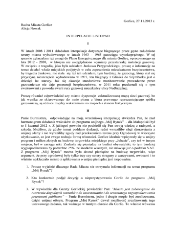 Gorlice, 27.11.2013 r. Radna Miasta Gorlice Alicja Nowak INTERPELACJE LISTOPAD I W latach 2008 i 2011 składałam interpelacje dotyczące biegnącego przez gęsto zaludnione tereny miasta wybudowanego w latach 1963 – 1965 gazociągu wysokoprężnego. W tej sprawie zgłaszałam też uwagi do Planu Energetycznego dla miasta Gorlice, opracowanego na lata 2012 - 2030, w którym nie uwzględniono wymiany przestarzałej instalacji gazowej. W związku z tragedią, jaka była udziałem Jankowa Przygrodzkiego, proszę o informację na temat działań władz miejskich podjętych w celu zapewnienia mieszkańcom bezpieczeństwa, by tragedia Jankowa, nie stała się też ich udziałem, tym bardziej, że gazociąg, który stał się przyczyną nieszczęścia wybudowano w 1973, ten biegnący z Glinika do Szymbarku jest o dziesięć lat starszy. Jak się okazuje standardowe monitorowanie prowadzone przez gazownictwo nie daje gwarancji bezpieczeństwa, w 2011 roku przekonali się o tym ewakuowani z powodu awarii rury gazowej mieszkańcy ulicy Nadbrzeżnej. Proszę również odpowiedzieć czy miasto dysponuje zaktualizowaną mapą sieci gazowej, bo jak wynika ze skierowanego do mnie pisma z biura prawnego reprezentującego spółkę gazowniczą, są różnice między wskazaniami na mapach a stanem faktycznym. II Panie Burmistrzu, odpowiadając na moją wrześniową interpelację stwierdza Pan, że znał harmonogram składania wniosków do programu unijnego „Mój Rynek” - dla Małopolski był to I kwartał 2012 r. Z jakiegoś powodu nie podzielił się Pan swoją wiedzą z radnymi, a szkoda. Możliwe, że gdyby temat poddano dyskusji, radni wyraziliby chęć skorzystania z unijnej oferty i nie wyraziliby zgody nad przekazaniem terenu przy Ogrodowej w wieczyste użytkowanie, co jest swego rodzaju formą własności. Gorlice idealnie wpisywały się w unijny program i milion złotych na budowę targowiska miejskiego przy „Juhasie”, czy też w innym miejscu, był w zasięgu ręki. Znalazły się pieniądze na budżet obywatelski, to tym bardziej wygospodarowano by potrzebne 25% ze środków własnych, nie mówiąc już o podatku VAT. Z programu „Mój Rynek” można było dostać pieniądze na budowę targowiska, więc argument, że przy ogrodowej były tylko trzy czy cztery stragany z warzywami, owocami i to właśnie wykluczało miasto z aplikowania o unijne pieniądze jest niepoważne. 1. Proszę wyjaśnić dlaczego Rada Miasta nie otrzymała informacji na temat programu „Mój Rynek”? 2. Kto konkretnie podjął decyzję o nieprzystępowaniu Gorlic do programu „Mój Rynek”? 3. W wywiadzie dla Gazety Gorlickiej powiedział Pan: ”Miasto jest zobowiązane do tworzenia dogodnych warunków do inwestowania i do sensownego zagospodarowania przestrzeni publiczne” – Panie Burmistrzu, jedno i drugie mogło być zrealizowane, dzięki unijnej ofercie. Program „Mój Rynek” dawał możliwość zrealizowania tego ustawowego zadania, tak ważnego w tamtym okresie dla Gorlic. To właśnie wówczas swoje stanowiska pracy tracili handlowcy z Ogrodowej, co przekładało się na dramaty wielu rodzin, skutkowało rozbicie gorlickiego handlu. I Pan, i pracownicy powołanego w tej kadencji Wydziału Promocji i Pozyskiwania Środków Zewnętrznych wiedzieliście, że była szansa wyjścia z tej trudnej, także dla radnych, sytuacji, ale nie przekazaliście informacji o projekcie, z którego - z dobrym skutkiem - tylko w samej Małopolsce skorzystało 19 miejscowości. Proszę odpowiedzieć dlaczego nie poinformowano Rady Miasta o możliwości otrzymania pieniędzy zewnętrznych, tylko przedstawiono w grudniu pod głosowanie uchwałę dającą zgodę na oddanie atrakcyjnego inwestycyjnie terenu przy Ogrodowej w użytkowanie wieczyste? . III W kontekście nie przystąpienia Gorlic do projektu „Mój Rynek” z którego można było otrzymać nawet milion złotych na budowę miejskiego targowiska z nowoczesnym zapleczem handlowym, sanitarnym i parkingami, proszę wyjaśnić na czym polega interes miasta w przypadku oddania w użytkowanie wieczyste terenu przy Ogrodowej za 854.740,00 zł, ze spłatą rozłożoną na 40 lat. W tej sprawie niewskazany był pośpiech, na rynku nieruchomości obecnie jest zastój, a jak sam Pan burmistrz wielokrotnie stwierdzał, parking znakomicie się w tym miejscu sprawdza. Myślę, że radni głosując nad dzierżawą tak atrakcyjnego inwestycyjnie terenu przy Ogrodowej nie spodziewali się takiej ceny. Za otrzymaną w przetargu sumę w Gorlicach można nabyć dom, i to płacąc gotówką. IV Proszę o informację na jakim etapie postępowania sądowego jest obecnie sprawa nieprawidłowego zbycia działek w Małastowie oraz sprawa solarów na pływalni „Fala”? Ile do tej pory miasto zaoszczędziłoby na ogrzewaniu, gdyby solary funkcjonowały zgodnie z założeniami projektu. Ile zapłacono za nadzór budowlany, który dopuścił do sytuacji, w której traci miasto i przedsiębiorca, którego projekt wygrał w przetargu. Jakie w obu sprawach poniesiono do tej pory koszty związane z toczącymi się sprawami sądowymi. VI Jaki jest poziom przygotowania gorlickich szkół na przyjęcie w nowym roku szkolnym sześciolatków? Załączniki: Interpelacja w spawie targowiska z 26 maja 2011 r. Pismo w sprawie targowiska z 12 stycznia 2012 r.