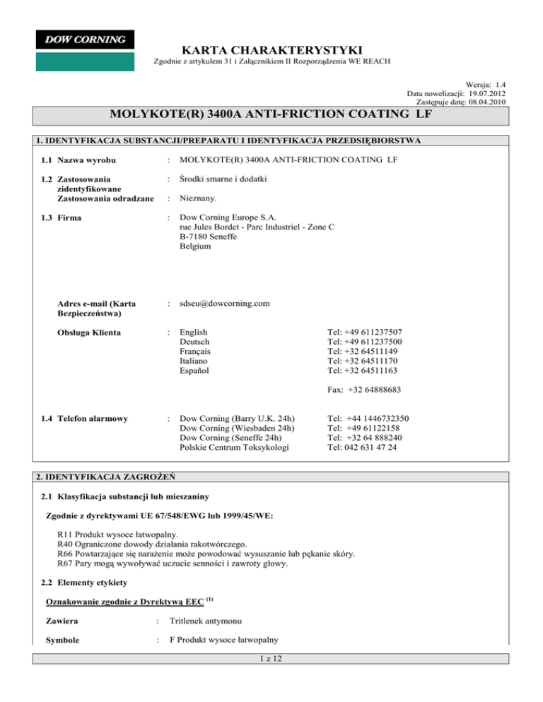 KARTA CHARAKTERYSTYKI MOLYKOTE(R) 3400A ANTI