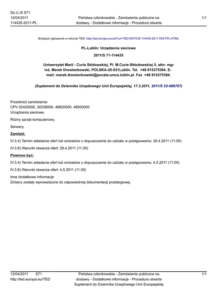 Dz.U./S S71 12/04/2011 114435-2011-PL Państwa członkowskie - Zamówienie publiczne na dostawy - Dodatkowe informacje - Procedura otwarta 1/1 Niniejsze ogłoszenie w witrynie TED: http://ted.europa.eu/udl?uri=TED:NOTICE:114435-2011:TEXT:PL:HTML PL-Lublin: Urządzenia sieciowe 2011/S 71-114435 Uniwersytet Marii - Curie Skłdowskiej, Pl. M.Curie-Skłodowskiej 5, attn: mgr inż. Marek Drewienkowski, POLSKA-20-031Lublin. Tel. +48 815375384. Email: [email protected]. Fax +48 815375384. (Suplement do Dziennika Urzędowego Unii Europejskiej, 17.3.2011, 2011/S 53-086707) Przedmiot zamówienia: CPV:32420000, 30236000, 48820000, 48000000 Urządzenia sieciowe. Różny sprzęt komputerowy. Serwery. Zamiast: IV.3.4) Termin składania ofert lub wniosków o dopuszczenie do udziału w postępowaniu: 29.4.2011 (11:00) IV.3.8) Warunki otwarcia ofert: 29.4.2011 (11:30) Powinno być: IV.3.4) Termin składania ofert lub wniosków o dopuszczenie do udziału w postępowaniu: 4.5.2011 (11:00) IV.3.8) Warunki otwarcia ofert: 4.5.2011 (11:30) Inne dodatkowe informacje Zmiany zostały wprowadzone do odpowiedniej dokumentacji przetargowej. 12/04/2011 S71 http://ted.europa.eu/TED Państwa członkowskie - Zamówienie publiczne na dostawy - Dodatkowe informacje - Procedura otwarta Suplement do Dziennika Urzędowego Unii Europejskiej 1/1