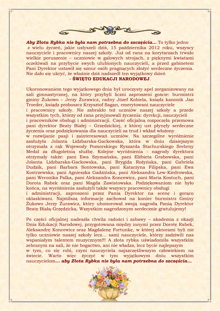 Aby Złota Rybka nie była nam potrzebna do szczęścia… To tylko jedno z wielu życzeń, jakie usłyszeli dziś, 15 października 2012 roku, wszyscy nauczyciele i pracownicy naszej szkoły. Już od rana na korytarzach trwało wielkie poruszenie – uczniowie w galowych strojach, z pięknymi kwiatami oczekiwali na przybycie swych ulubionych nauczycieli, a przed gabinetem Pani Dyrektor ustawił się sznur osób pragnących złożyć serdeczne życzenia. Nie dało się ukryć, że właśnie dziś nadszedł ten wyjątkowy dzień – ŚWIĘTO EDUKACJI NARODOWEJ. Ukoronowaniem tego wyjątkowego dnia był uroczysty apel zorganizowany na sali gimnastycznej, na który przybyli liczni zaproszeni goście: burmistrz gminy Żukowo – Jerzy Żurawicz, radny Józef Kobiela, ksiądz kanonik Jan Troeder, ksiądz proboszcz Krzysztof Sagan, emerytowani nauczyciele i pracownicy szkoły. Nie zabrakło też uczniów naszej szkoły a przede wszystkim tych, którzy od rana przyjmowali życzenia: dyrekcji, nauczycieli i pracowników obsługi i administracji. Część oficjalną rozpoczęła przemowa pani dyrektor Beaty Białej – Grzędzickiej, z której ust płynęły serdeczne życzenia oraz podziękowania dla nauczycieli za trud i wkład włożony w rozwijanie pasji i zainteresowań uczniów. Na szczególne wyróżnienie zasłużyła Jolanta Lidzbarska-Gackowska, która w dniu dzisiejszym otrzymała z rąk Wojewody Pomorskiego Ryszarda Stachurskiego Srebrny Medal za długoletnią służbę. Kolejne wyróżnienia - nagrody dyrektora otrzymały także: pani Ewa Szymańska, pani Elżbieta Grabowska, pani Jolanta Lidzbarska-Gackowska, pani Brygida Rożyńska, pani Gabriela Dudzik, pani Barbara Sontowska, pani Katarzyna Filipska, pani Ewa Kostrzewska, pani Agnieszka Gadzińska, pani Aleksandra Lew-Kiedrowska, pani Weronika Palka, pani Aleksandra Koncewicz, pani Maria Kostuch, pani Dorota Rabek oraz pani Magda Zawistowska. Podziękowaniom nie było końca, na wyróżnienia zasłużyli także wszyscy pracownicy obsługi i administracji, zaproszeni przez Panią Dyrektor na scenę i gorąco oklaskiwani. Najmilszą informację zachował na koniec burmistrz Gminy Żukowo Jerzy Żurawicz, który uhonorował swoją nagrodą Panią Dyrektor Beatę Białą-Grzędzicką. Wszystkim nagrodzonym serdecznie gratulujemy! Po części oficjalnej nadeszła chwila radości i zabawy – akademia z okazji Dnia Edukacji Narodowej, przygotowana między innymi przez Dorotę Rabek, Aleksandrę Koncewicz oraz Magdalenę Fortunkę, w której aktorami byli nie tylko uczniowie naszej szkoły lecz… sami nauczyciele, którzy zadziwili nas wspaniałym talentem muzycznym!!! A złota rybka uświadomiła wszystkim zebranym na sali, że nie bogactwo, ani nie władza, lecz bycie najlepszym w tym, co się robi, czyni nauczyciela najszczęśliwszym człowiekiem na świecie. Warto więc życzyć w tym wyjątkowym dniu wszystkim nauczycielom… aby Złota Rybka nie była nam potrzebna do szczęścia…