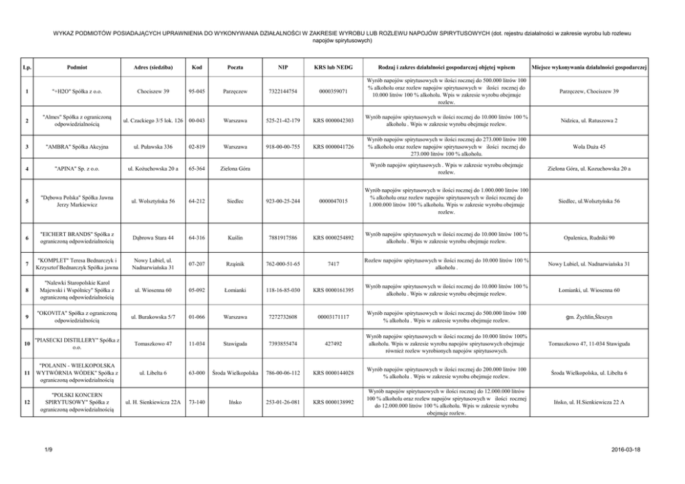 WYKAZ PODMIOTÓW POSIADAJĄCYCH UPRAWNIENIA DO WYKONYWANIA DZIAŁALNOŚCI W ZAKRESIE WYROBU LUB ROZLEWU NAPOJÓW SPIRYTUSOWYCH (dot. rejestru działalności w zakresie wyrobu lub rozlewu napojów spirytusowych) Lp. Podmiot Adres (siedziba) Kod Poczta NIP KRS lub NEDG Rodzaj i zakres działalności gospodarczej objętej wpisem Miejsce wykonywania działalności gospodarczej Parzęczew, Chociszew 39 1 "+H2O" Spółka z o.o. Chociszew 39 95-045 Parzęczew 7322144754 0000359071 Wyrób napojów spirytusowych w ilości rocznej do 500.000 litrów 100 % alkoholu oraz rozlew napojów spirytusowych w ilości rocznej do 10.000 litrów 100 % alkoholu. Wpis w zakresie wyrobu obejmuje rozlew. 2 "Almes" Spółka z ograniczoną odpowiedzialnością ul. Czackiego 3/5 lok. 126 00-043 Warszawa 525-21-42-179 KRS 0000042303 Wyrób napojów spirytusowych w ilości rocznej do 10.000 litrów 100 % alkoholu . Wpis w zakresie wyrobu obejmuje rozlew. Nidzica, ul. Ratuszowa 2 3 "AMBRA" Spółka Akcyjna ul. Puławska 336 02-819 Warszawa 918-00-00-755 KRS 0000041726 Wyrób napojów spirytusowych w ilości rocznej do 273.000 litrów 100 % alkoholu oraz rozlew napojów spirytusowych w ilości rocznej do 273.000 litrów 100 % alkoholu. Wola Duża 45 4 "APINA" Sp. z o.o. ul. Kożuchowska 20 a 65-364 Zielona Góra Wyrób napojów spirytusowych . Wpis w zakresie wyrobu obejmuje rozlew. Zielona Góra, ul. Kozuchowska 20 a 5 "Dębowa Polska" Spółka Jawna Jerzy Markiewicz ul. Wolsztyńska 56 64-212 Siedlec 923-00-25-244 0000047015 Wyrób napojów spirytusowych w ilości rocznej do 1.000.000 litrów 100 % alkoholu oraz rozlew napojów spirytusowych w ilości rocznej do 1.000.000 litrów 100 % alkoholu. Wpis w zakresie wyrobu obejmuje rozlew. Siedlec, ul.Wolsztyńska 56 6 "EICHERT BRANDS" Spółka z ograniczoną odpowiedzialnością Dąbrowa Stara 44 64-316 Kuślin 7881917586 KRS 0000254892 Wyrób napojów spirytusowych w ilości rocznej do 10.000 litrów 100 % alkoholu . Wpis w zakresie wyrobu obejmuje rozlew. Opalenica, Rudniki 90 7 "KOMPLET" Teresa Bednarczyk i Krzysztof Bednarczyk Spółka jawna Nowy Lubiel, ul. Nadnarwiańska 31 07-207 Rząśnik 762-000-51-65 7417 Rozlew napojów spirytusowych w ilości rocznej do 10.000 litrów 100 % alkoholu . Nowy Lubiel, ul. Nadnarwiańska 31 8 "Nalewki Staropolskie Karol Majewski i Wspólnicy" Spółka z ograniczoną odpowiedzialnością ul. Wiosenna 60 05-092 Łomianki 118-16-85-030 KRS 0000161395 Wyrób napojów spirytusowych w ilości rocznej do 10.000 litrów 100 % alkoholu . Wpis w zakresie wyrobu obejmuje rozlew. Łomianki, ul. Wiosenna 60 9 "OKOVITA" Spółka z ograniczoną odpowiedzialnością ul. Burakowska 5/7 01-066 Warszawa 7272732608 00003171117 Wyrób napojów spirytusowych w ilości rocznej do 500.000 litrów 100 % alkoholu . Wpis w zakresie wyrobu obejmuje rozlew. gm. Żychlin,Śleszyn 10 "PIASECKI DISTILLERY" Spółka z o.o. Tomaszkowo 47 11-034 Stawiguda 7393855474 427492 Wyrób napojów spirytusowych w ilości rocznej do 10.000 litrów 100% alkoholu. Wpis w zakresie wyrobu napojów spirytusowych obejmuje również rozlew wyrobionych napojów spirytusowych. Tomaszkowo 47, 11-034 Stawiguda 11 "POLANIN - WIELKOPOLSKA WYTWÓRNIA WÓDEK" Spółka z ograniczoną odpowiedzialnością ul. Libelta 6 63-000 Środa Wielkopolska 786-00-06-112 KRS 0000144028 Wyrób napojów spirytusowych w ilości rocznej do 200.000 litrów 100 % alkoholu . Wpis w zakresie wyrobu obejmuje rozlew. Środa Wielkopolska, ul. Libelta 6 12 "POLSKI KONCERN SPIRYTUSOWY" Spółka z ograniczoną odpowiedzialnością KRS 0000138992 Wyrób napojów spirytusowych w ilości rocznej do 12.000.000 litrów 100 % alkoholu oraz rozlew napojów spirytusowych w ilości rocznej do 12.000.000 litrów 100 % alkoholu. Wpis w zakresie wyrobu obejmuje rozlew. Ińsko, ul. H.Sienkiewicza 22 A 1/9 ul. H. Sienkiewicza 22A 73-140 Ińsko 253-01-26-081 2016-03-18 WYKAZ PODMIOTÓW POSIADAJĄCYCH UPRAWNIENIA DO WYKONYWANIA DZIAŁALNOŚCI W ZAKRESIE WYROBU LUB ROZLEWU NAPOJÓW SPIRYTUSOWYCH (dot. rejestru działalności w zakresie wyrobu lub rozlewu napojów spirytusowych) Rodzaj i zakres działalności gospodarczej objętej wpisem Miejsce wykonywania działalności gospodarczej Rzeszów Wyrób napojów spirytusowych w Wytwórni Wód Stołowych . Wpis w zakresie wyrobu obejmuje rozlew. Wytwórnia Wód Stołowych w Borku Starym 04-924 Warszawa Wyrób napojów spirytusowych . Wpis w zakresie wyrobu obejmuje rozlew. Warszawa, ul. Utrata 4 Kopnica 8 76-150 Darłowo 7250004876 _ Wyrób napojów spirytusowych w ilości rocznej do 10.000 litrów 100% alkoholu. Wpis w zakresie wyrobu obejmuje rozlew. Kopnica 8 "SOBIESKI TRADE" Spółka z ograniczoną odpowiedzialnością Kołaczkowo 9 62-230 Witkowo 667-000-40-78 KRS 0000056903 Wyrób napojów spirytusowych w ilości rocznej do 10.500.000 litrów 100 % alkoholu . Wpis w zakresie wyrobu obejmuje rozlew. Działalność zawieszona. Kołaczkowo 17 "Stock Polska" Spółka z ograniczoną odpowiedzialnością ul. Spółdzielcza 6 20-402 Lublin 701-003-54-75 0000264278 Wyrób napojów spirytusowych w ilości rocznej do 50.000.000 litrów 100 % alkoholu . Wpis w zakresie wyrobu obejmuje rozlew. Lublin ul. Spółdzielcza 6 18 "VICTORIA" Spółka Akcyjna ul. Powstańców 40 21-500 Biała Podlaska 537-00-13-428 KRS: 0000202813 Wyrób napojów spirytusowych . Wyrób napojów spirytusowych w ilości rocznej do 10.000 litrów 100 % alkoholu . Wpis w zakresie wyrobu obejmuje rozlew. Biała Podlaska, ul. Powstańców 40 19 4M spólka cywilna Marcin Dobisz, Małgorzata Dobisz ul. Mała 28 44-200 Rybnik 6423184111 Wyrób napojów psirytusowych w ilosci rocznej do 10.000 litrów 100% alkoholu. Wpis w zakresie wyrobu obejmuje rozlew. Rybnik ul. Mała 28 20 AGRO-SAN Spółka z o.o. ul. Bohaterów Getta 63 37-700 Przemyśl 795-21-09-216 Wyrób napojów spirytusowych . Wpis w zakresie wyrobu obejmuje rozlew. Przemyśl, ul. Bohaterów Getta 63 Wrocław, ul. Monopolowa 4; Leszno ul. Święciechowska 2 Lp. Podmiot
